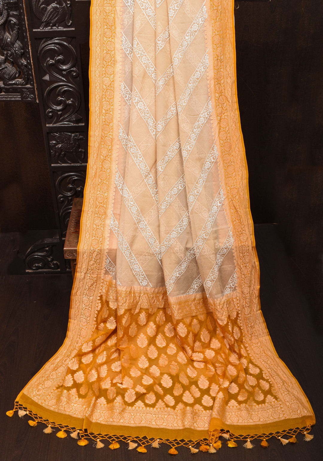 Pan: Influenced by nature, the betel leaf motif, known as Pan, is a symbol of freshness and new beginnings. Woven delicately into the fabric, it exhibits the remarkable attention to detail involved in the creation of each saree.