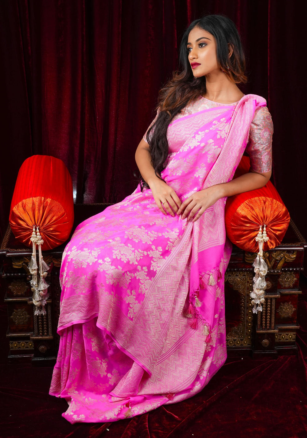 Banarasi sarees are handcrafted in the holy city of Varanasi in India and are renowned for their sheer elegance and luxurious look. What makes them special is the intricate craftsmanship with gold and silver brocade or zari and opulent embroidery. Each saree takes 15 days to six months to complete, based on the complexity of designs. The motifs are influenced by Mughal art, including floral patterns, foliate designs, and paisleys making each piece a work of art.