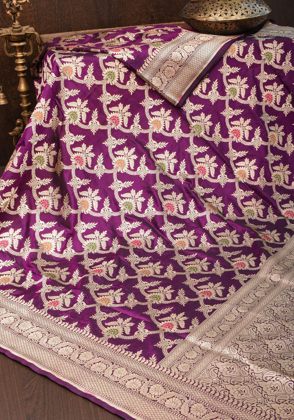 Jal: Reflecting our rich heritage, Jal is an elaborate floral design that extends across the length of the saree. Demonstrating the prowess of traditional weavers, it is one of the oldest motifs in Banarasi saree designs.
