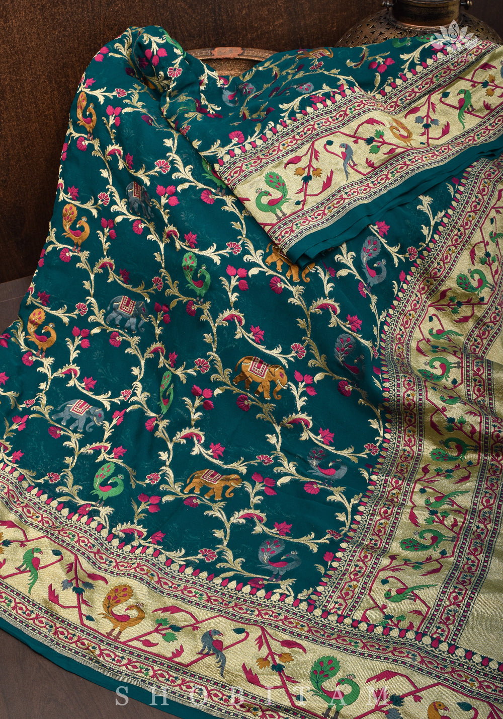 Shikargah: Featuring detailed hunting scenes, royal processions and animals, often woven in gold or silver threads, Shikargah is a regal motif that showcases our long-standing association with royalty and nobility.
