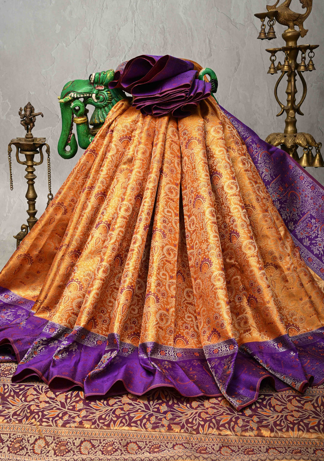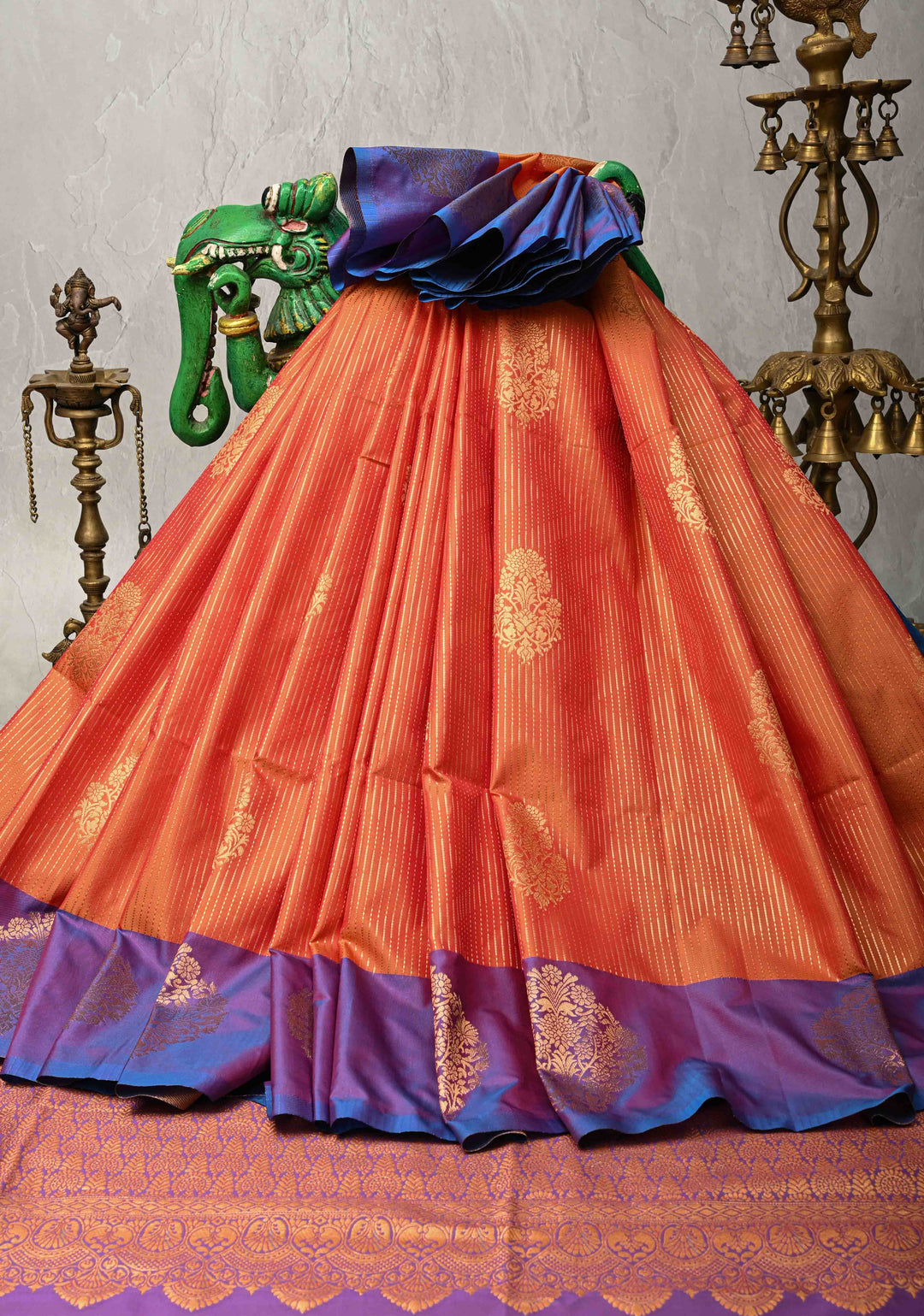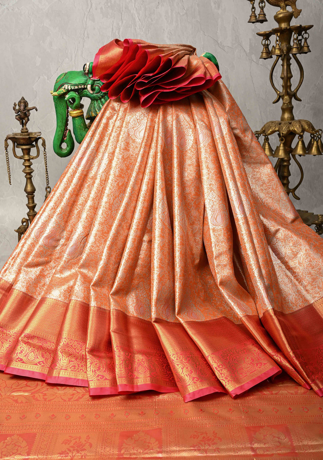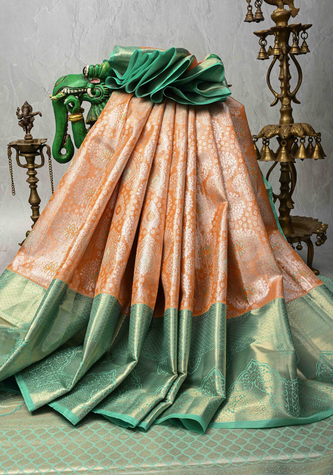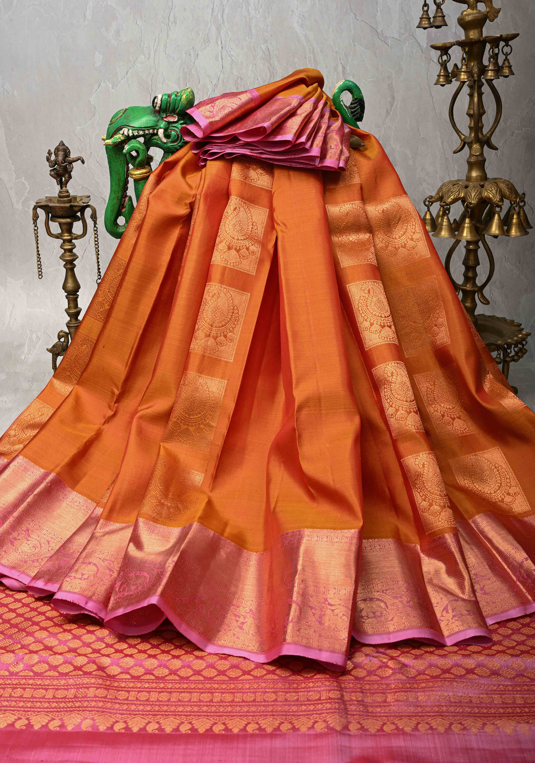 Kanjivaram orange sarees with gold borders are treasured heirlooms in South India.