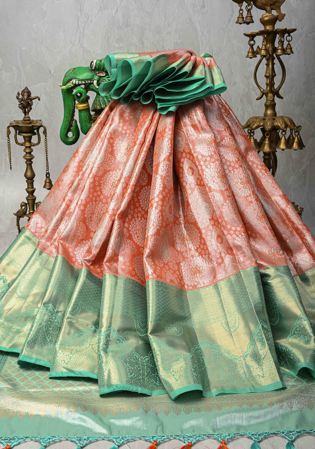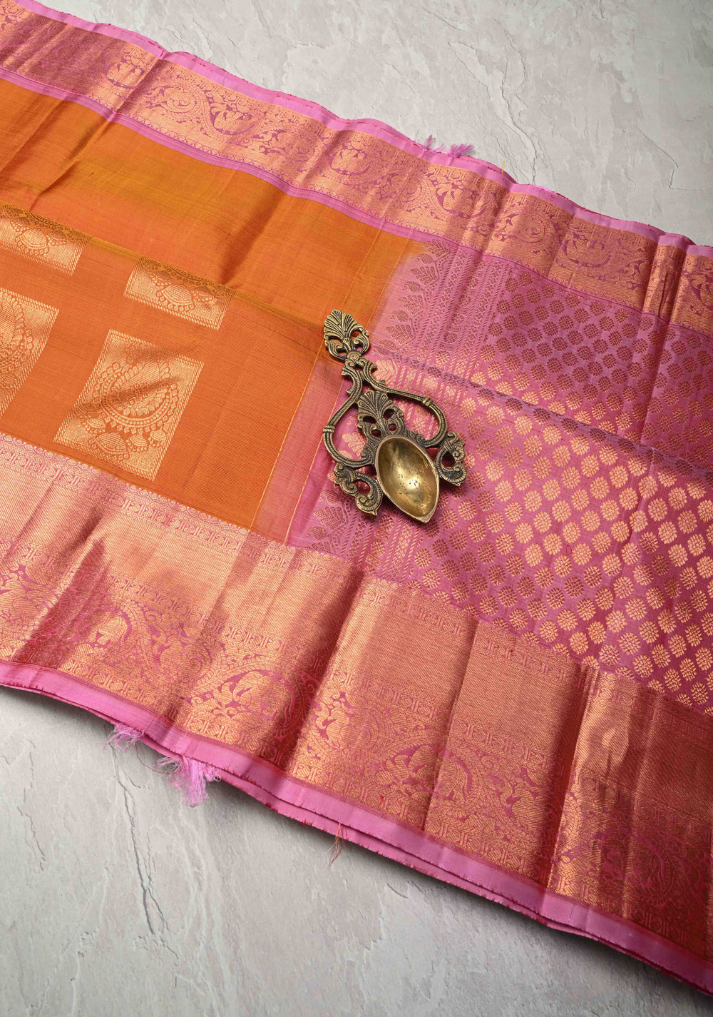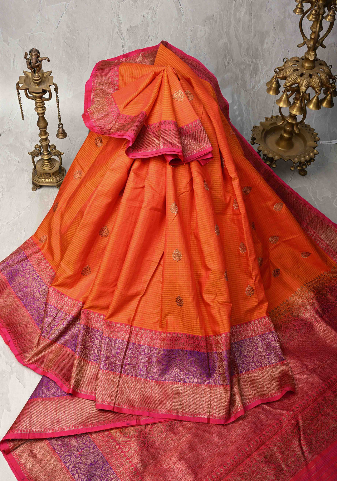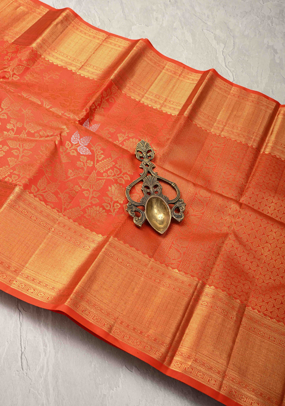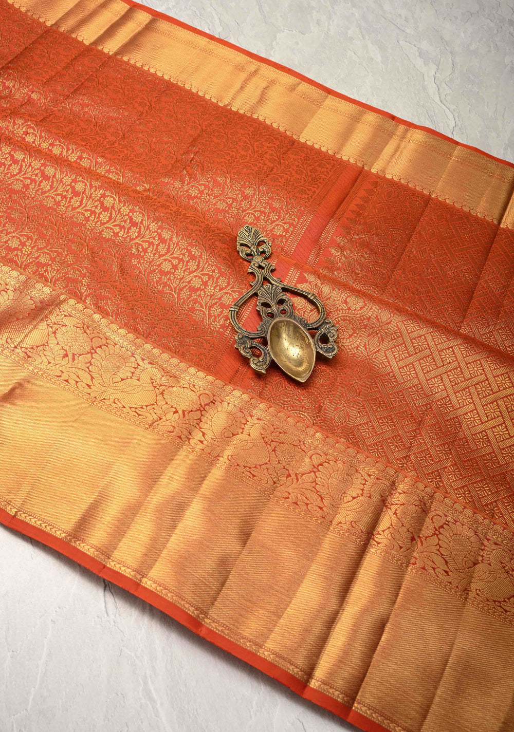 Kanjivaram orange sarees with gold borders are treasured heirlooms in South India.