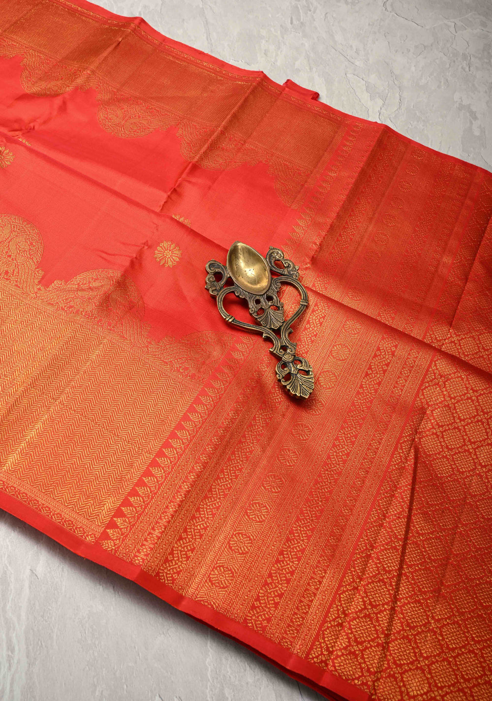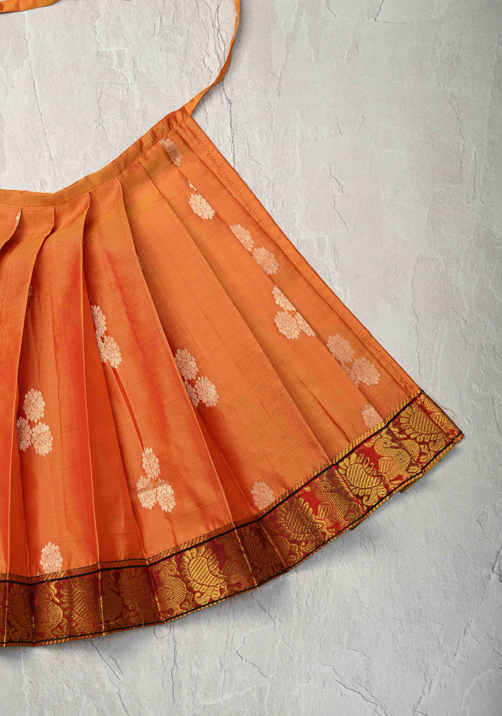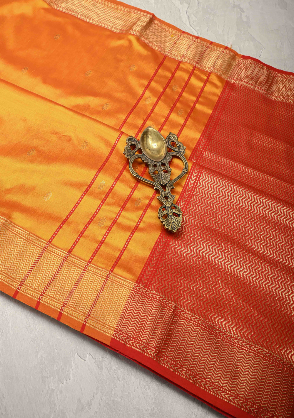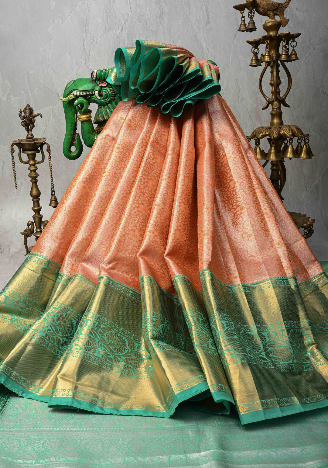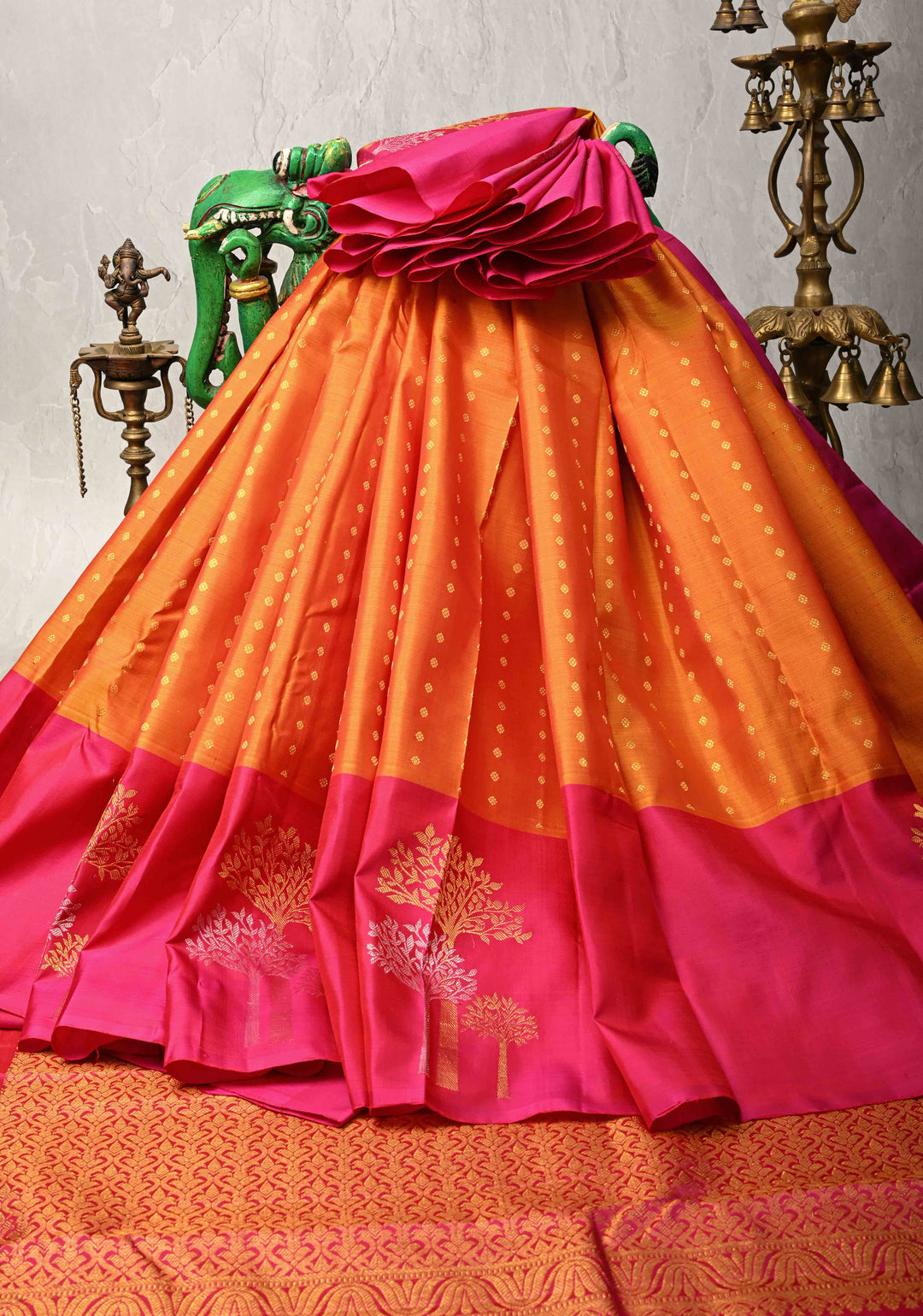 Kanjivaram orange sarees with gold borders are treasured heirlooms in South India.