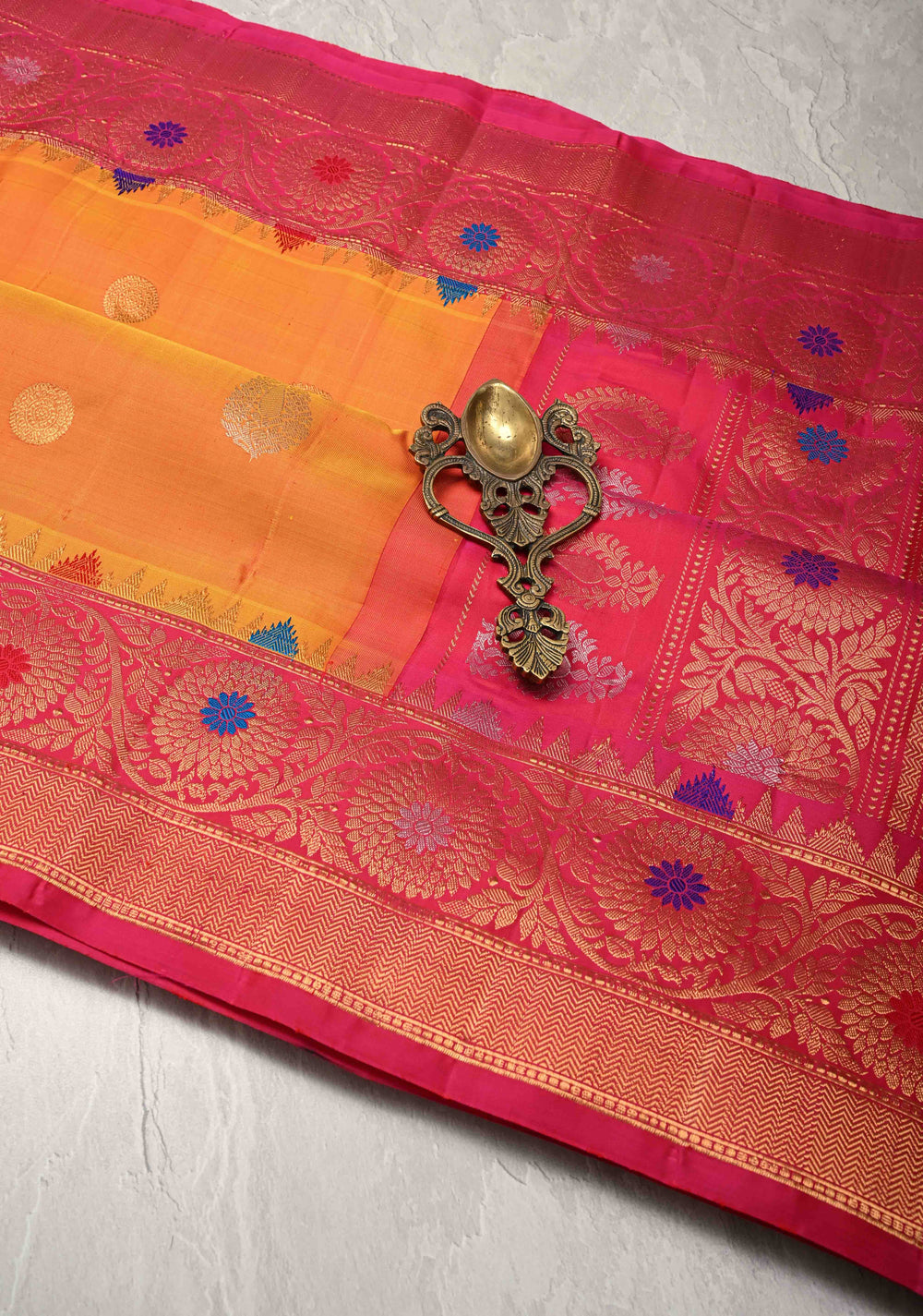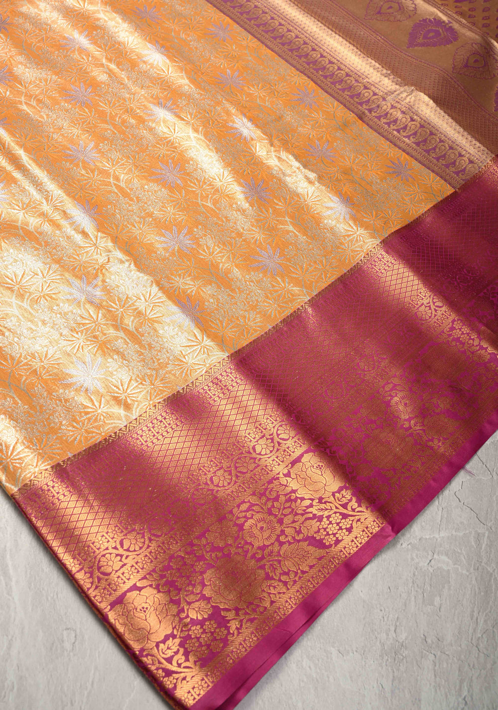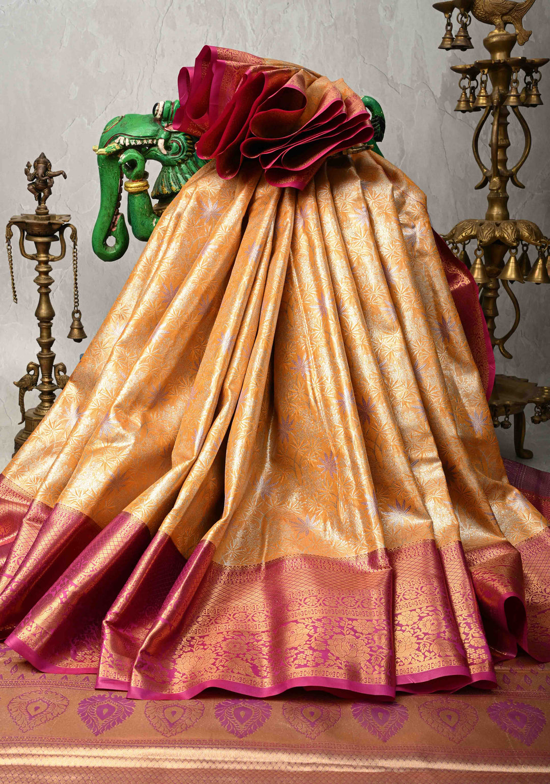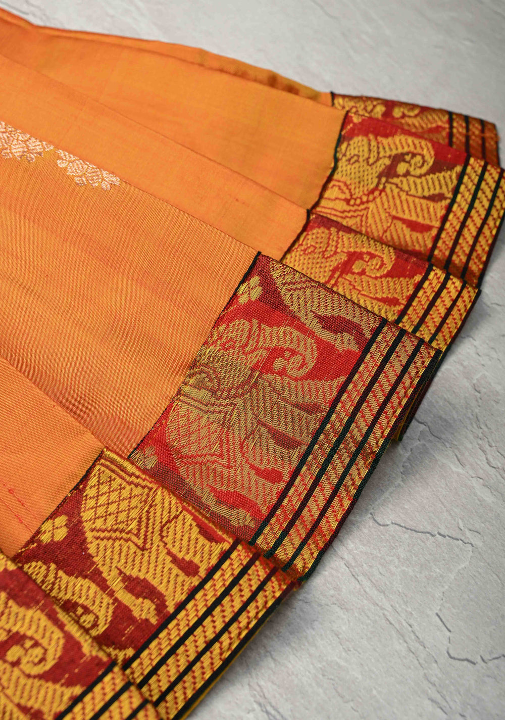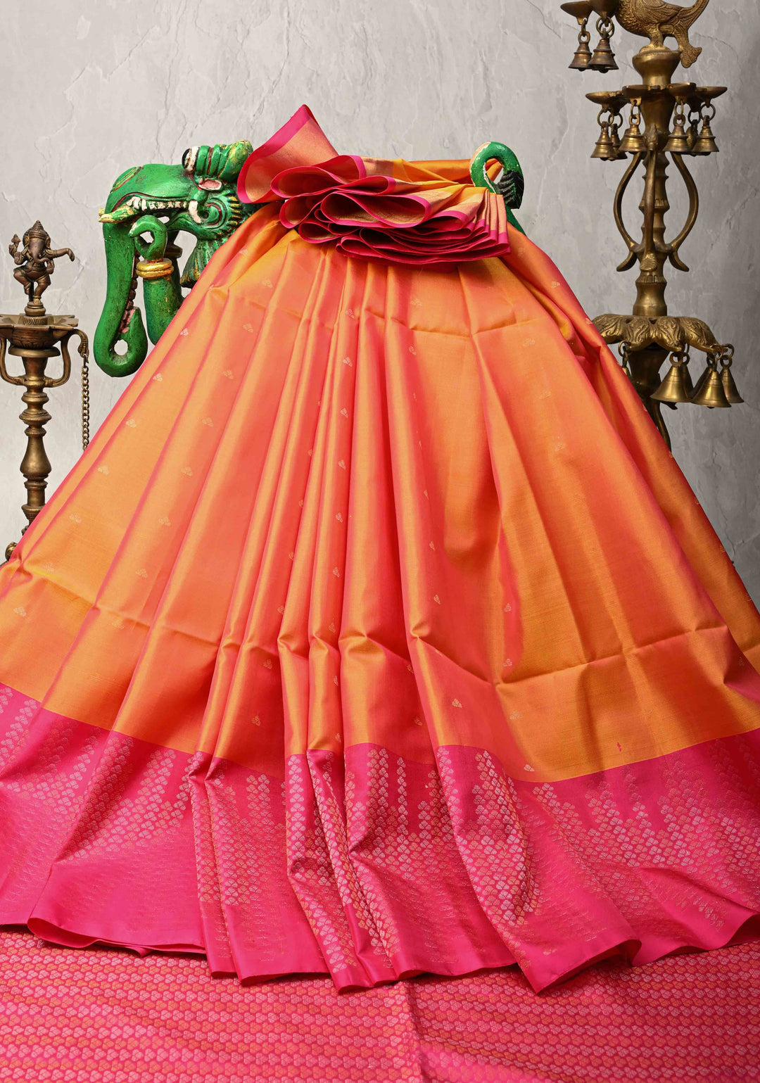 Kanjivaram orange sarees with gold borders are treasured heirlooms in South India.