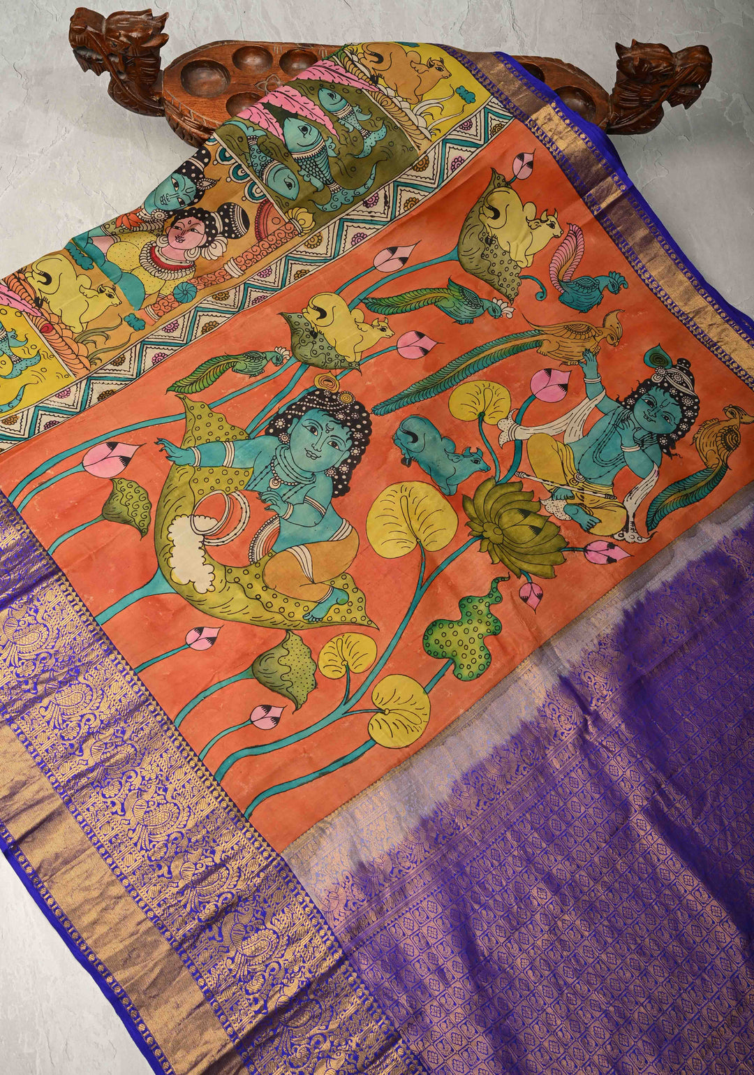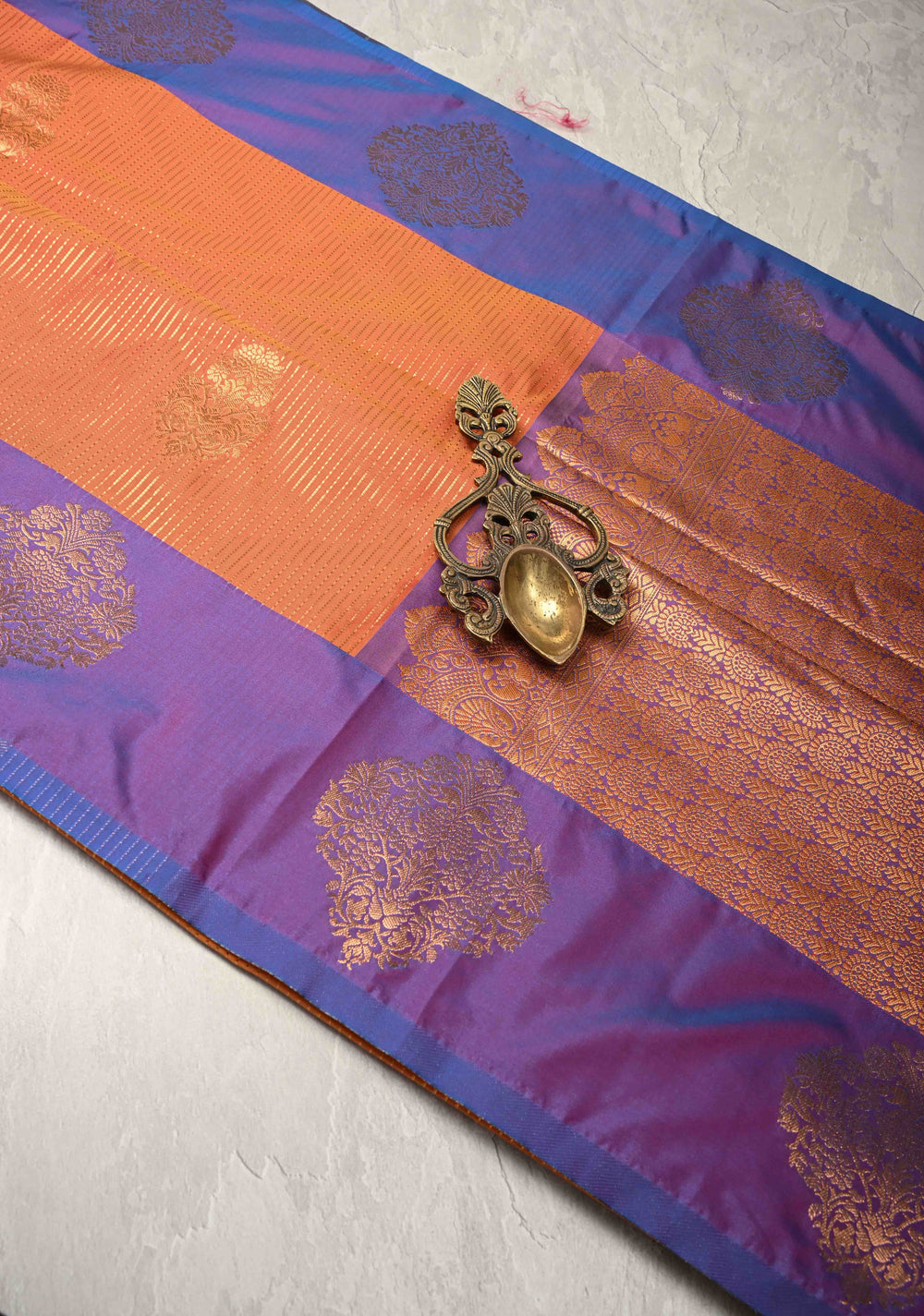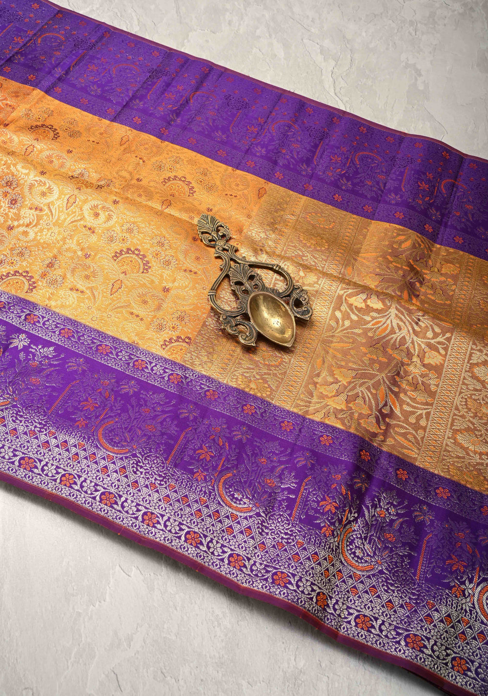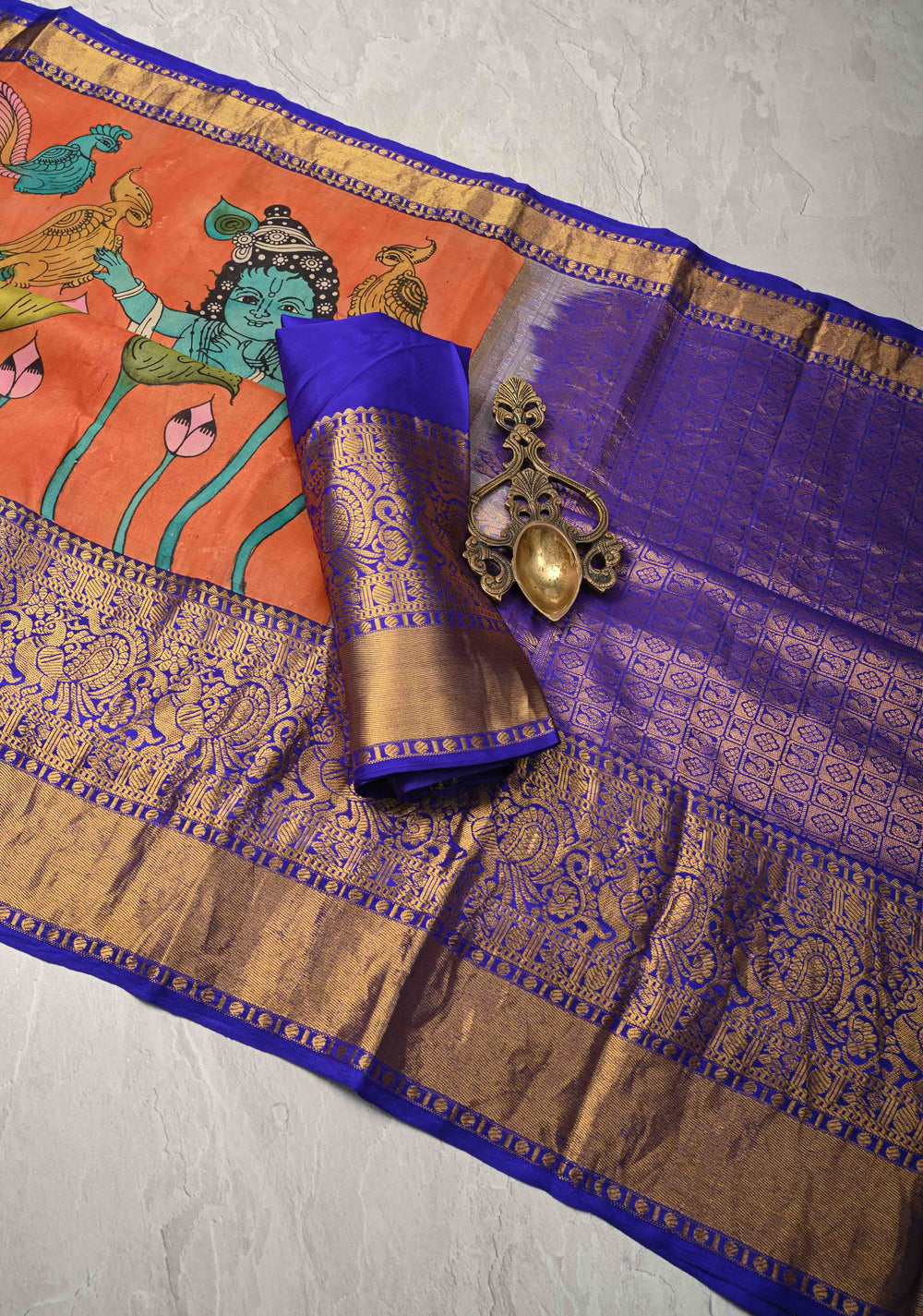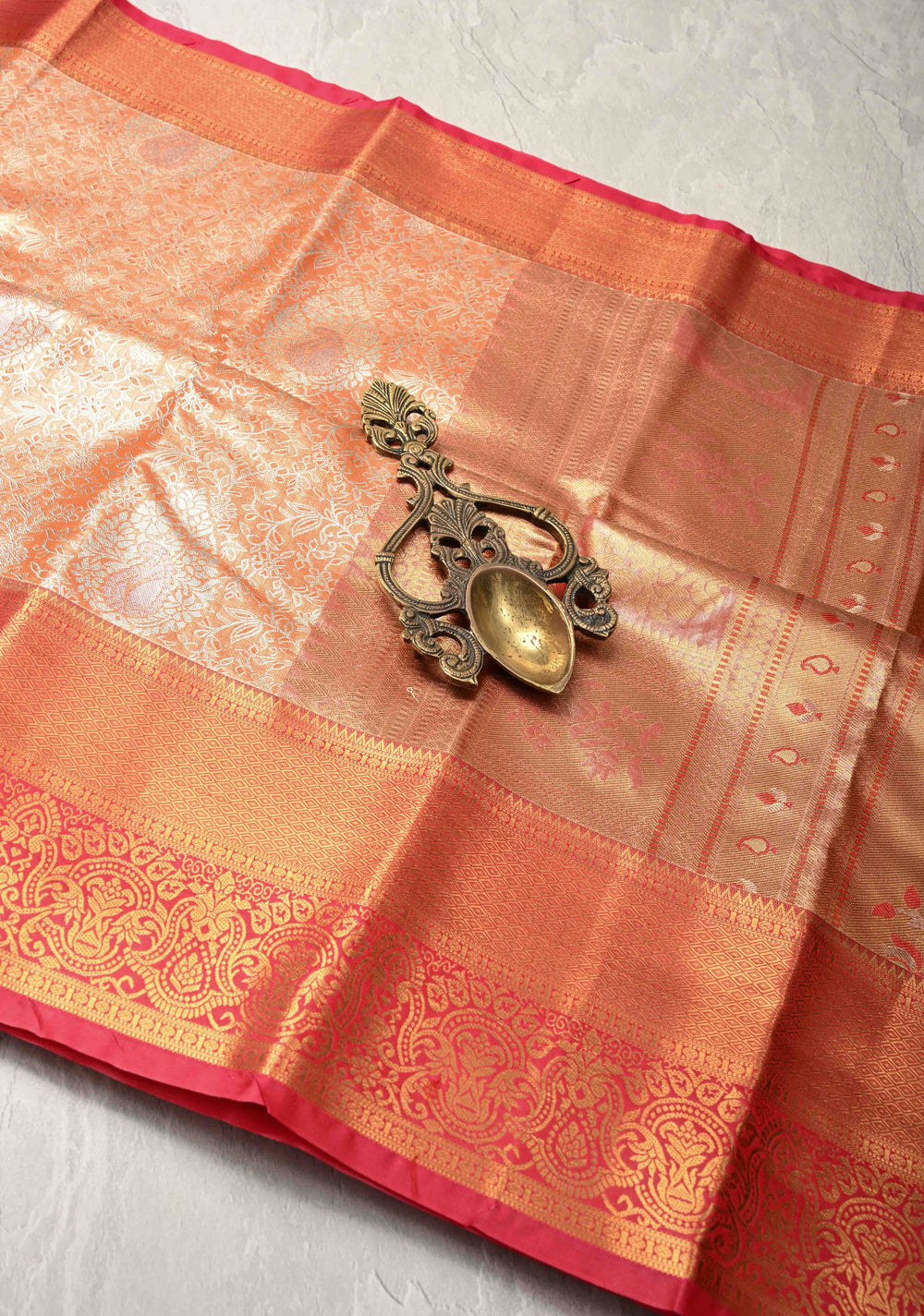 Kanjivaram orange sarees with gold borders are treasured heirlooms in South India.