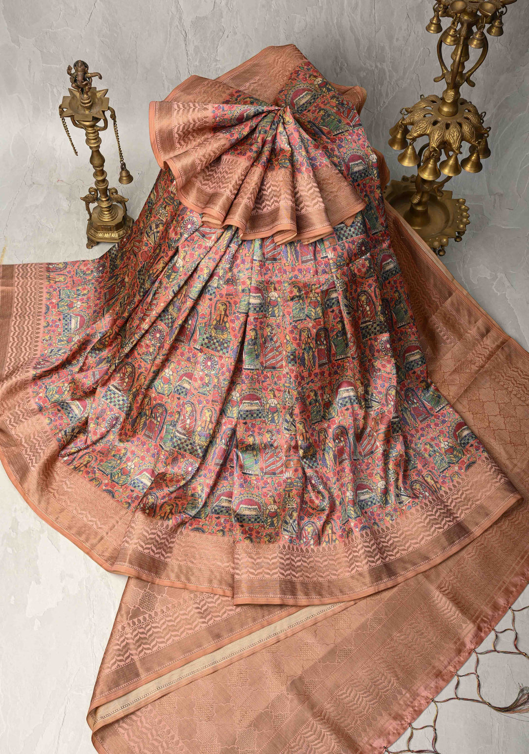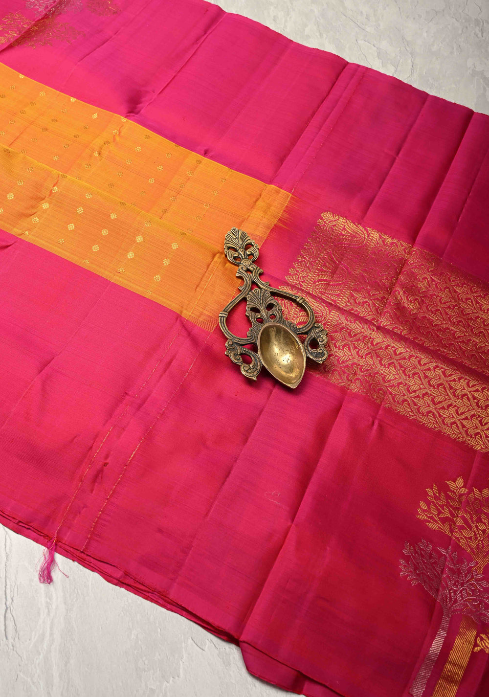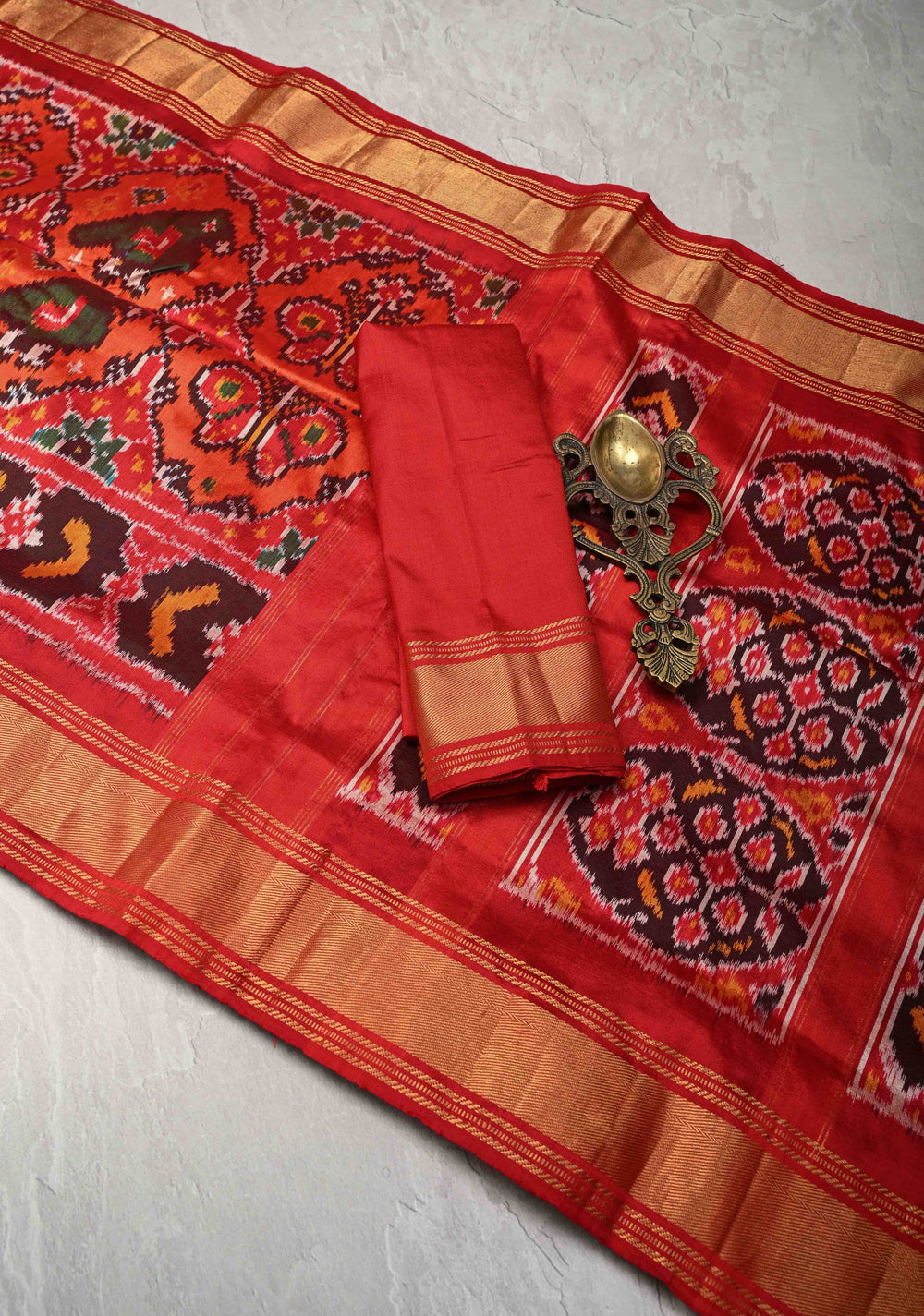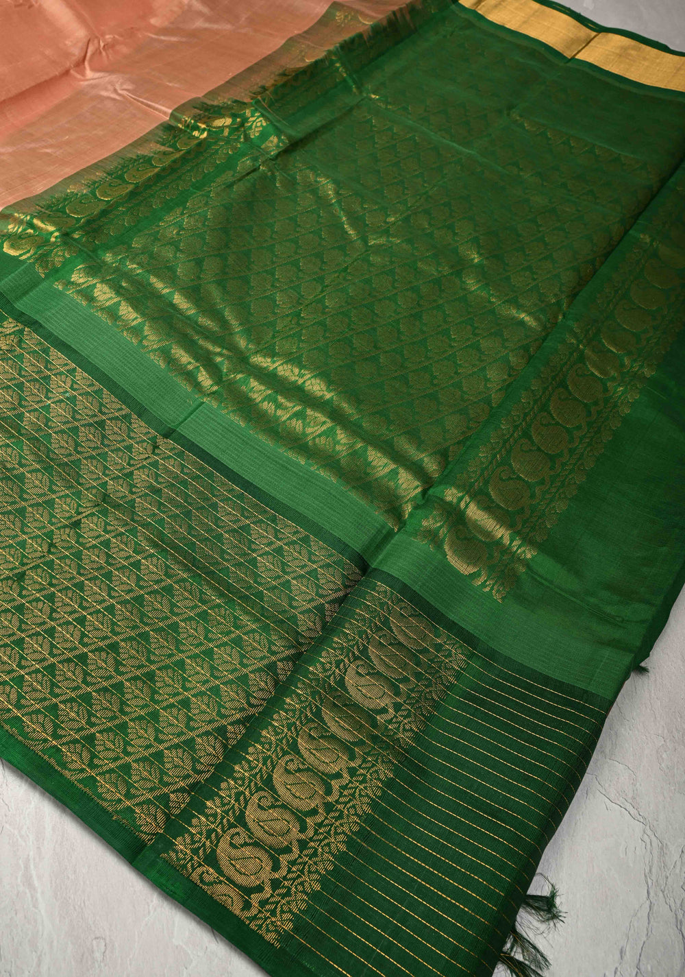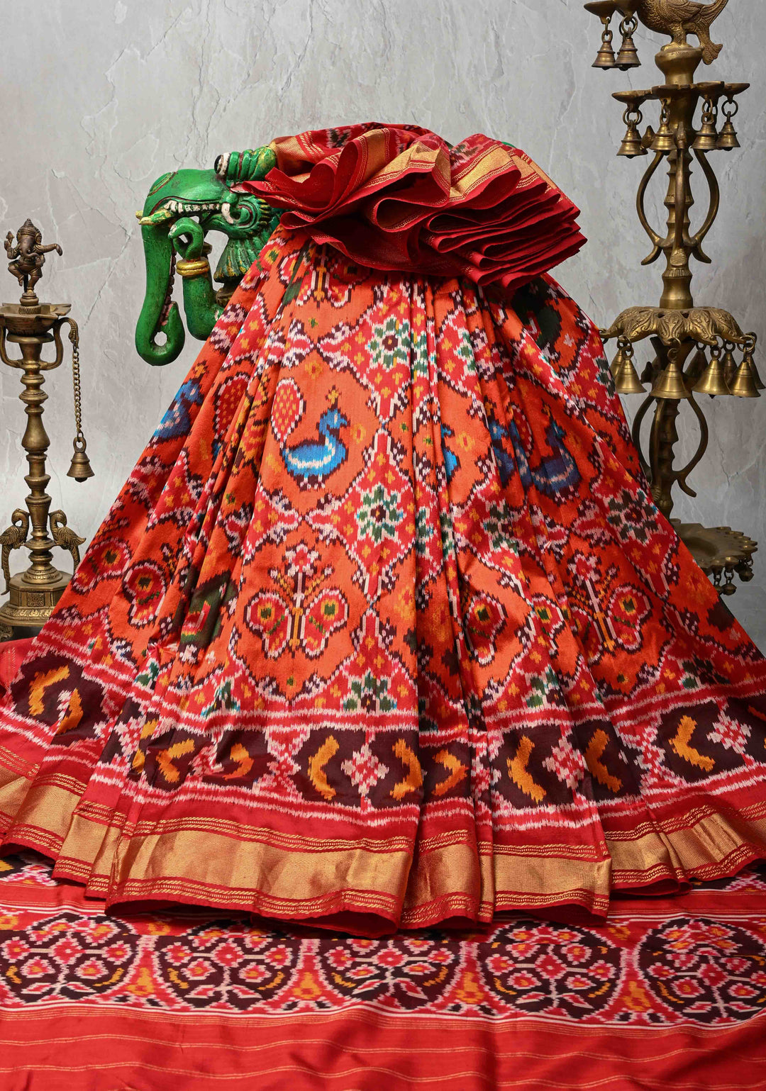 Kanjivaram orange sarees with gold borders are treasured heirlooms in South India.