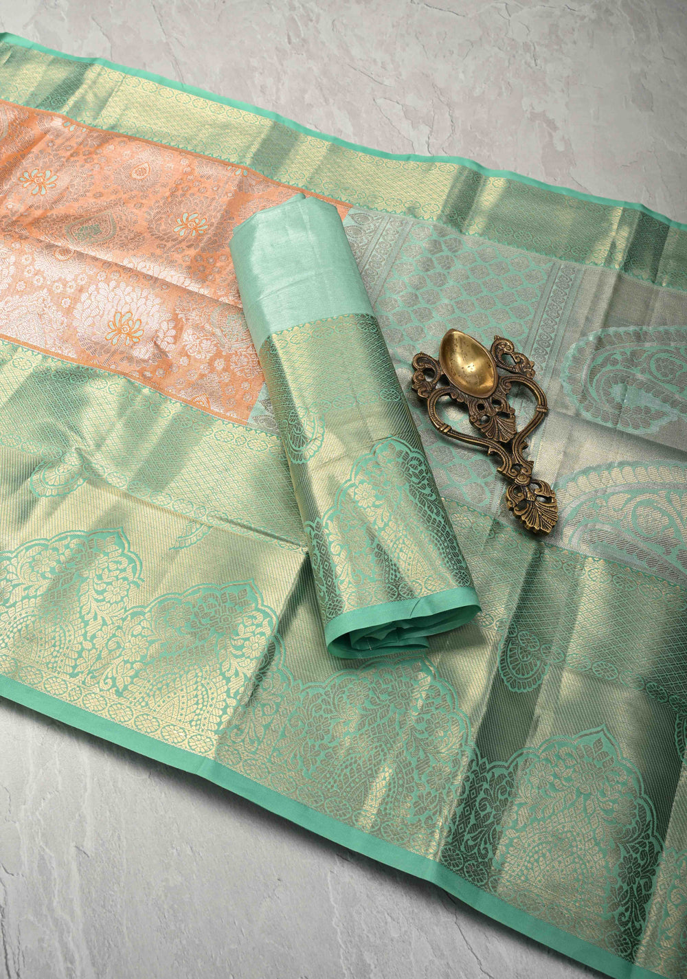 A brocade green blouse pairs beautifully with an orange Banarasi saree.