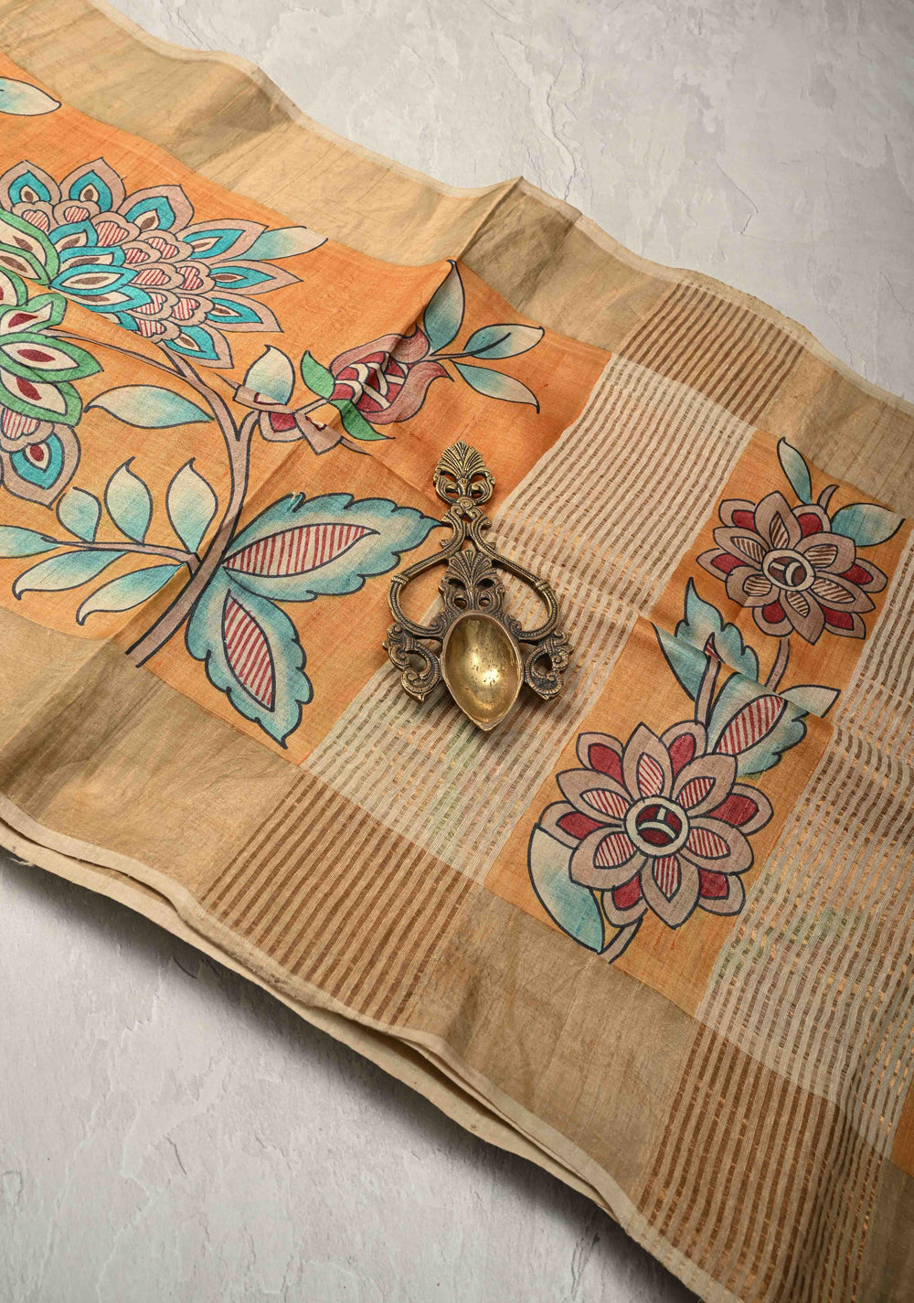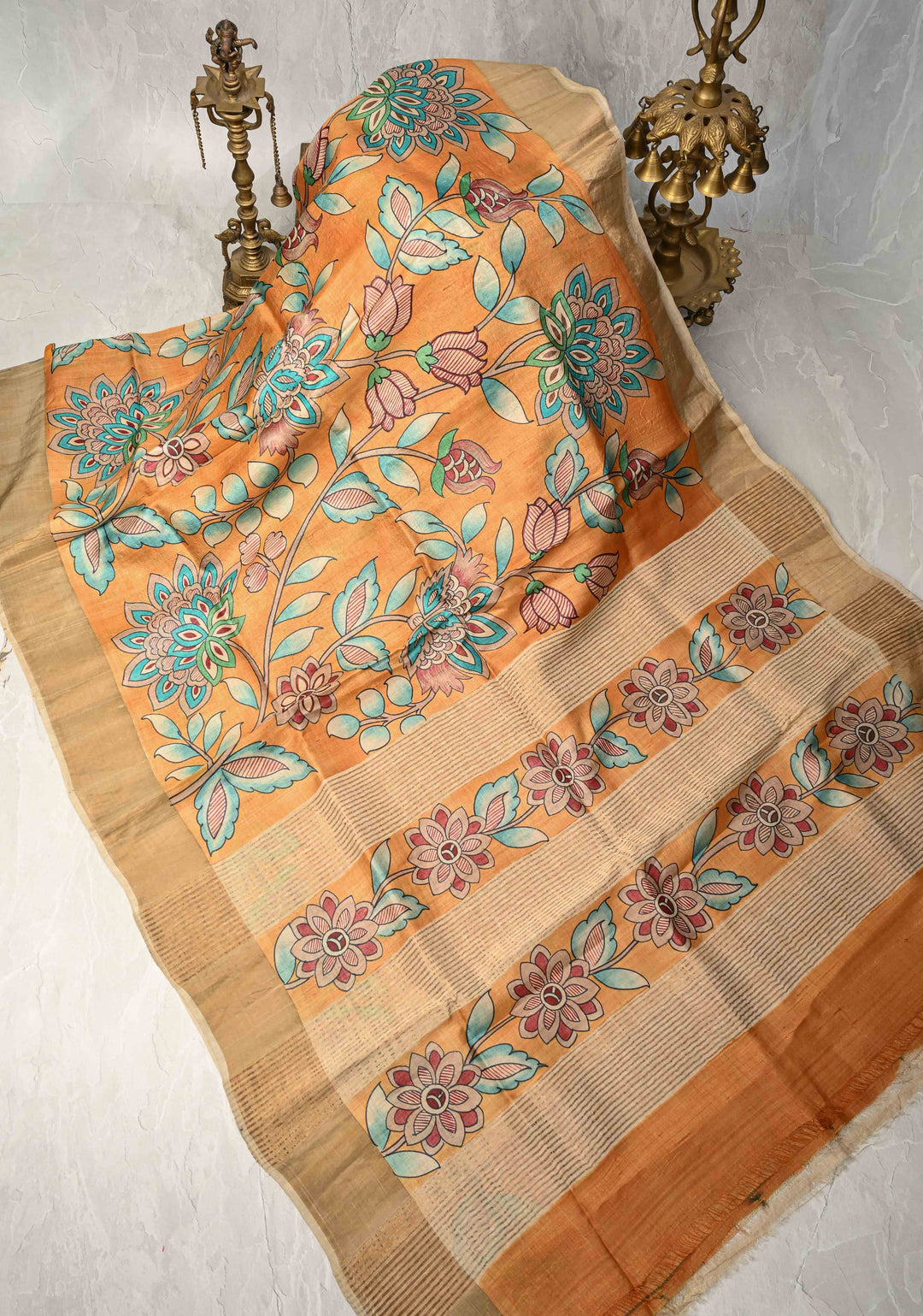 Simple handloom or printed orange sarees pair well with minimal jewelry for a relaxed look.