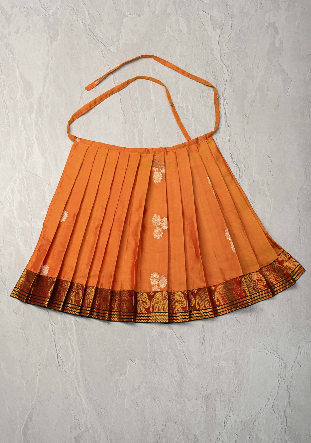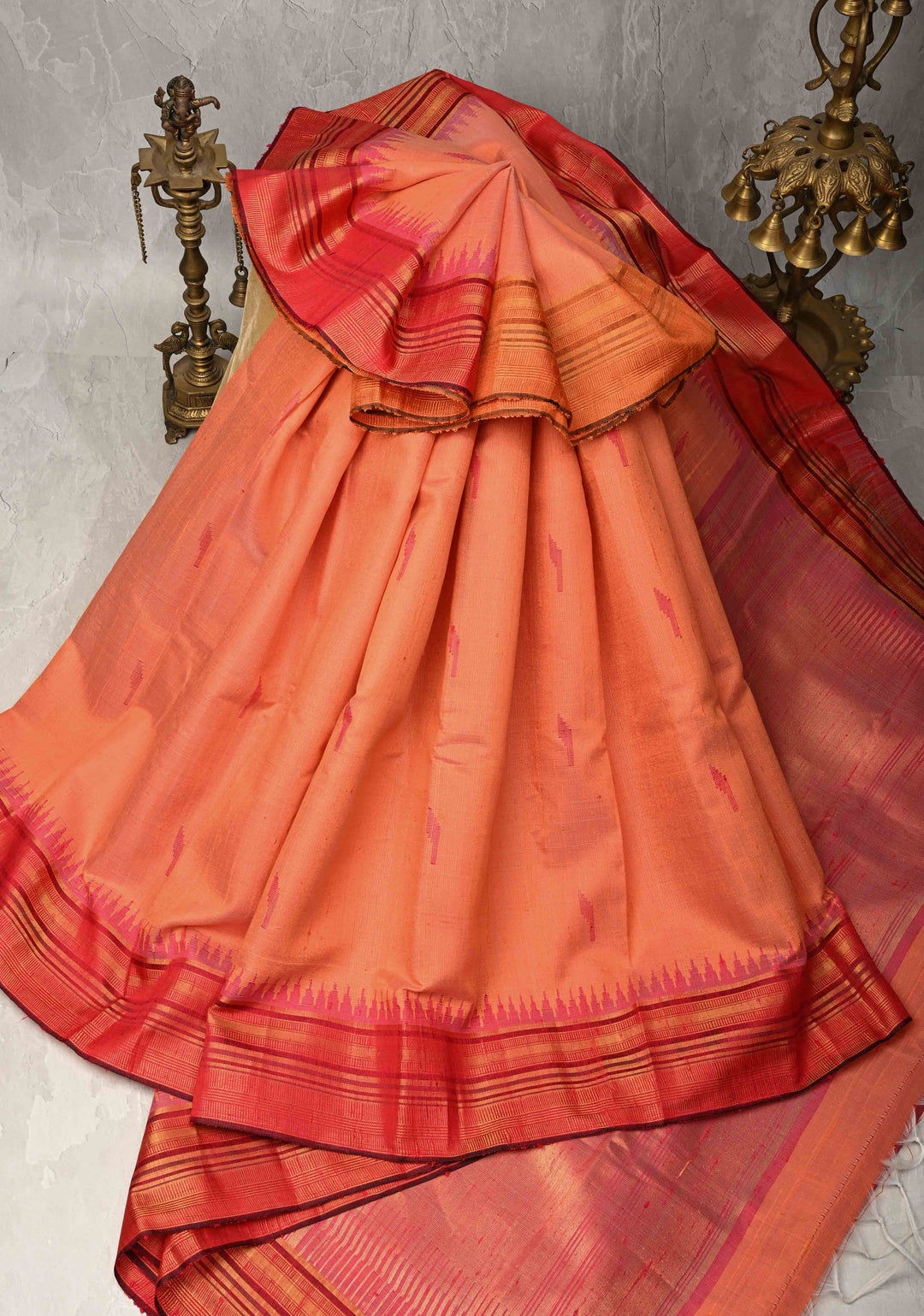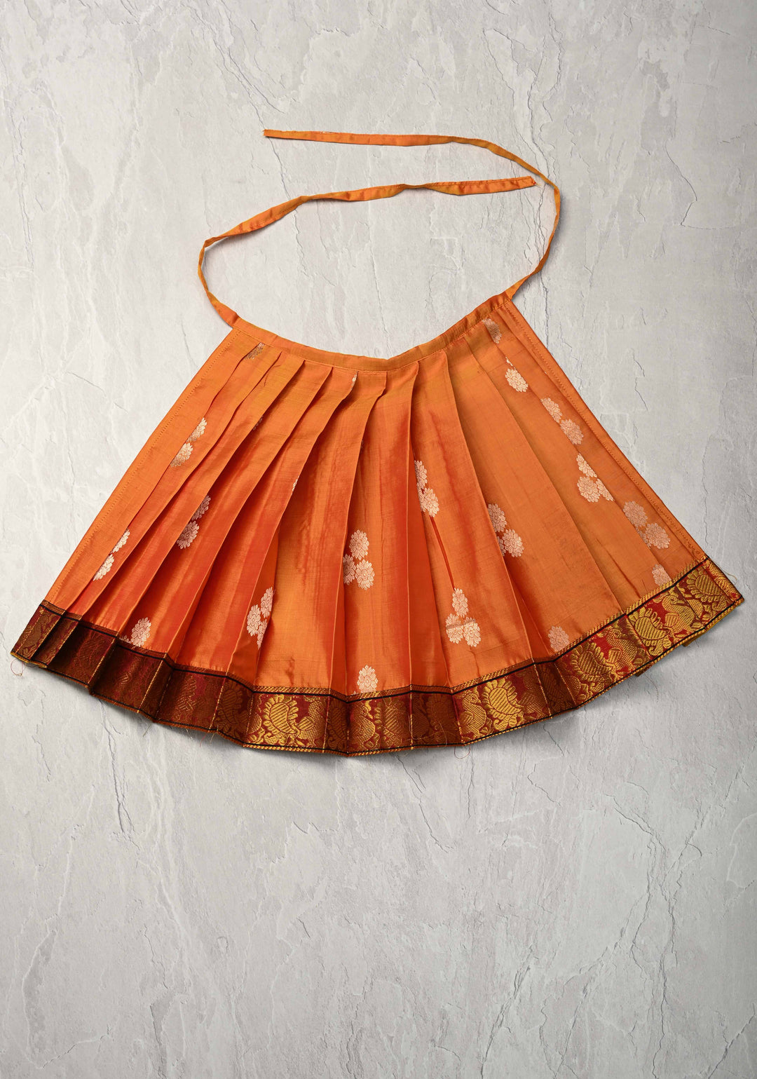 Traditional weaves like Kanjeevaram or Chanderi in orange shades are popular temple-wear choices.