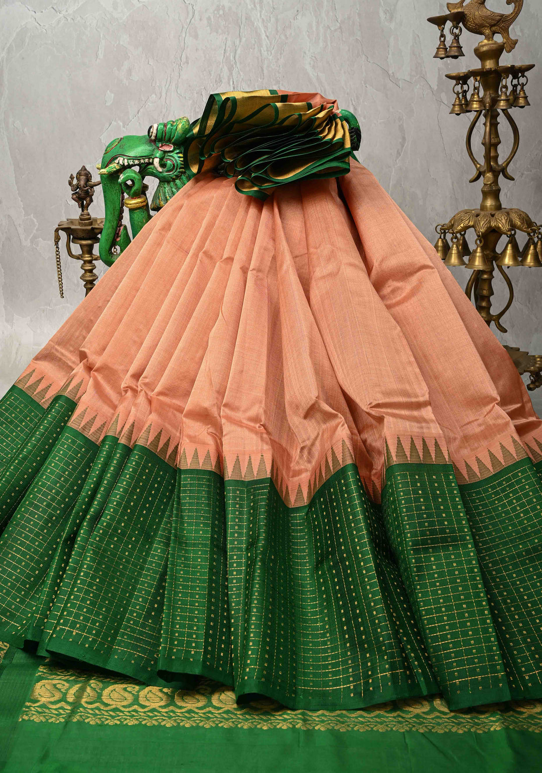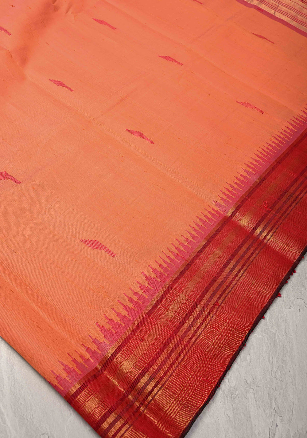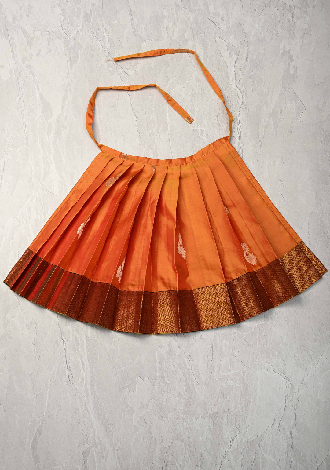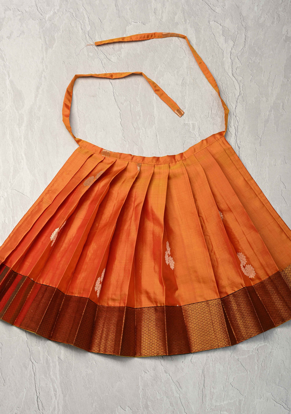 Traditional weaves like Kanjeevaram or Chanderi in orange shades are popular temple-wear choices.