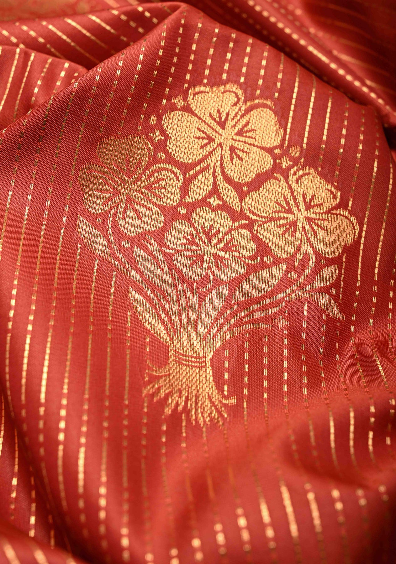 Pumpkin Orange Dual Tone Vertical Stripes on Kanchi Semi Silk Saree with Zari Buttas and Contrast Zari Border
