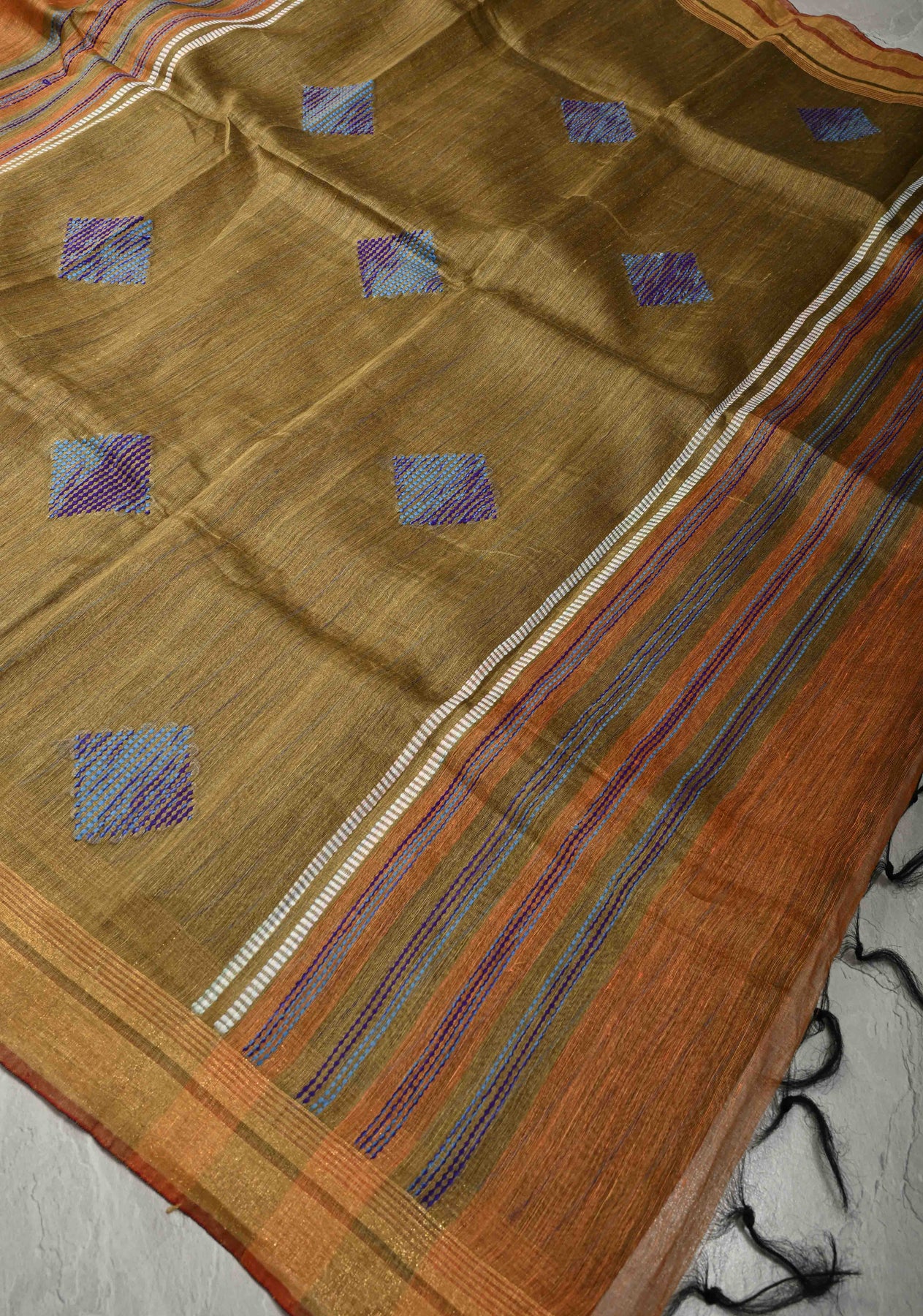 Rust Orange Handwoven Silk Linen Saree with Thread Buttas and Muted Zari Border