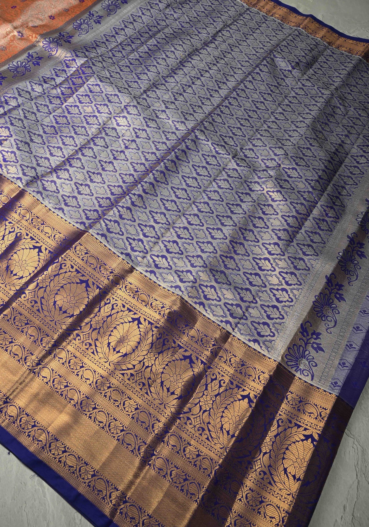 This Orange Kanjivaram Tissue Semi-Silk Saree is a radiant expression of traditional artistry and refined elegance. Crafted with a shimmering tissue weave, the saree exudes a rich, golden-orange glow that beautifully catches the light with every movement. The intricate Meenakari floral brocade jaal adorns the body, showcasing detailed patterns that reflect the grandeur of Kanjivaram craftsmanship. Complementing its vibrant hue, the contrast wide zari border in gold adds a majestic finish, enhancing its festive allure. Perfect for weddings, celebrations, and special occasions, this saree embodies timeless sophistication and opulent charm—making it a statement piece in any ethnic wardrobe.