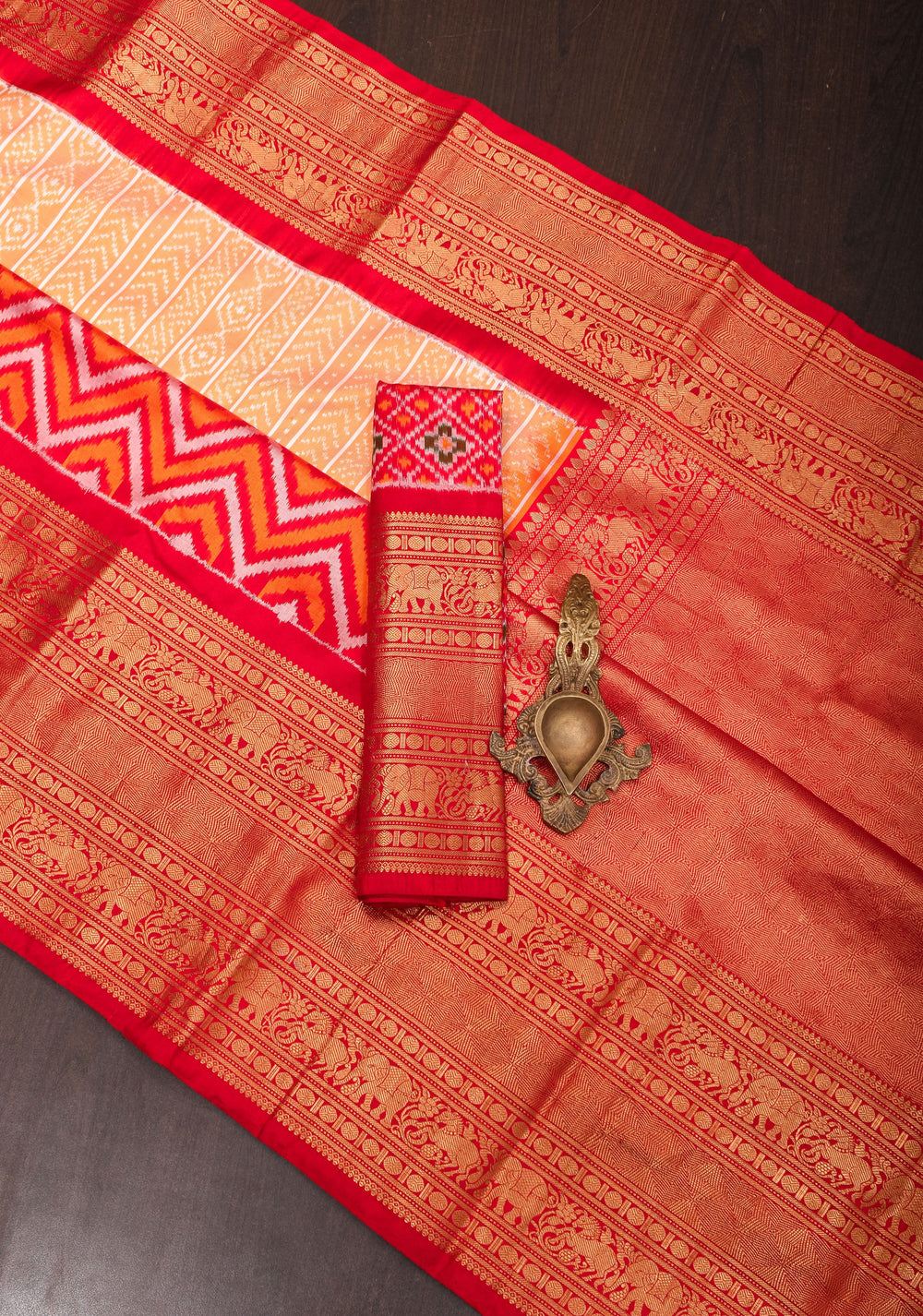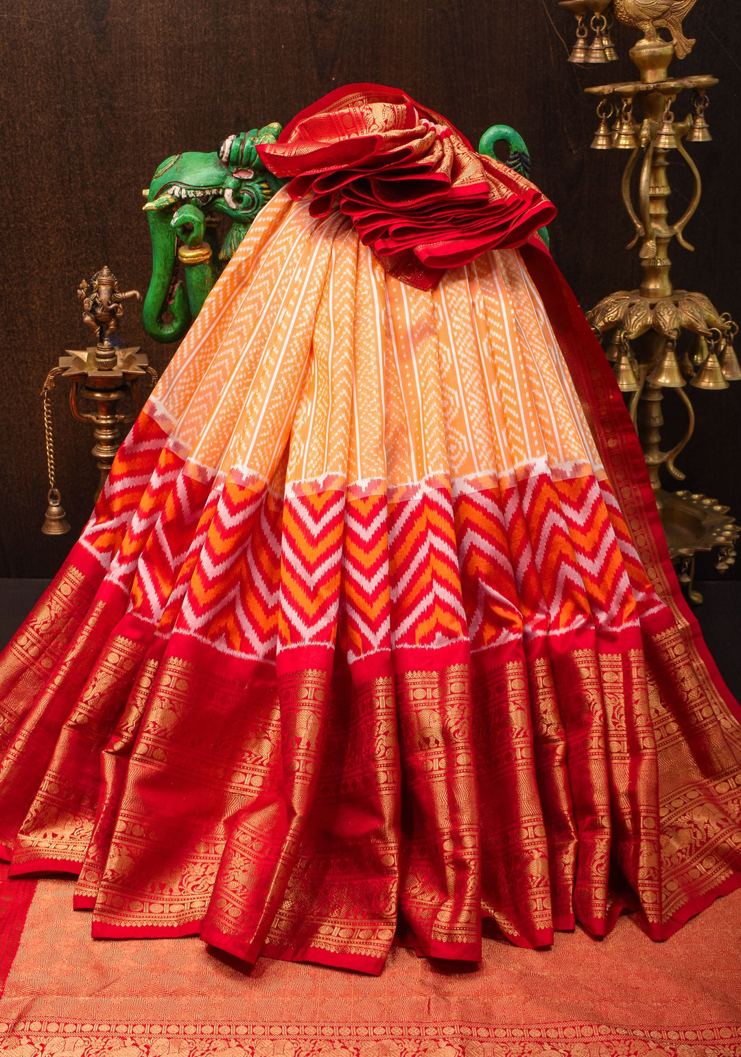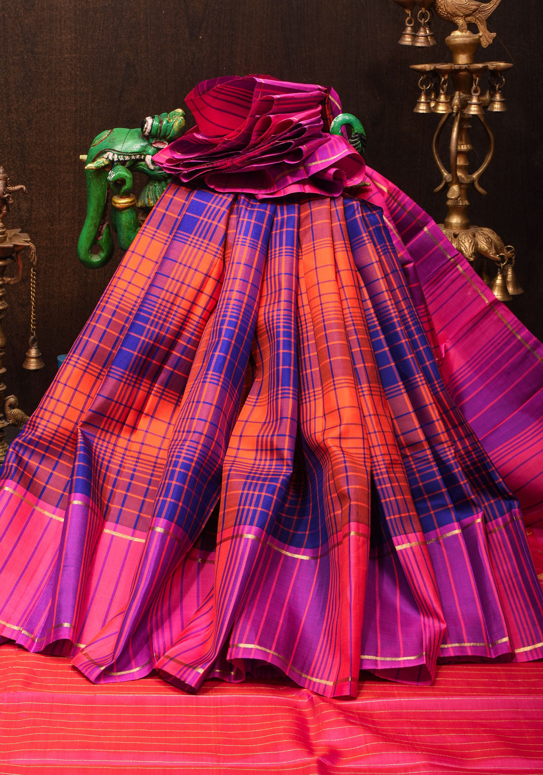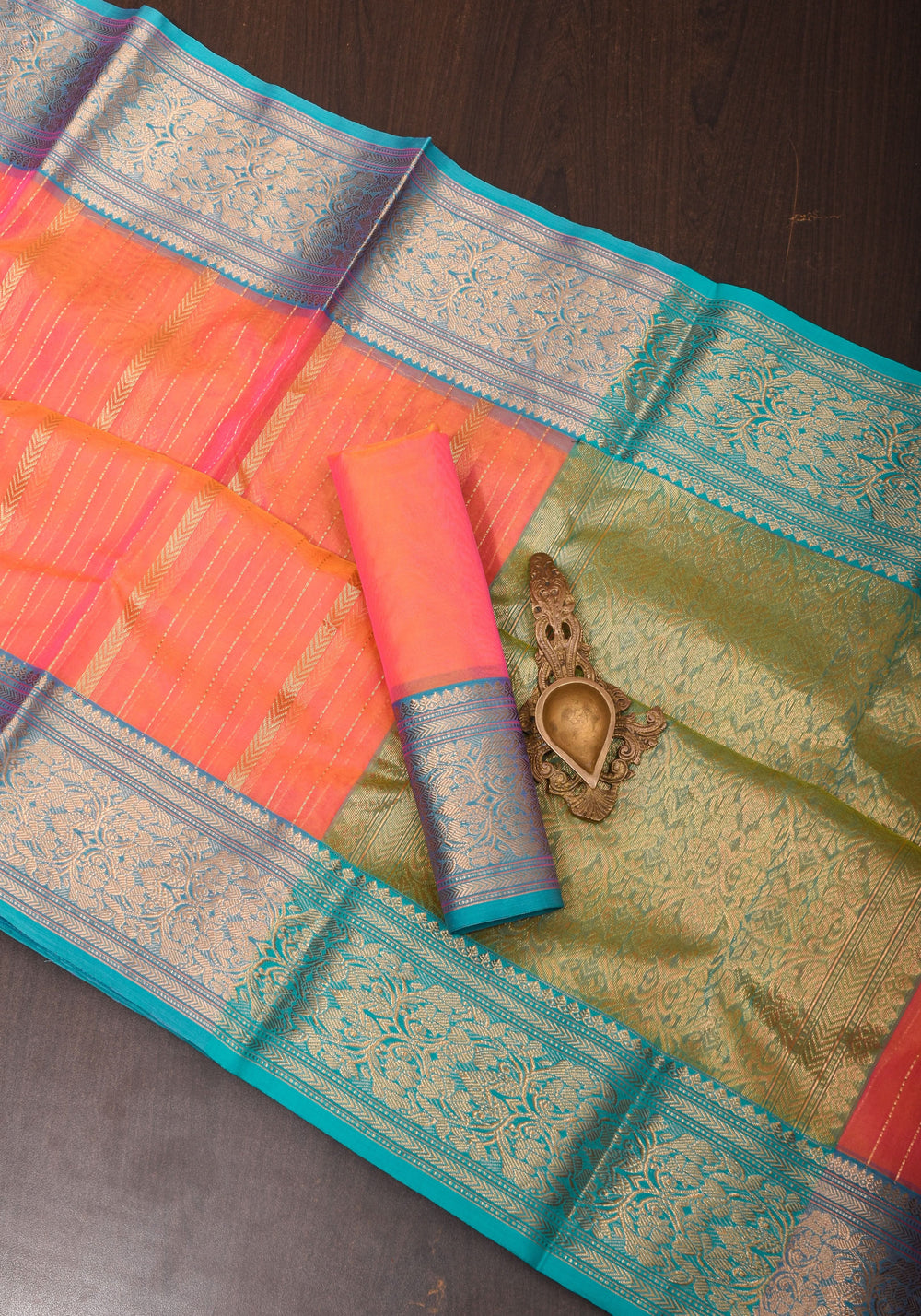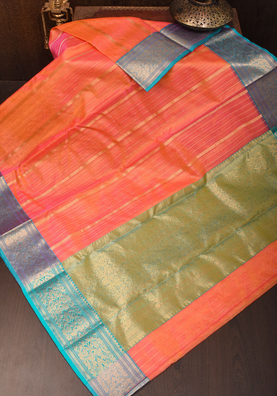 Kanjivaram orange sarees with gold borders are treasured heirlooms in South India.