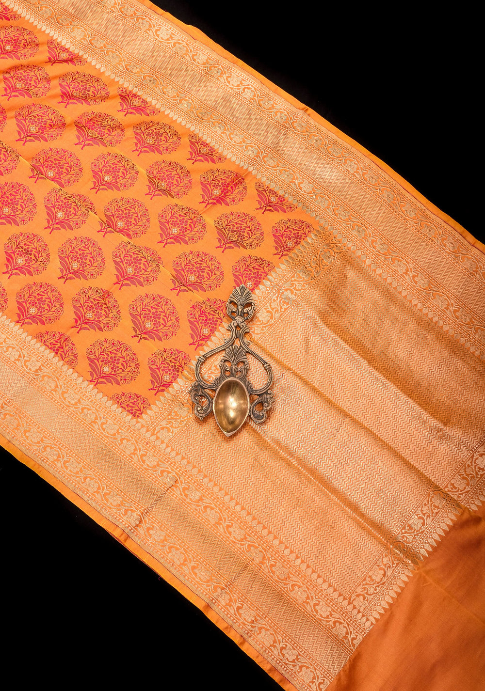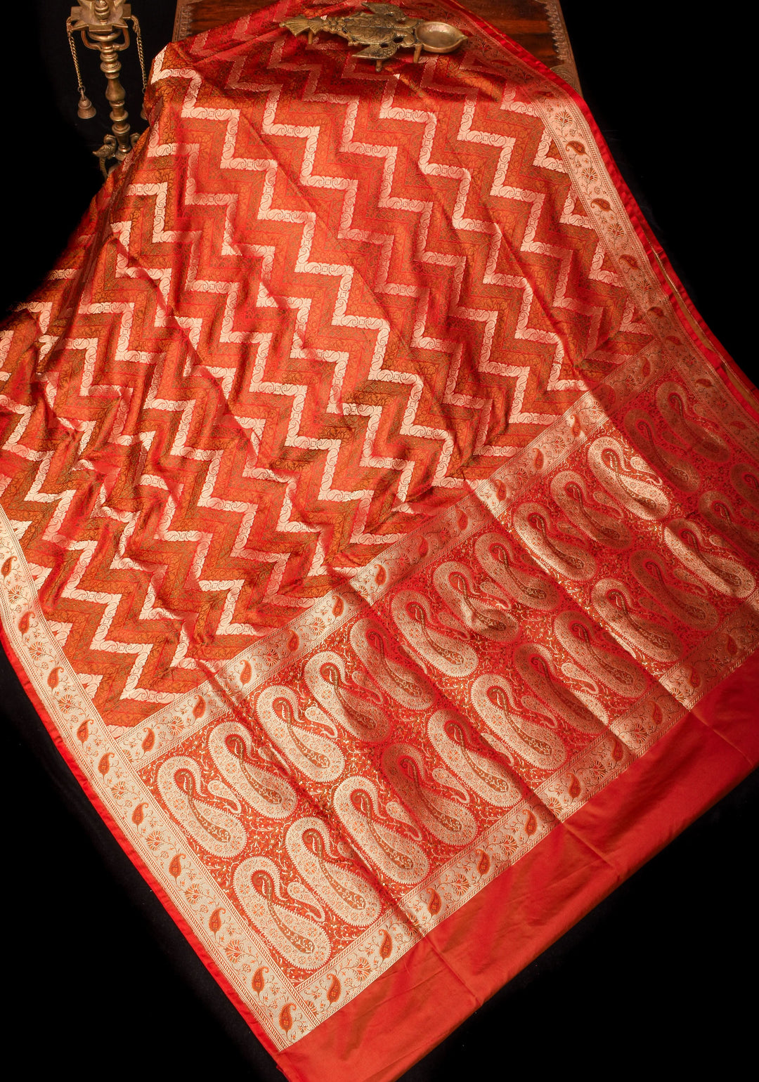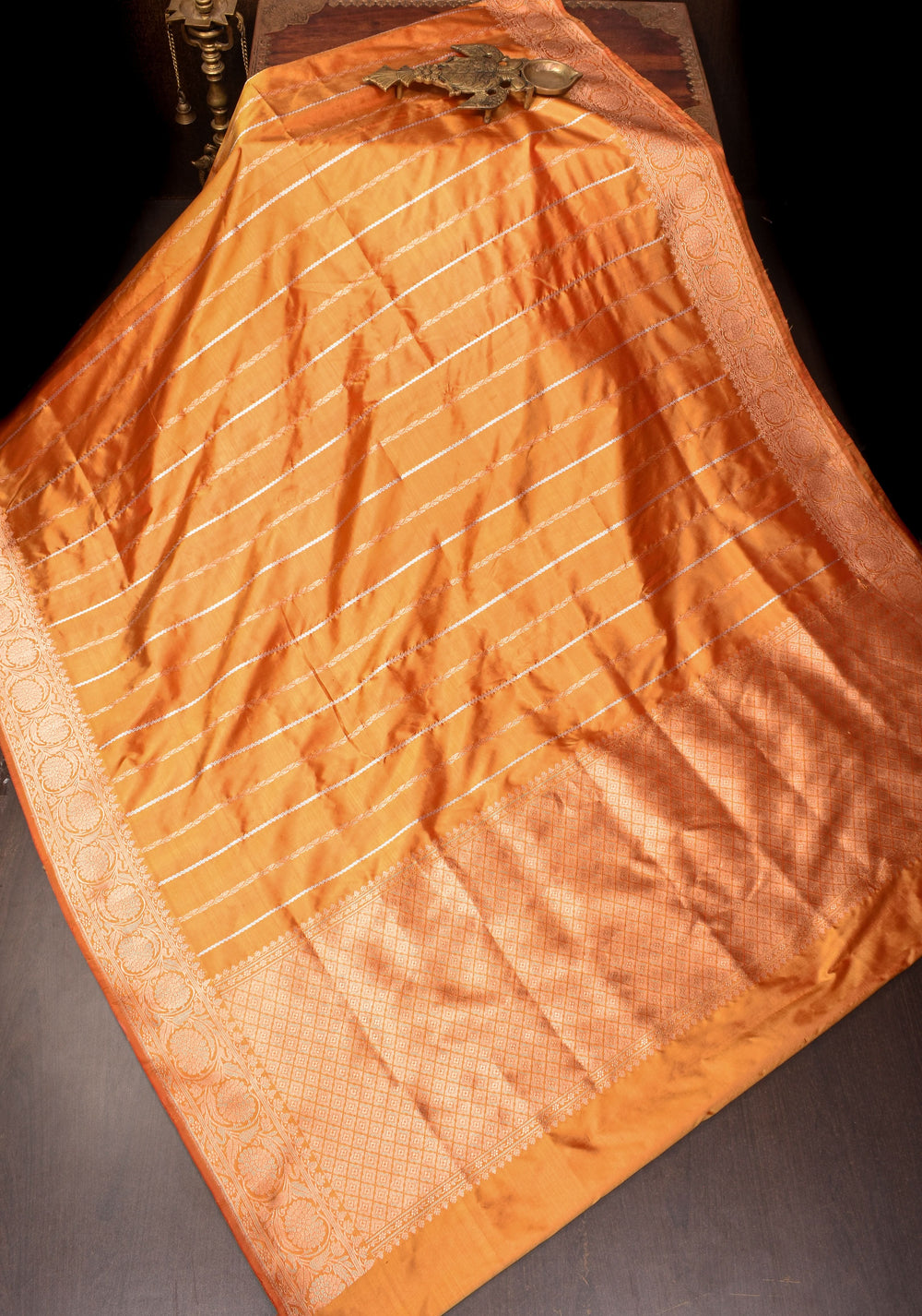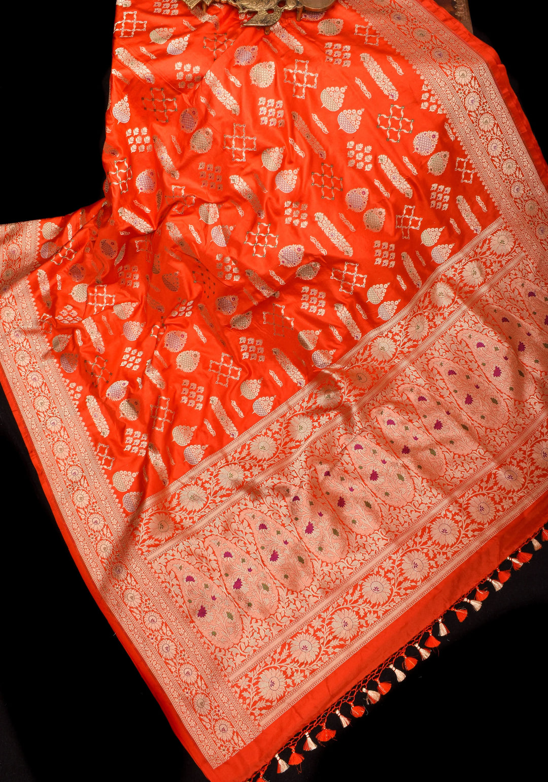Banarasi silk orange sarees with intricate zari work are perfect for weddings and festivals.
