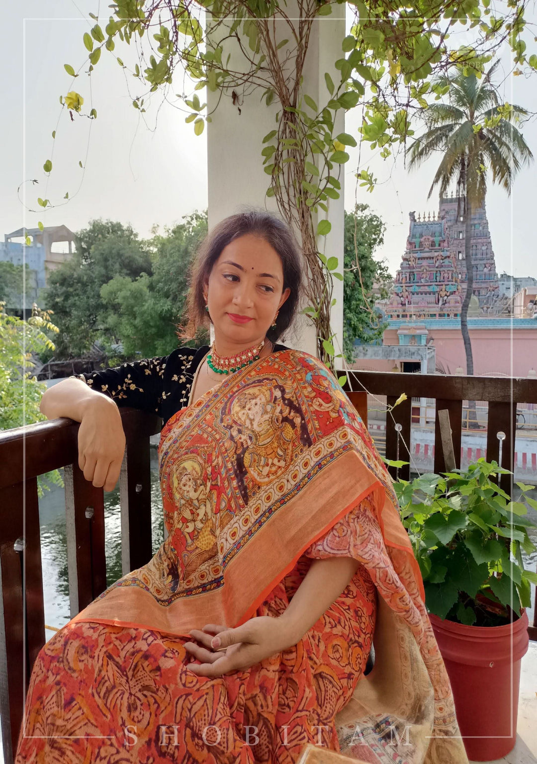 Many women choose an orange saree when visiting temples to embrace the spiritual energy.