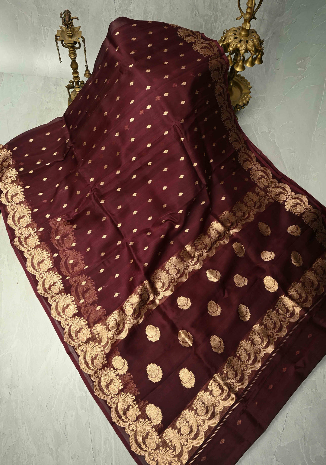 Crafted from pure silk, these sarees are lightweight yet opulent, making them a top pick for weddings and grand occasions.