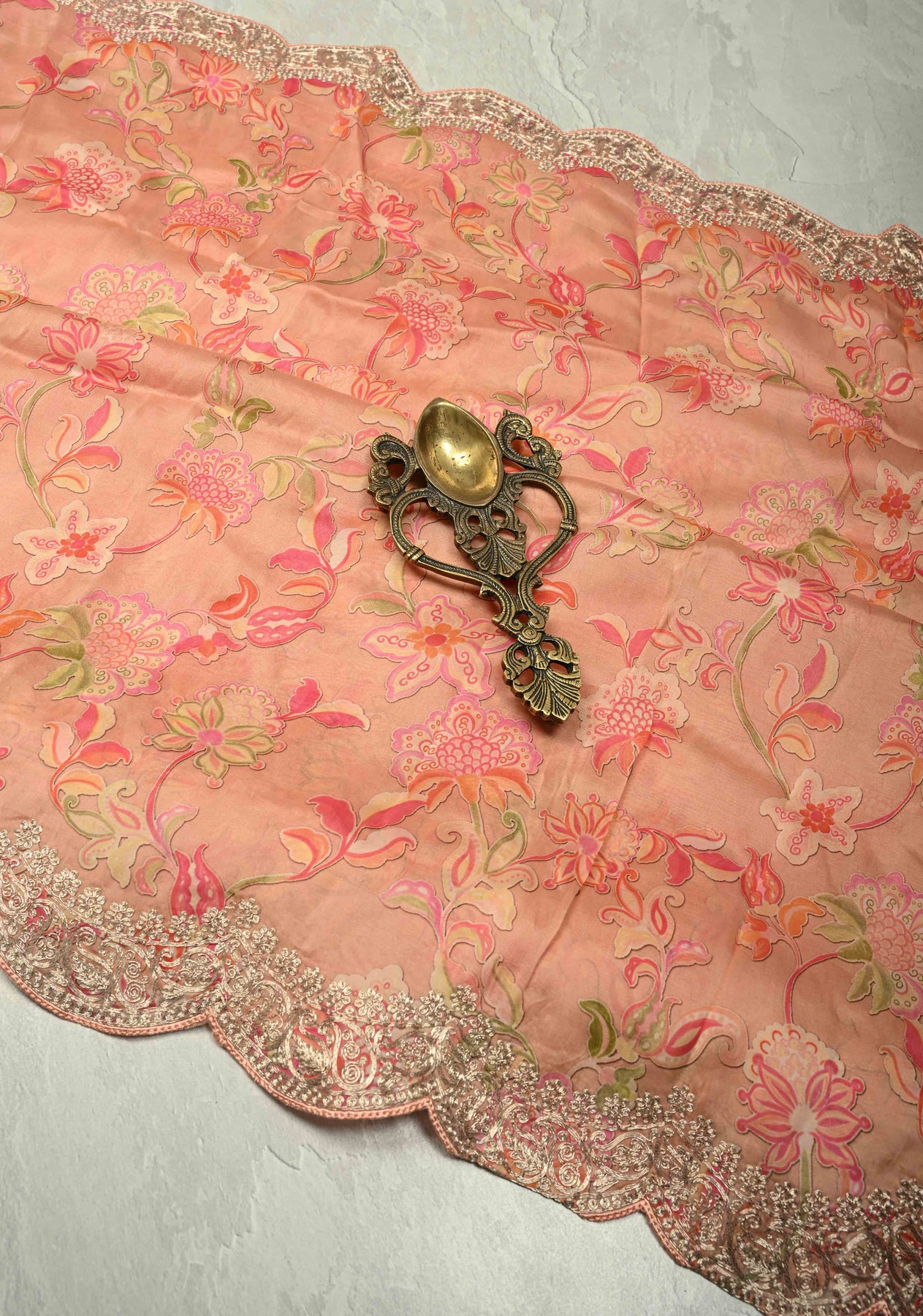 A delicate canvas of hand-painted florals printed digitally rendered in soft pastel hues, evoking quiet elegance. The subtle color palette is beautifully complemented by a border accentuated with intricate cord embroidery, weaving