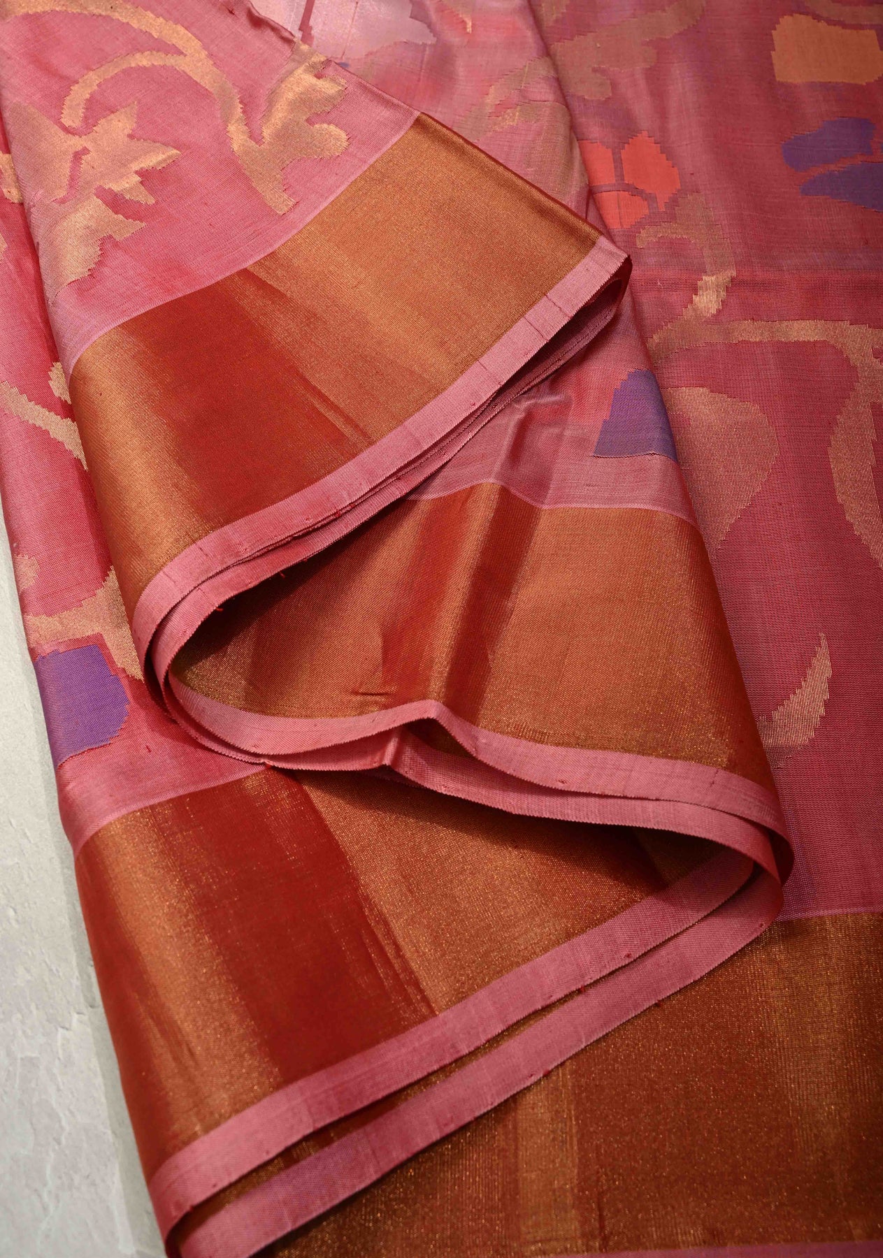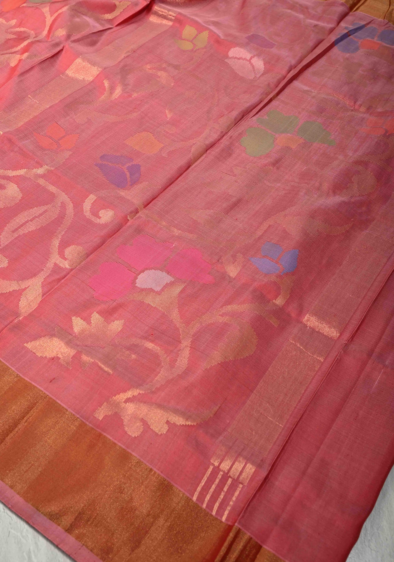 Grace your wardrobe with refined elegance in this Light Carmine Pink Uppada Handloom Silk Saree, exquisitely handcrafted to highlight timeless artistry. Woven from fine Uppada silk, the saree features an intricate full body Jamdani jaal, adding delicate texture and sophisticated charm. The luminous tissue border enhances its graceful appeal while preserving a lightweight, fluid drape. Perfect for weddings, festive occasions, and special celebrations, this saree beautifully blends heritage craftsmanship with contemporary elegance. Pair it with classic jewelry for a soft yet regal look.