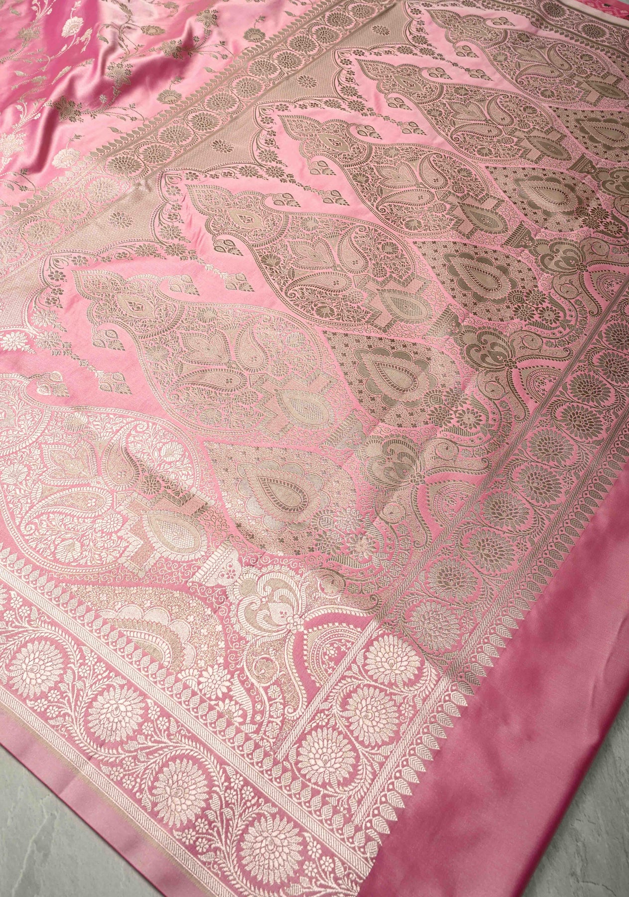 This Dusty Rose Banarasi Semi Mashru Silk Saree is a vibrant fusion of tradition and contemporary flair. Crafted from smooth and lustrous semi mashru silk, the saree features an intricately woven floral jaal that adds timeless elegance to its bold, eye-catching hue. The zari border brings in a classic Banarasi touch, perfectly balancing the modern color with traditional craftsmanship. fluid in drape, it’s an ideal choice for weddings, festive occasions, or statement-making celebrations. Style it with gold or kundan jewelry and a contrasting blouse for a head-turning ethnic look.