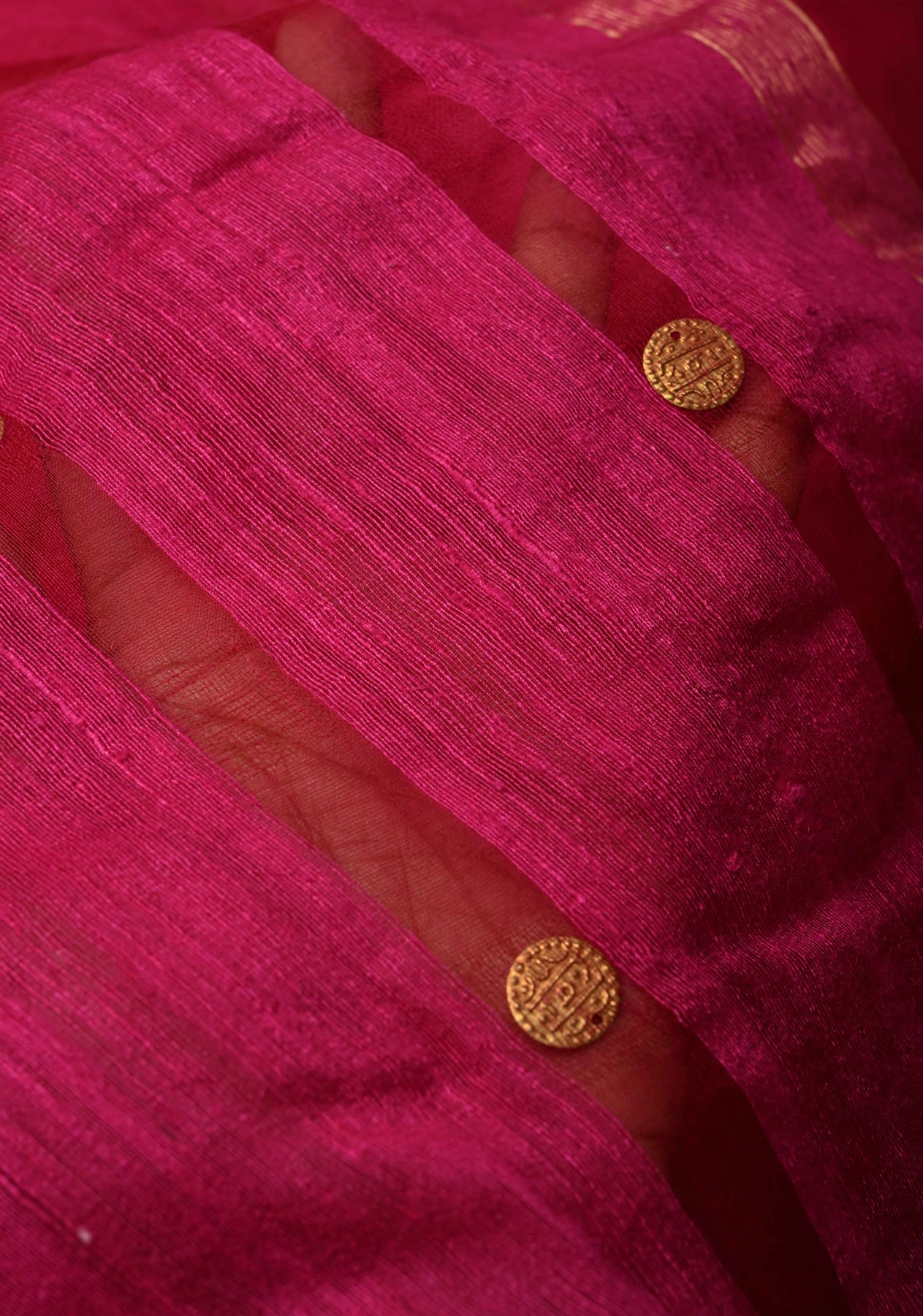 The saree’s highlight is its coin interweave detailing, adding a subtle metallic shimmer that enhances its festive appeal. The striking combination of rani pink and teal creates a regal contrast, making it perfect for weddings, festive celebrations, and cultural gatherings.