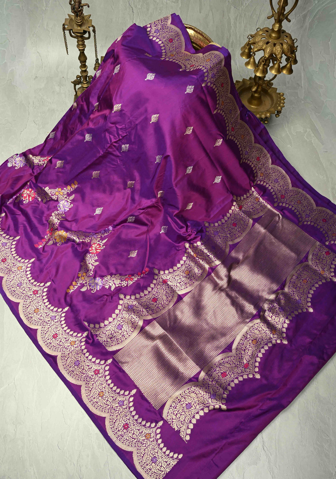 Eggplant Purple Meenakari on Banarasi Katan Silk Saree with Floral Brocade Jaal and Zari Border-Pallu | SILK MARK CERTIFIED