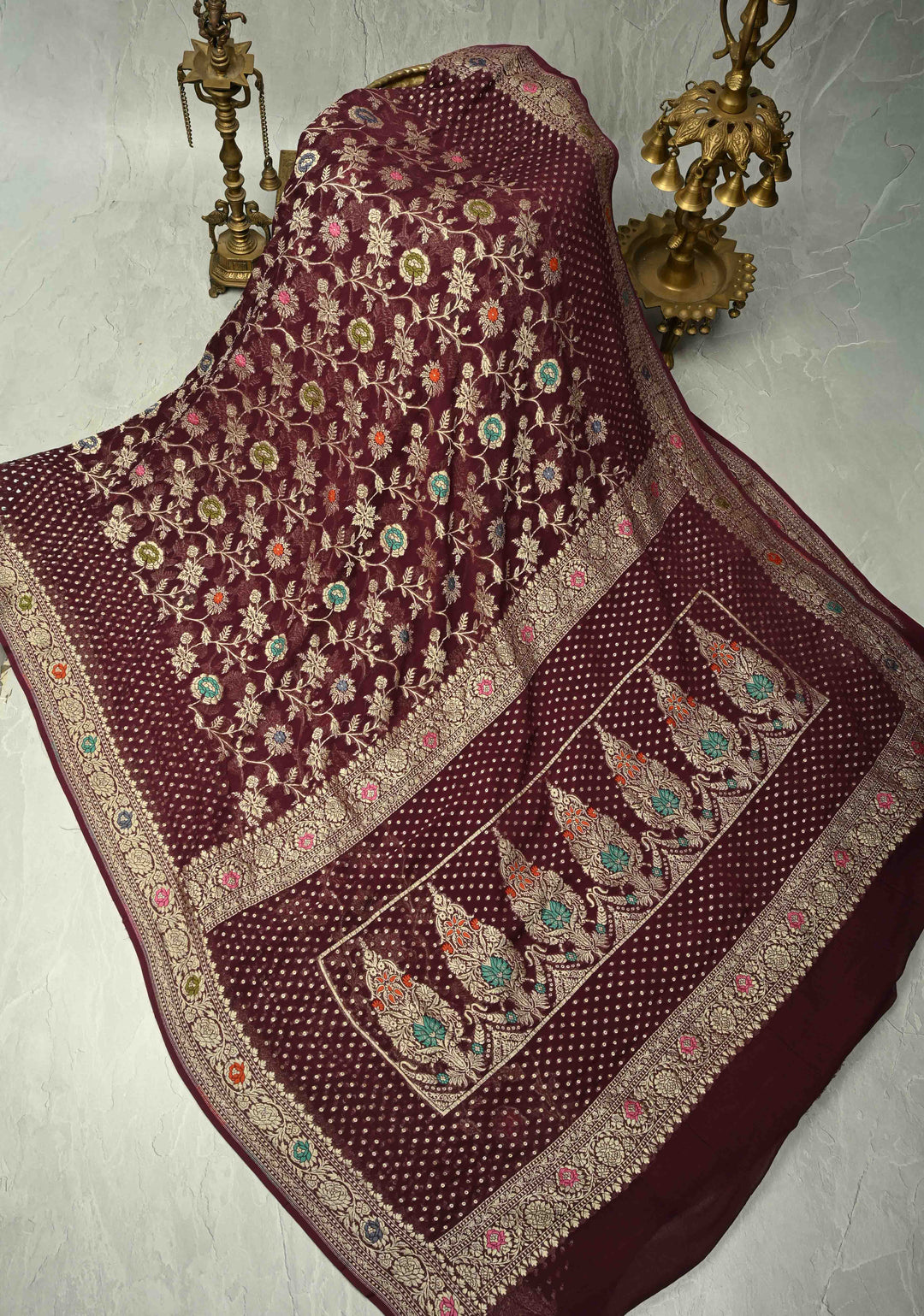 Purple Sarkam Bandhej on Pure Banarasi Silk Georgette Saree with Gharchola Jaal Meenakari Detailling and Border | SILK MARK CERTIFIED