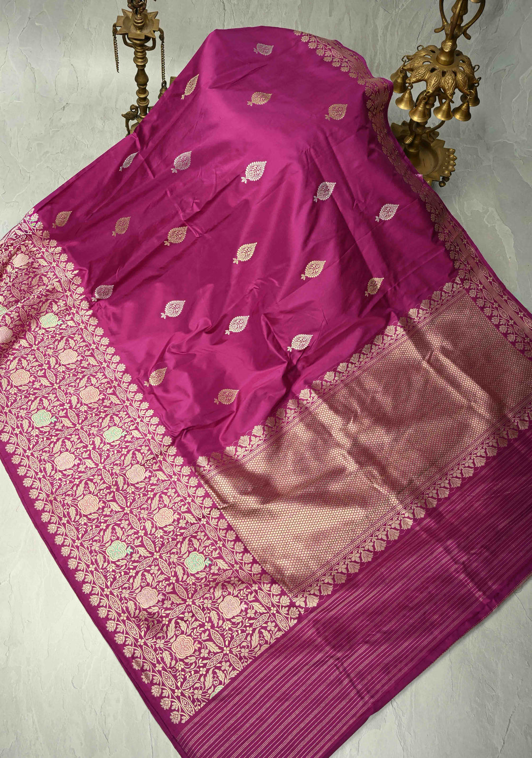 Magenta Banarasi Katan Silk Saree with Floral Brocade Jaal and Zari Border | SILK MARK CERTIFIED