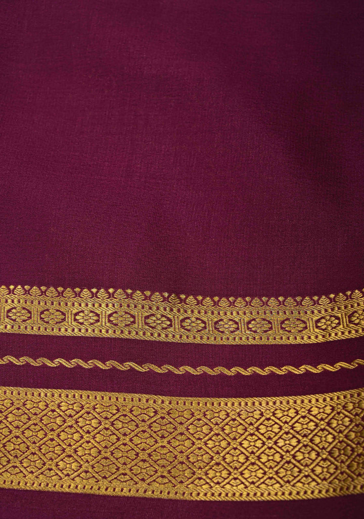 This Aubergine Pure Mysore Silk Saree is a captivating blend of rich color and classic design. The aubergine body is gracefully contrasted with Podi-Kattam zari checks woven on a soft rose pink base, creating a subtle interplay of texture and tone. Crafted from pure Mysore silk, the saree offers a natural sheen, lightweight comfort, and a fluid drape. The elegant zari border adds a refined finish, enhancing the traditional appeal while maintaining timeless sophistication. Perfect for festive occasions, weddings, and cultural celebrations, this saree brings together grace, color harmony, and heritage weaving.