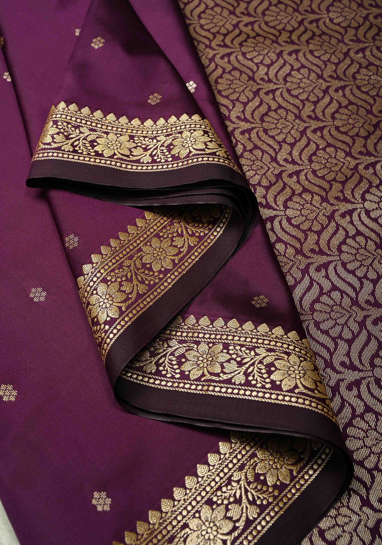 The Deep Plum Semi Silk Saree with Chunri Buttis is a captivating blend of elegance and tradition. Crafted from semi-silk fabric, the saree offers a smooth, luxurious drape that enhances its sophisticated appeal. The classic chunri butti design, delicately scattered across the fabric, adds a touch of heritage, while the minimal zari border provides a subtle yet graceful shimmer. The plum color exudes warmth and refinement, making it a perfect choice for evening events, festive celebrations, or formal occasions where you want to make a graceful statement without being over the top.