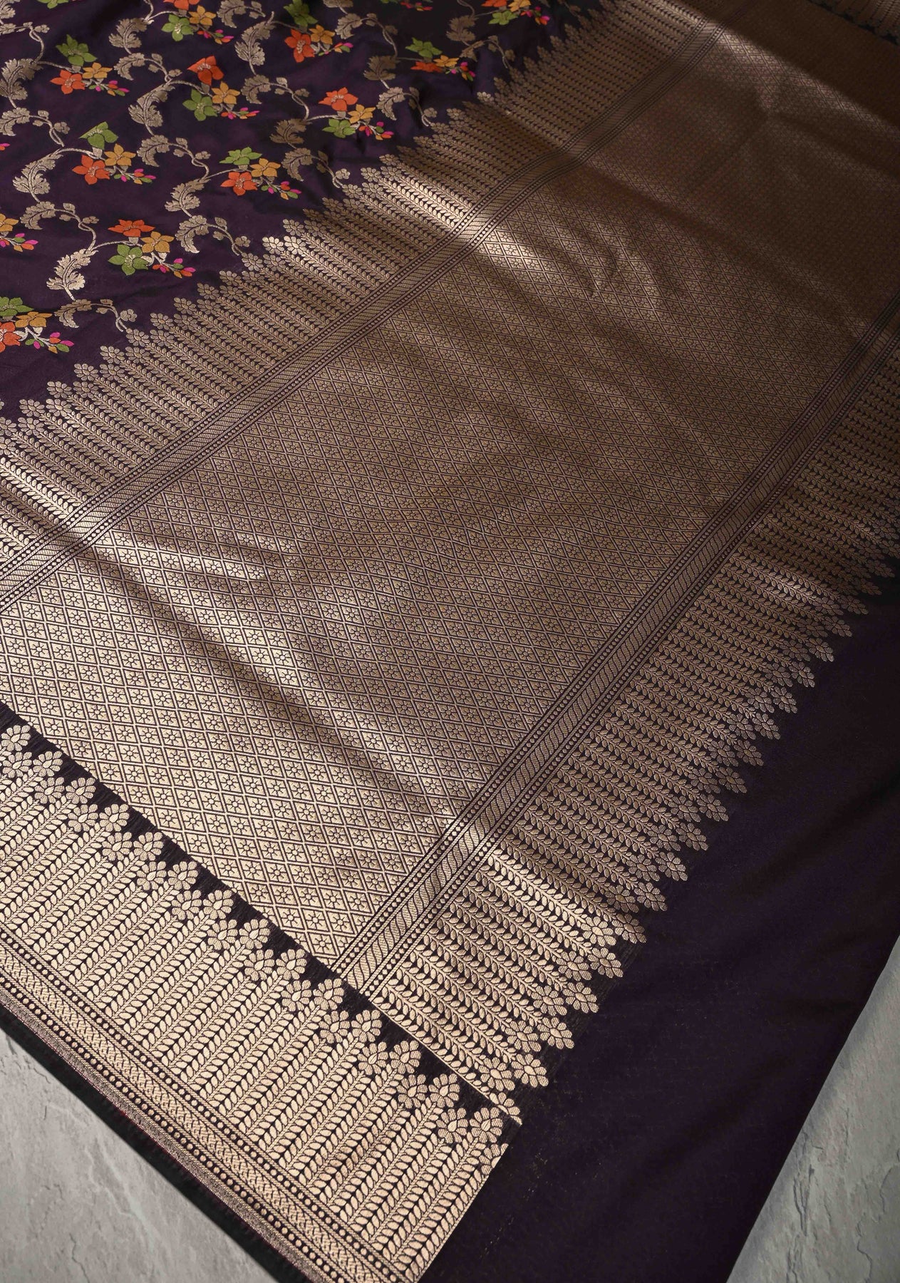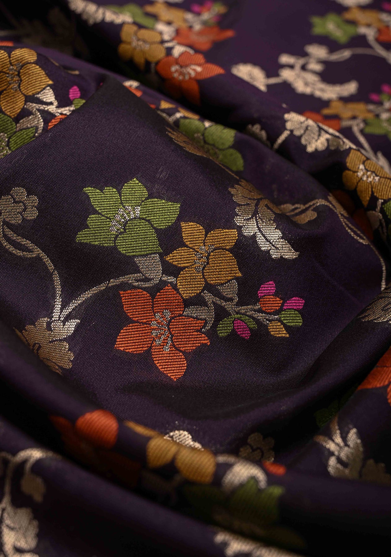 Rich and regal, this deep purple semi-silk saree is a striking embodiment of traditional elegance and intricate artistry. The body features an all-over floral Meenakari jaal, delicately woven with multicolored threads that bring a vibrant touch to the bold, luxurious base. Crafted from soft, lustrous semi-silk, the saree drapes beautifully, offering both comfort and sophistication. Accentuated with a finely detailed zari border, it adds a graceful shimmer that enhances its festive appeal. Perfect for weddings, formal functions, and cultural celebrations, this saree is a timeless piece that exudes grace and grandeur.
