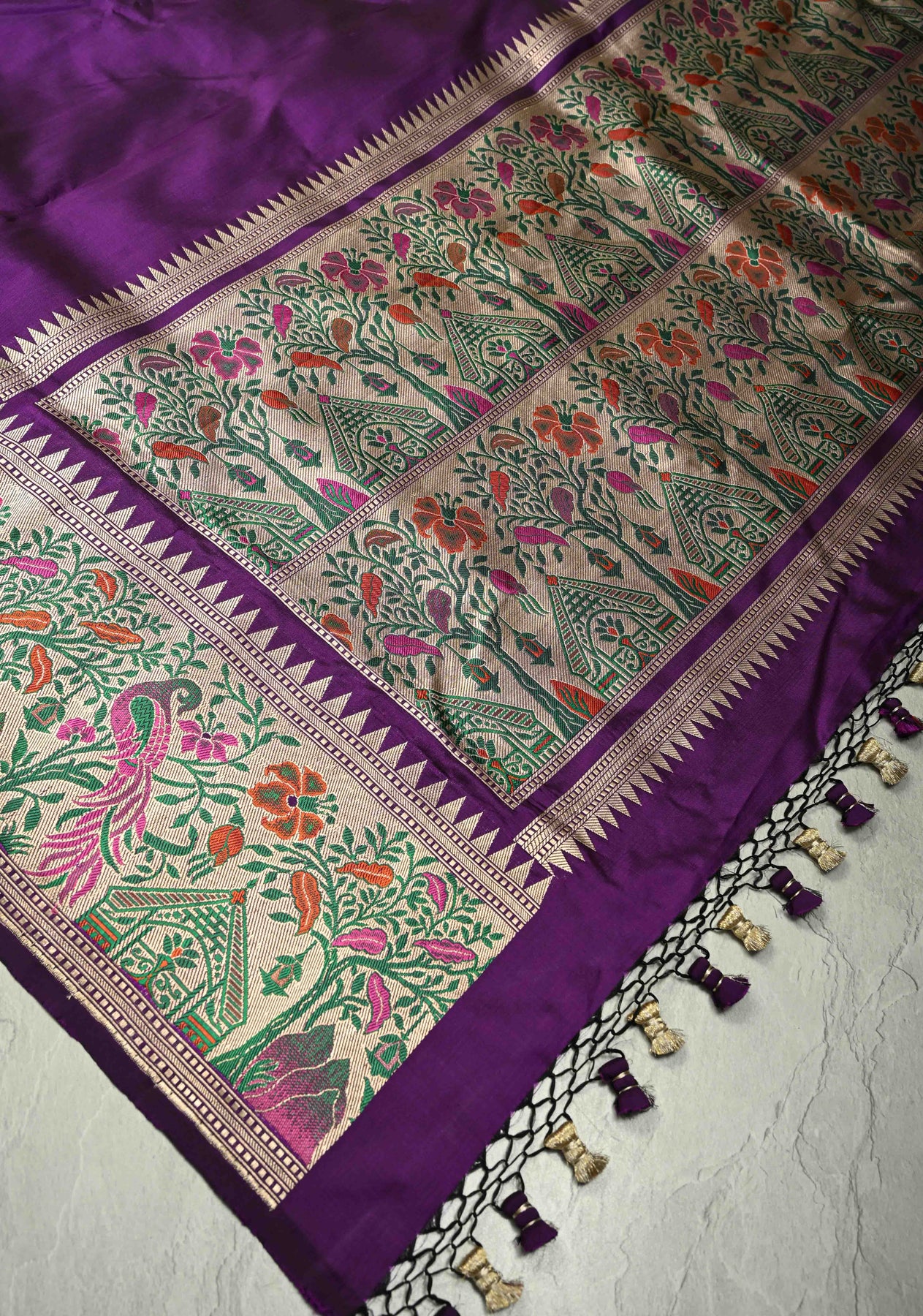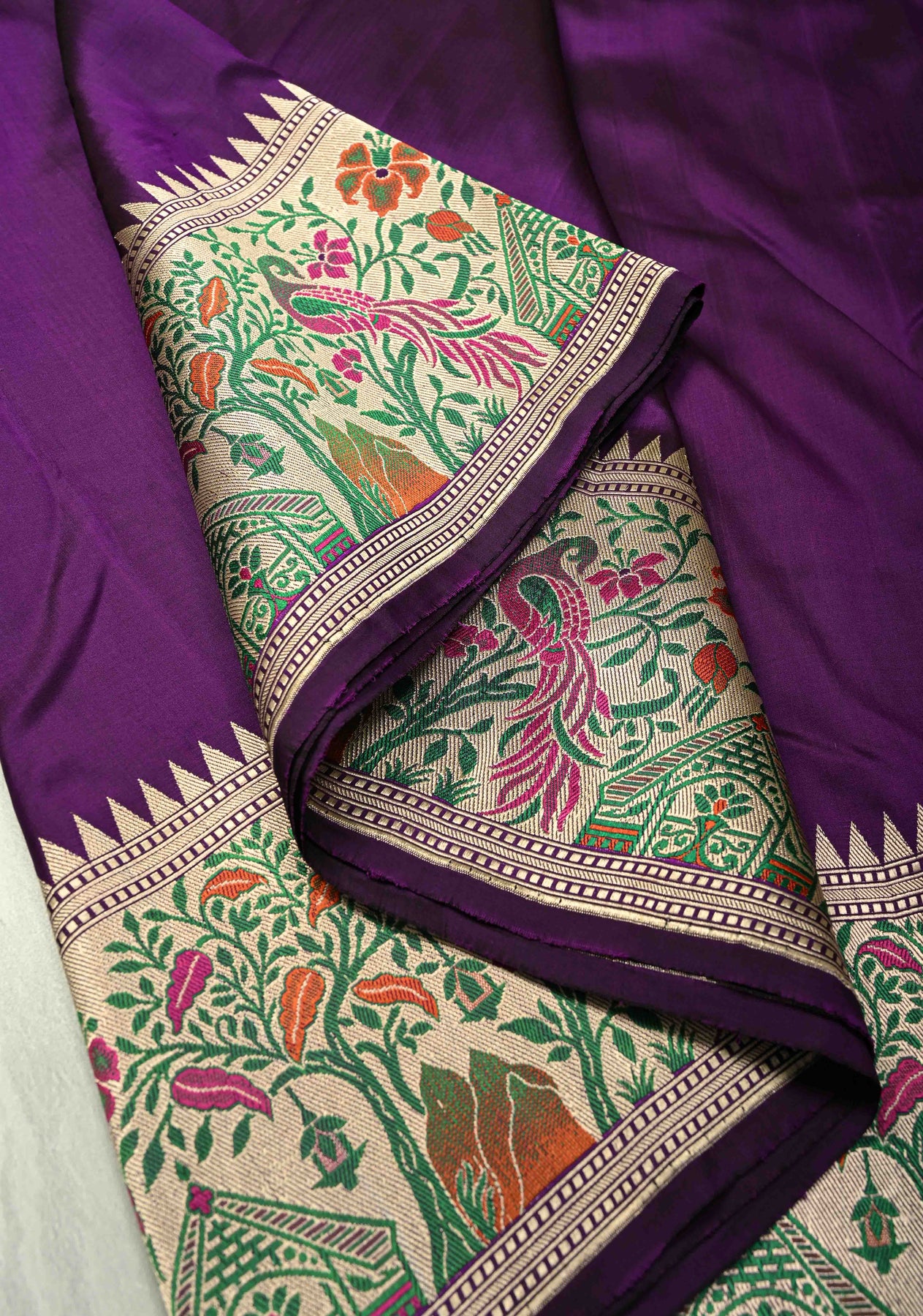 This exquisite saree celebrates the rich heritage of Indian weaving, uniting the finesse of Banaras with the vibrant artistry of Paithani. The fabric is luxurious Pure Banarasi Katan Silk in a deep, regal Jamuni Purple (a rich, eggplant hue), known for its soft texture and opulent drape. The body of the saree features subtle, traditional motifs. The true splendor lies in the magnificent Paithani Style Borders and Pallu, which are meticulously woven with colorful silk and zari, showcasing classic motifs like parrots, peacocks, and floral vines, characteristic of Paithani weaving. This saree is a contemporary heirloom, perfect for the bride or discerning woman seeking a unique garment that embodies the best of two weaving traditions—ideal for weddings, anniversaries, and grand cultural events.