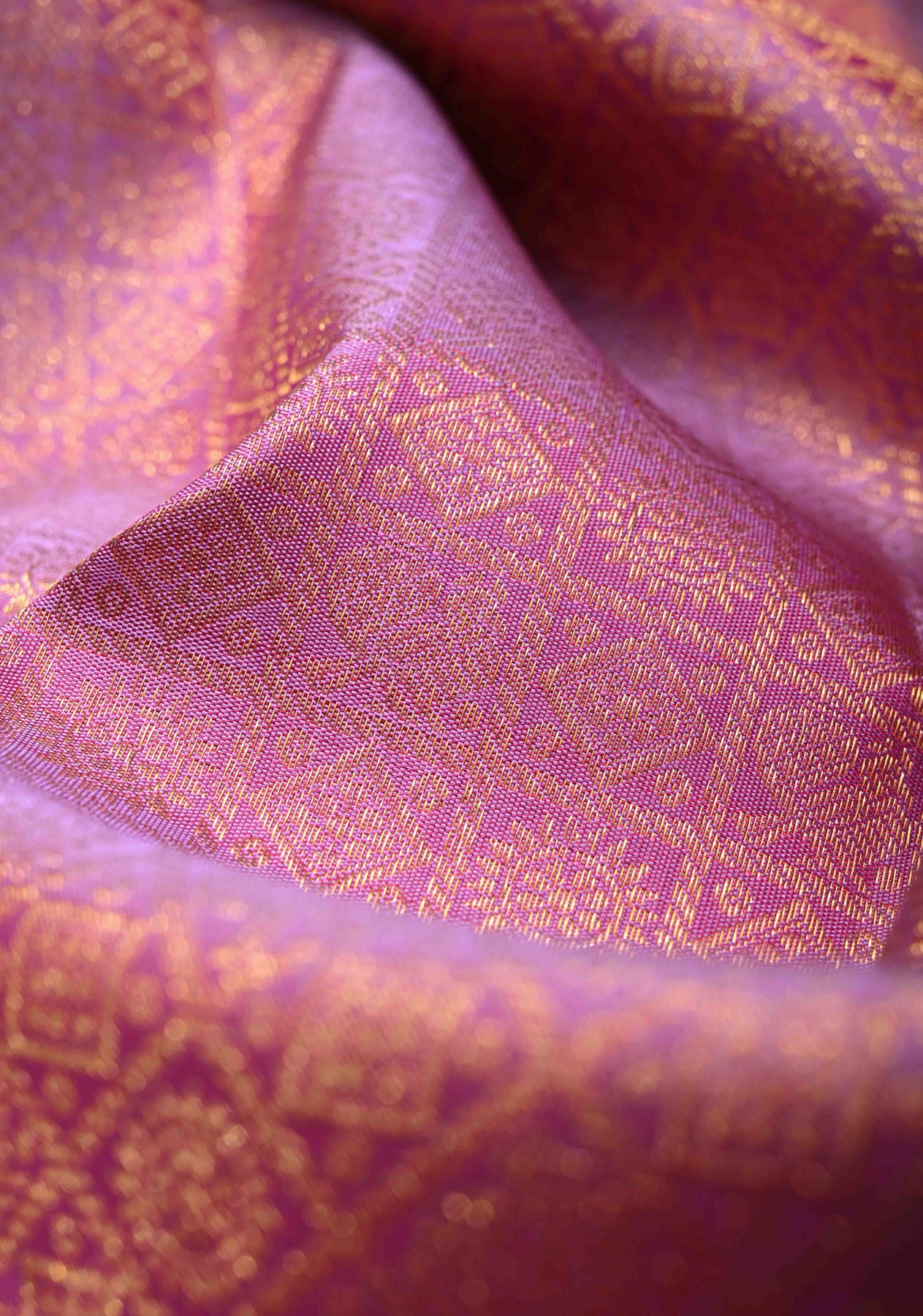This beautiful Lilac dual-tone Gadwal silk saree is a refined blend of softness and traditional grandeur. Woven in Gadwal silk, the saree features an elegant Patola brocade that adds rich texture and intricate detailing to the body. The subtle dual-tone lilac hue lends depth and a graceful sheen, enhancing its sophisticated appeal. Accentuated with a wide zari border, the saree gains a regal finish that perfectly complements its delicate color palette. Ideal for weddings, festive celebrations, and special occasions, this saree drapes effortlessly and reflects timeless heritage craftsmanship.