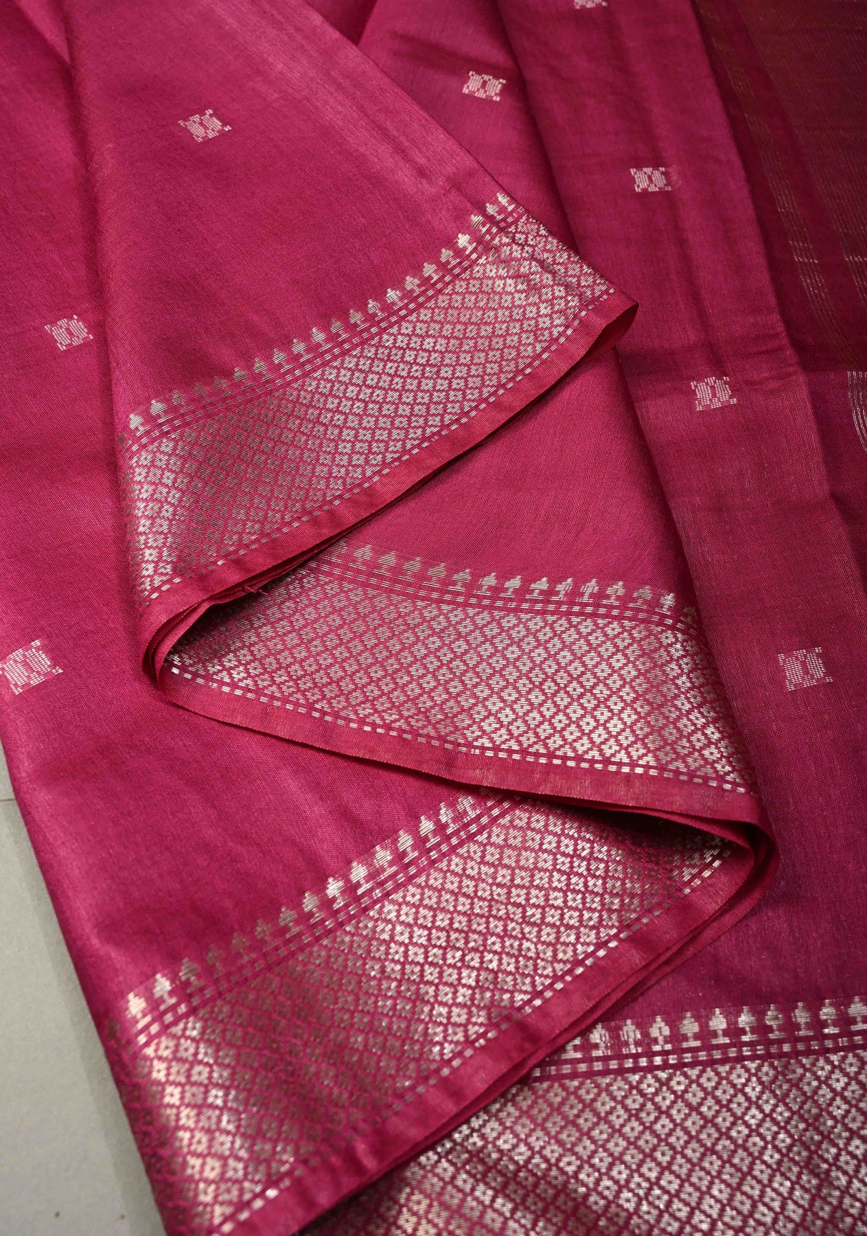Make a statement in this Magenta Semi Tussar Saree, featuring intricate thread buttas and a shimmering silver zari border. The vibrant magenta hue adds a bold and elegant touch, making it perfect for weddings, festive occasions, or special celebrations. Lightweight and gracefully draping, this saree pairs beautifully with statement jewelry for a striking, contemporary ethnic look.