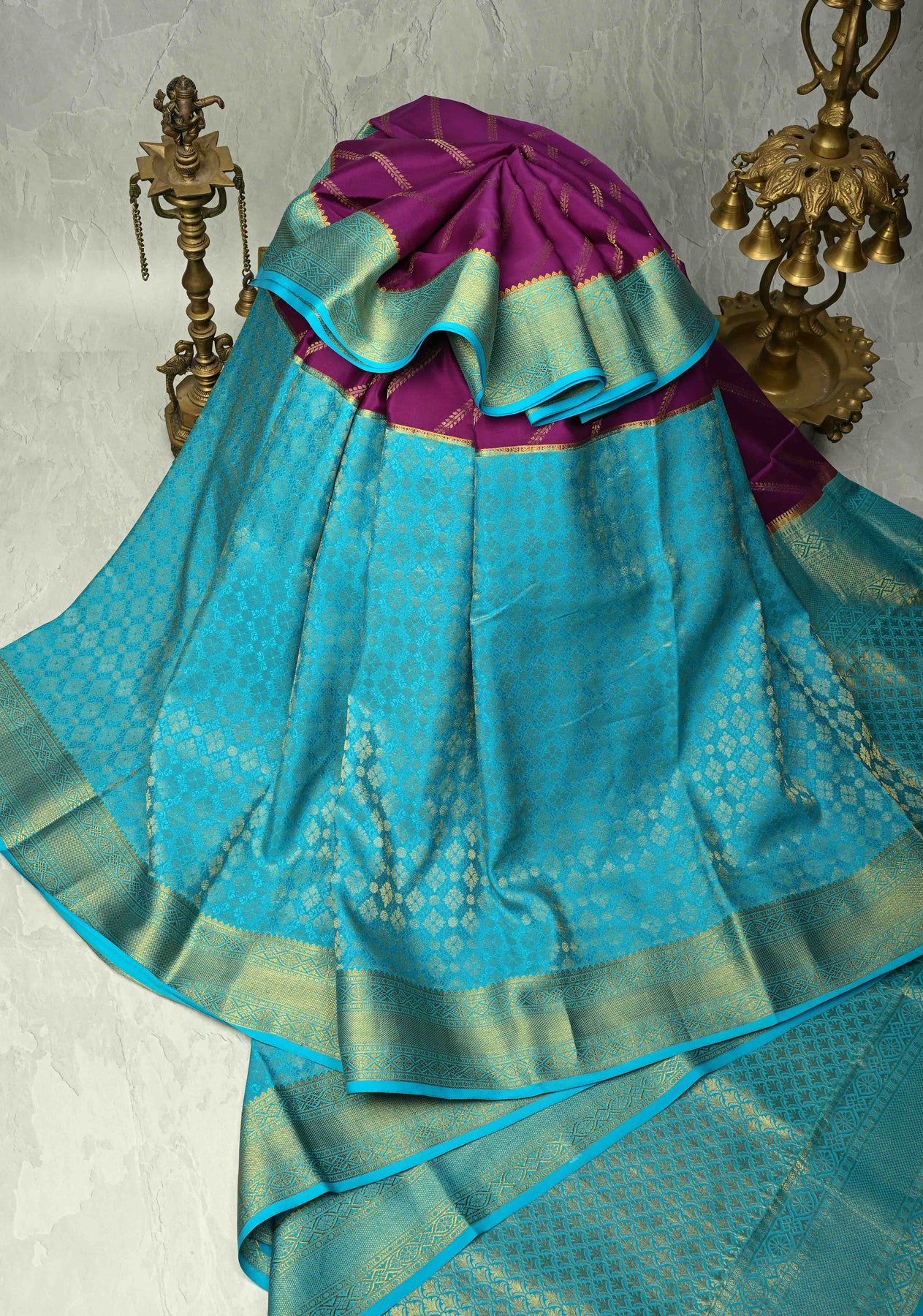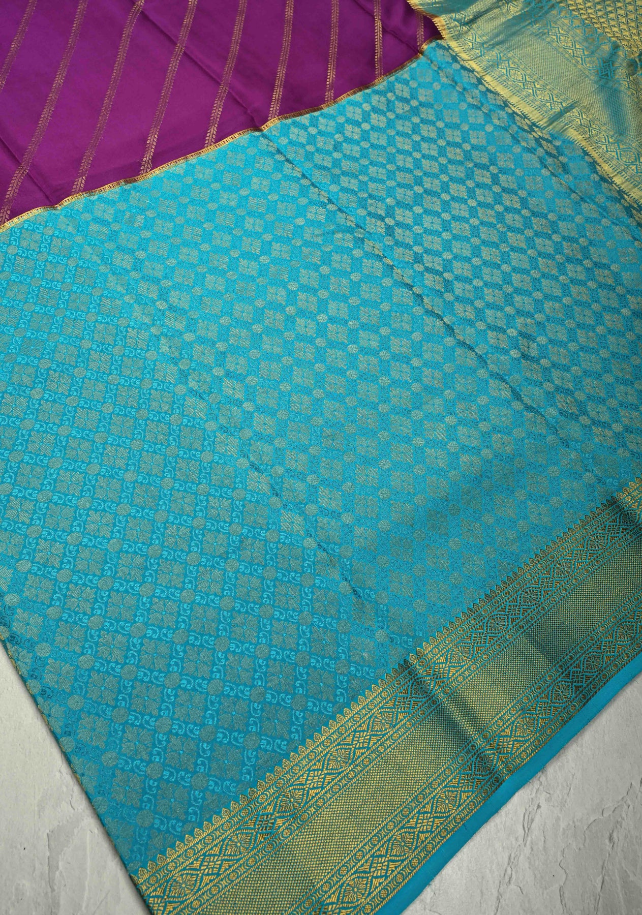 KSIC Grade Thickness Purple-Cyan Half Border Mysore Silk Saree with Brocade Jaal and Daignoal Stripes | SILK MARK CERTIFIED