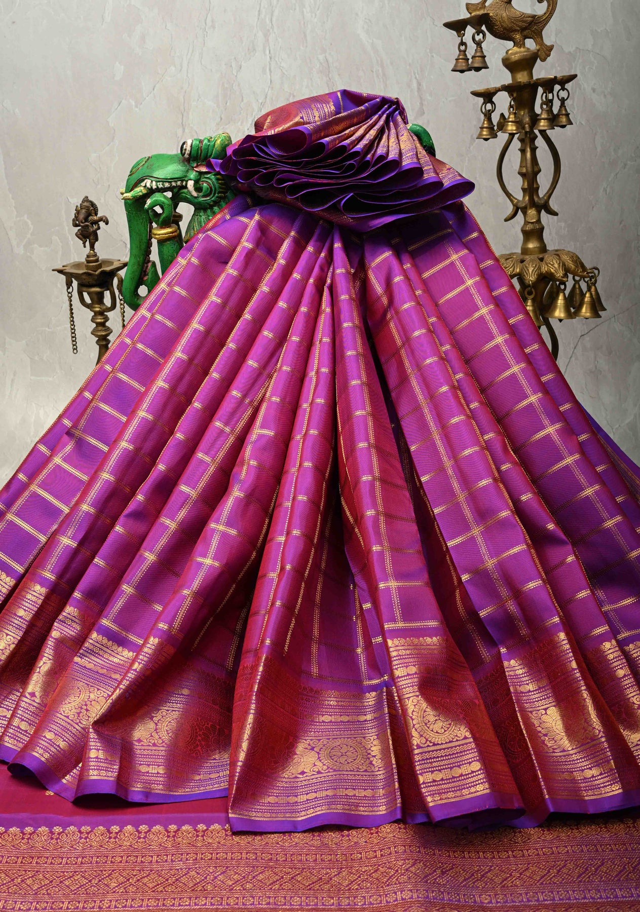 The captivating dual-tone purple base is adorned with finely woven zari checks that add depth and visual . A traditional zari border enhances the saree with a regal finish, highlighting the meticulous craftsmanship that defines Gadwal weaving. The harmonious interplay of silk and zari creates a sophisticated look that never goes out of style.