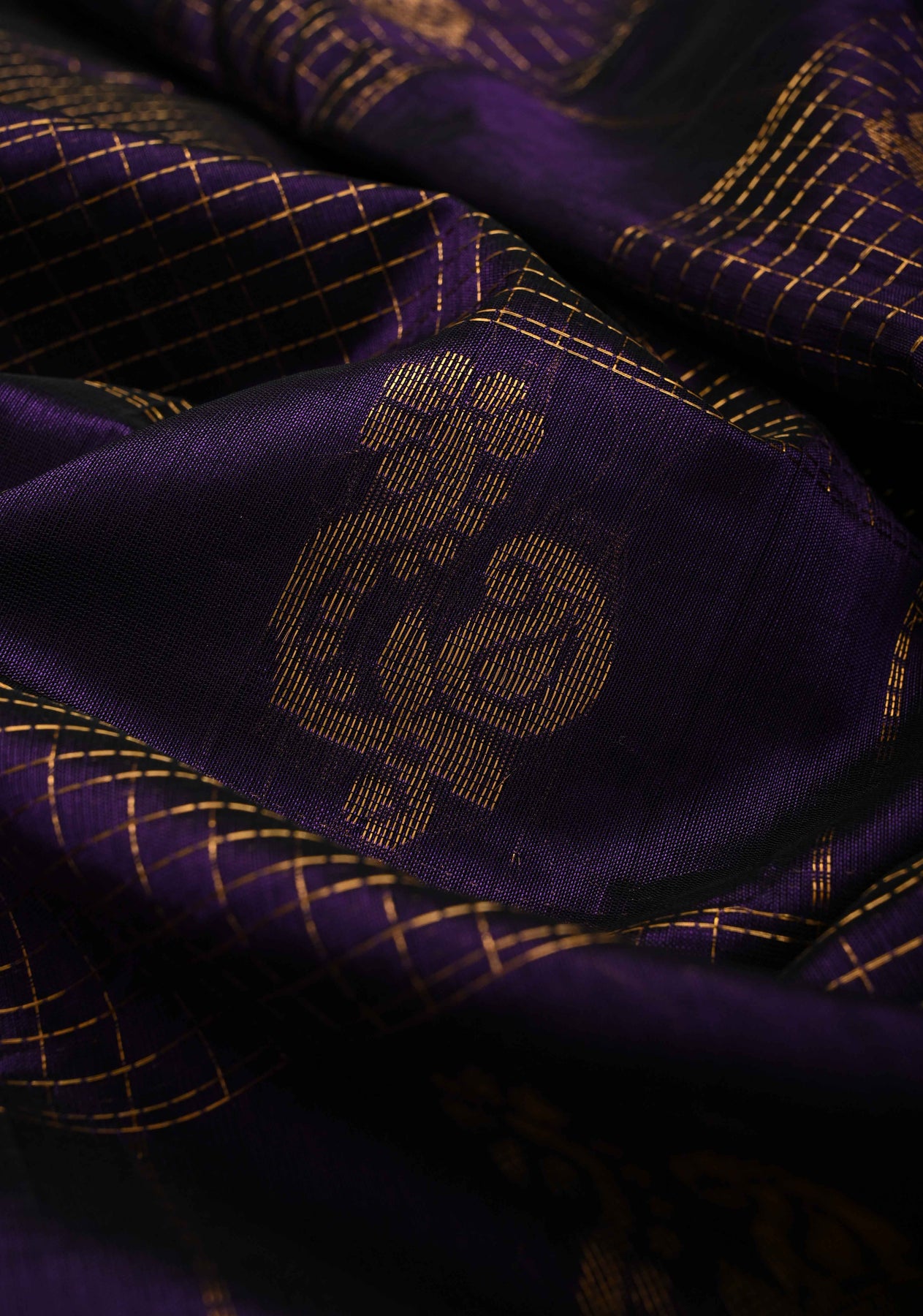The Royal Purple Kanchi Silk Cotton Handloom Saree exudes regal elegance while showcasing traditional craftsmanship. Woven from Kanchi silk cotton, this saree features subtle zari checks on a royal purple base, lending a structured yet sophisticated look. The body is adorned with delicate zari buttas that catch the light gracefully. A temple-inspired wide zari border completes the design, adding a heritage-finish. Lightweight, breathable, and refined, this saree is perfect for weddings, festive occasions, temple visits, and cultural celebrations.