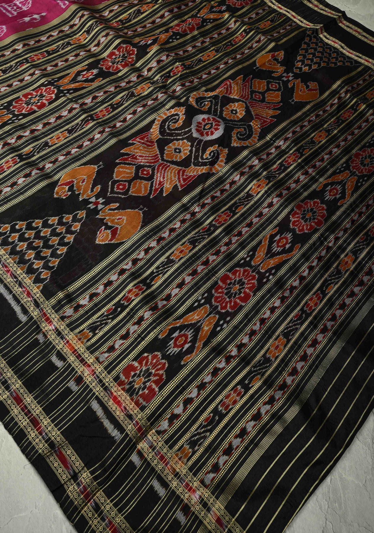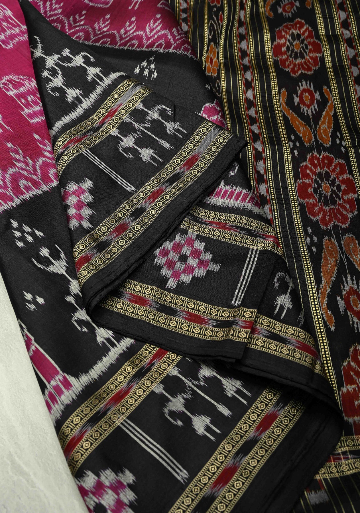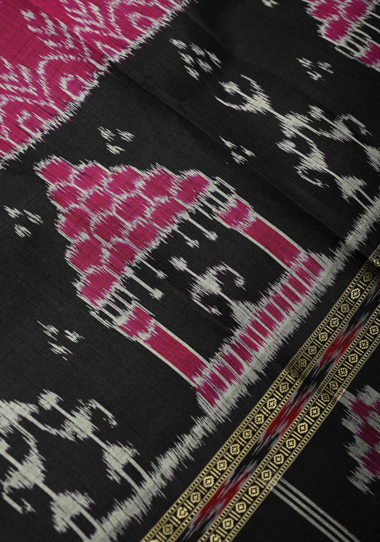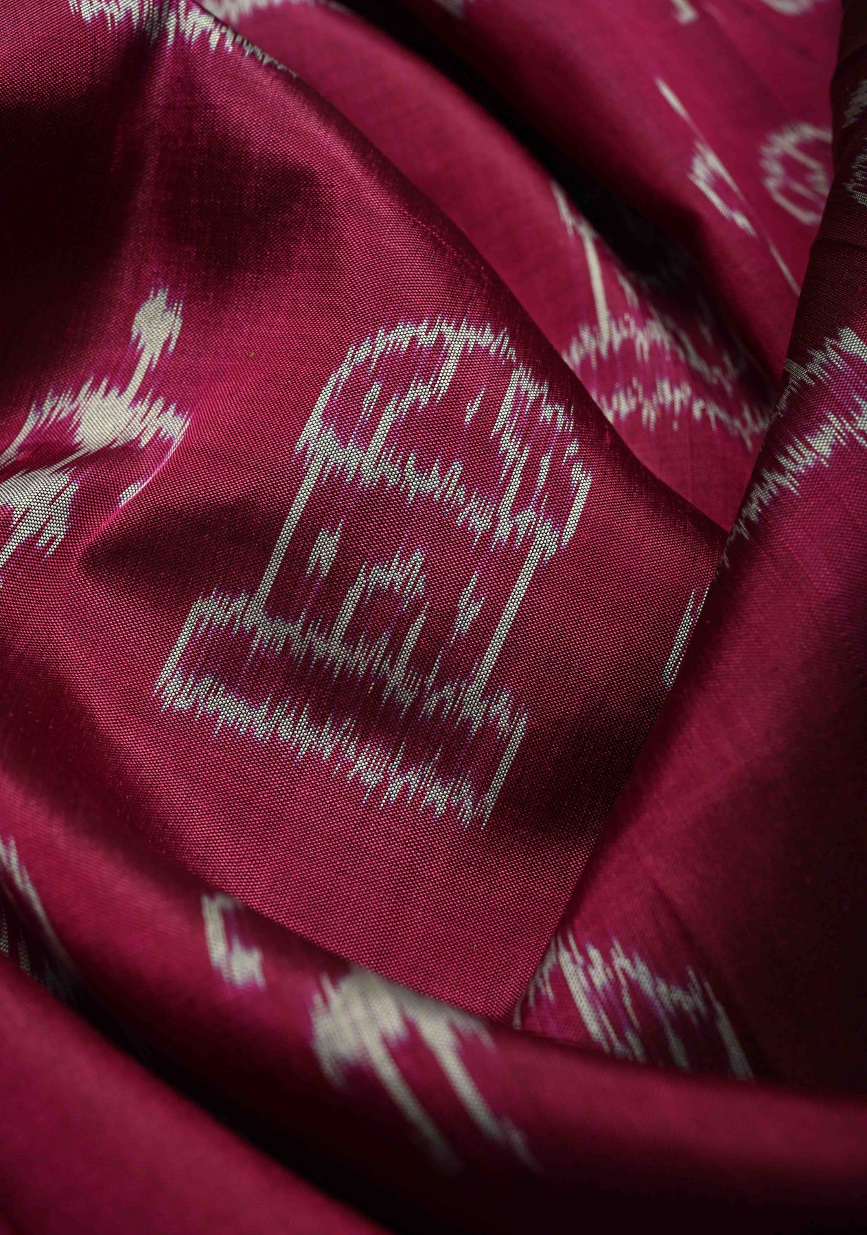 This Magenta Sambalpuri Ikkat Silk Saree with Dolabedi Border and Pallu is a vibrant celebration of Odisha’s rich weaving heritage. Handwoven from luxurious silk, it features the traditional Ikkat tie-and-dye technique that creates striking geometric patterns across the magenta body. The intricately designed Dolabedi border and pallu add a touch of elegance and cultural authenticity, enhancing the saree’s overall charm. Lightweight, comfortable, and gracefully draping, this saree is perfect for festive occasions, weddings, and cultural celebrations, making it a timeless addition to any ethnic wardrobe.