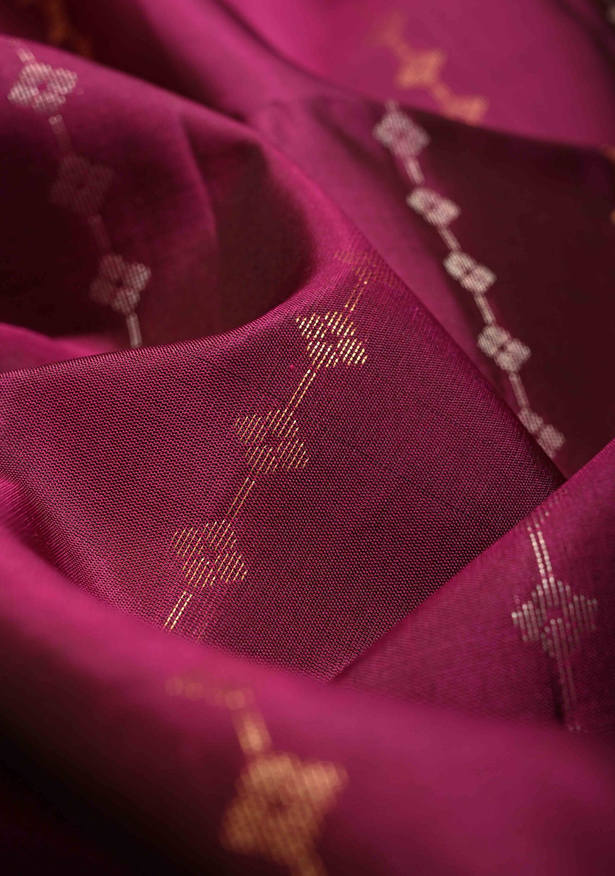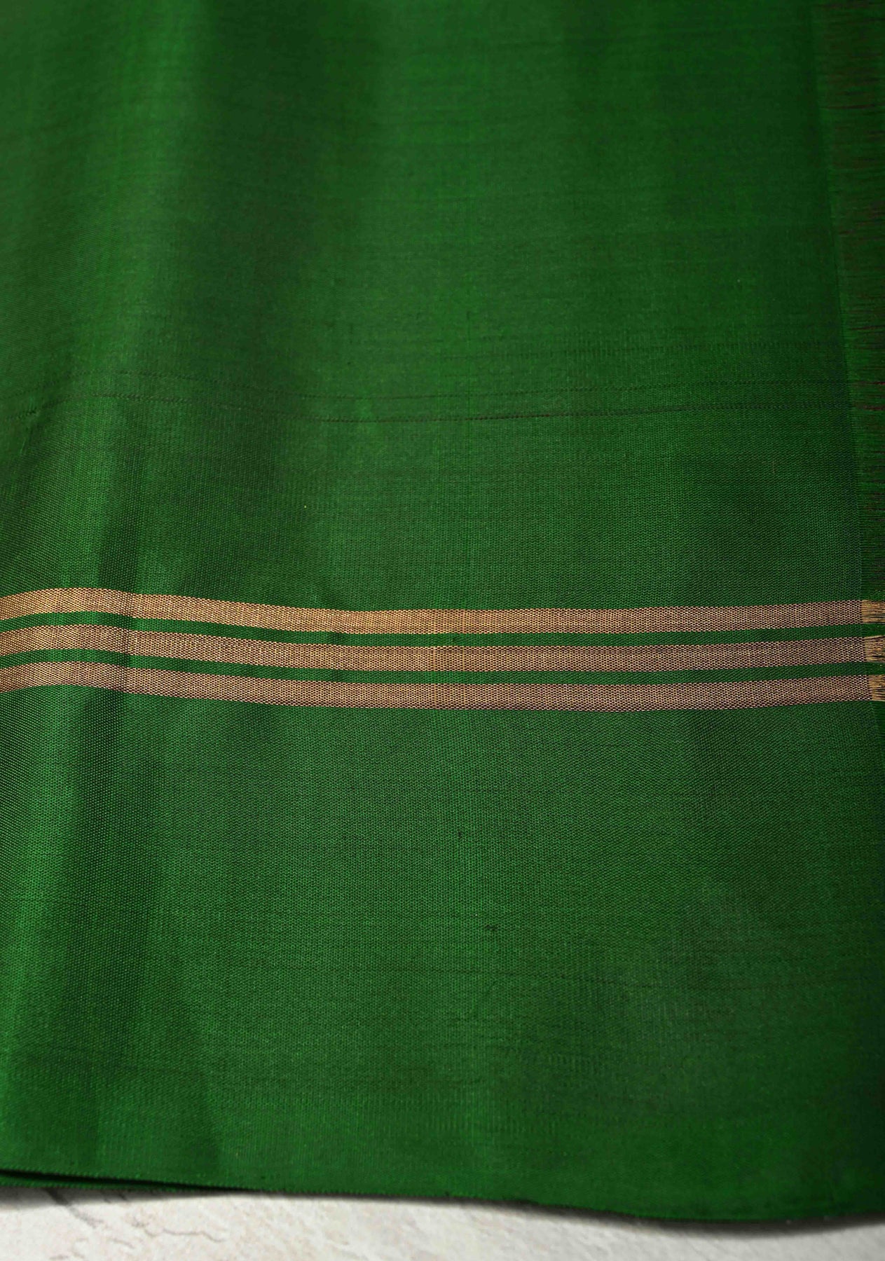 The graceful vadamalli purple dual tone body is highlighted with subtle gold-silver zari stripes, adding refined shimmer and sophistication. Enhancing the saree’s charm is a contrast bottle green border, which lends depth and a classic Kanjivaram finish. A perfect choice for those who appreciate traditional with contemporary elegance.