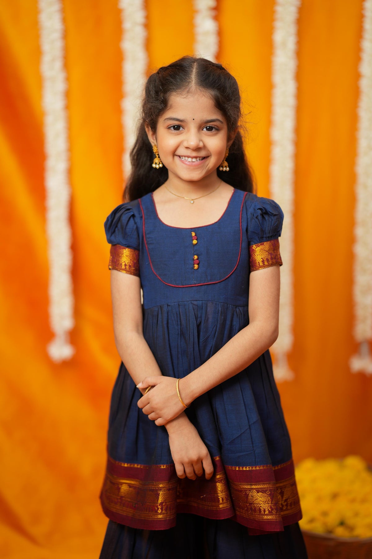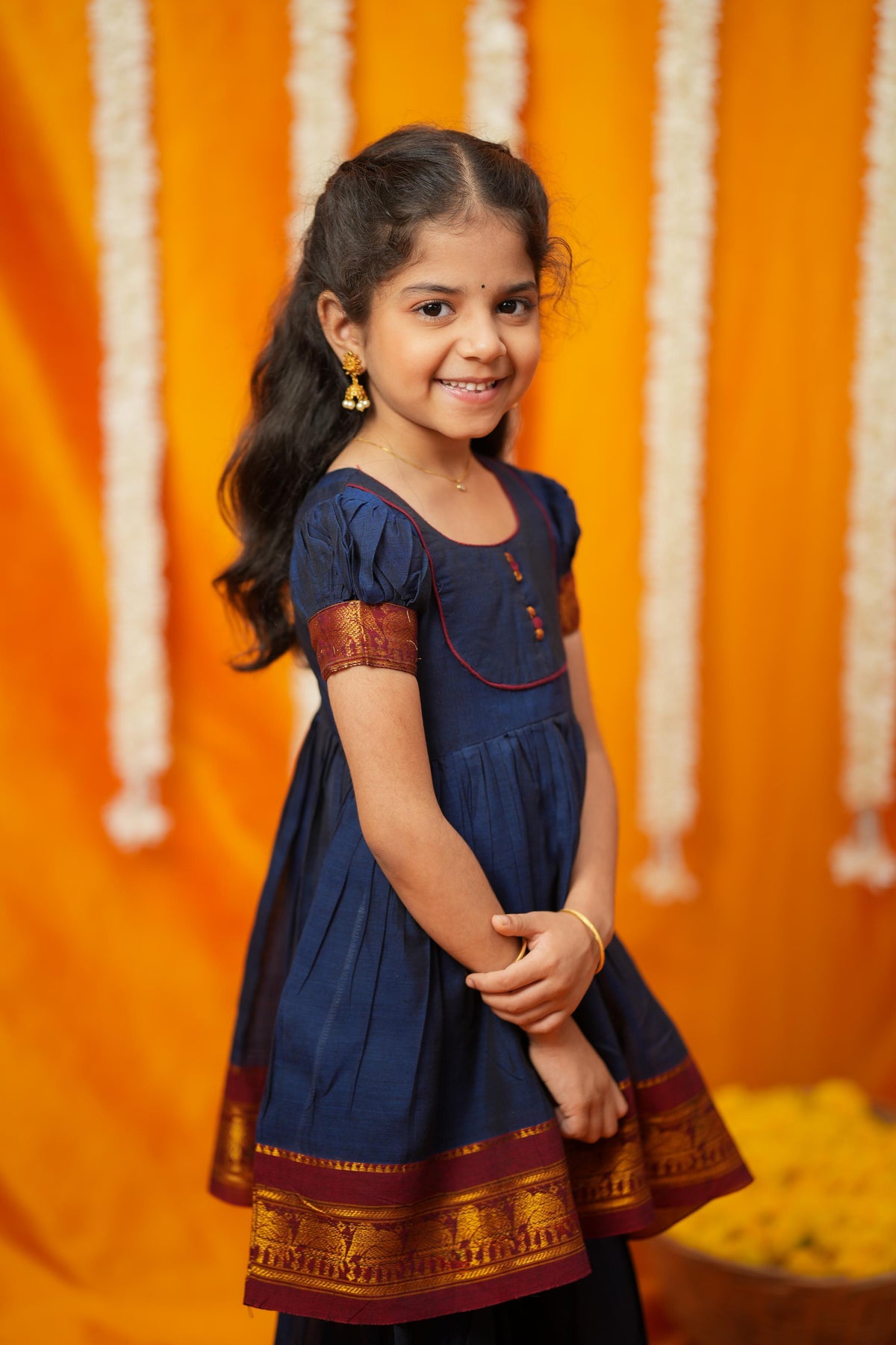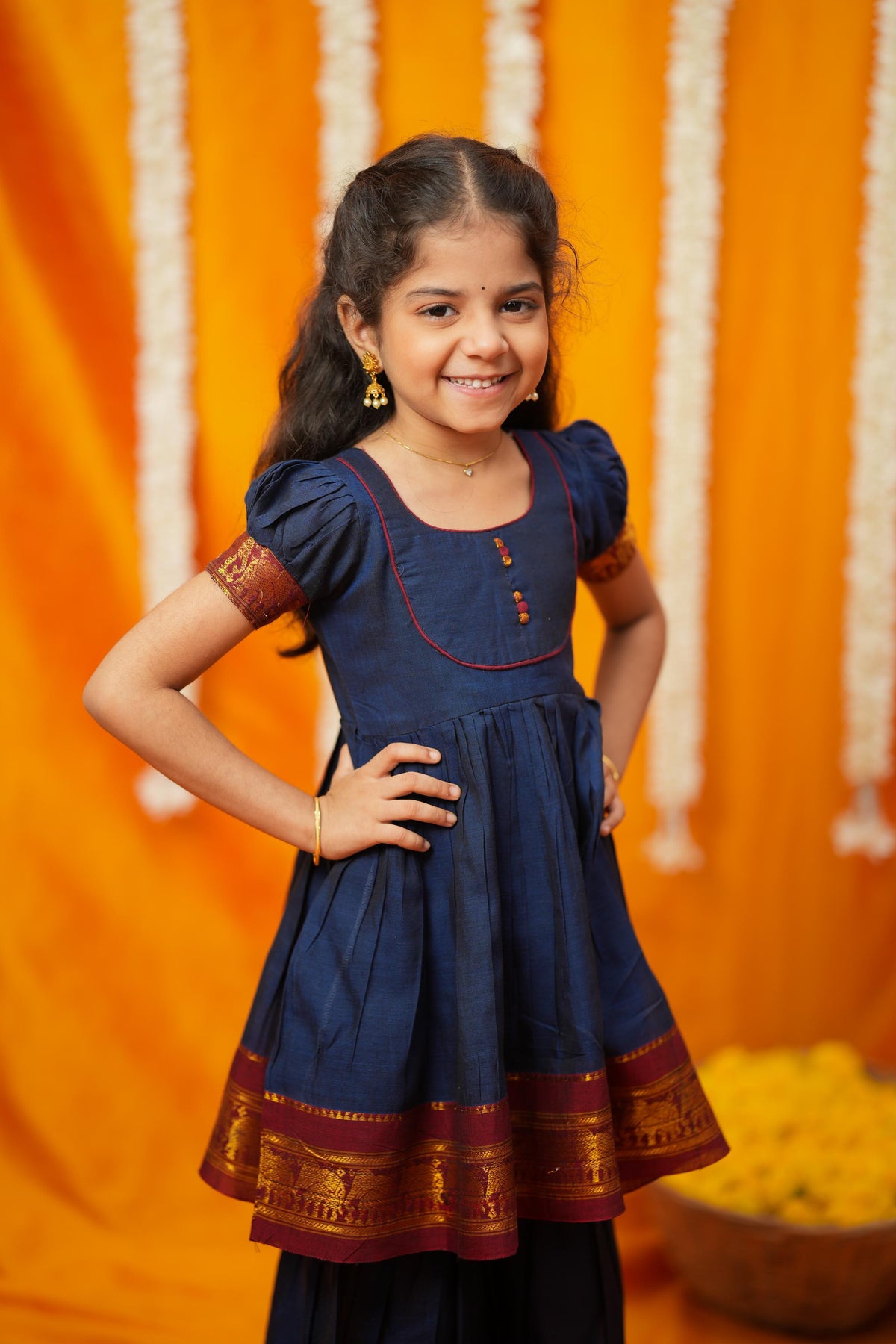 Let tradition wrap your little one in elegance with the Ezhili Navy Handloom Mini Co-Ord Set. Woven from pure Narayanpet cotton and designed in rich navy with temple-style zari accents, this outfit is a heartfelt ode to heritage. With a flowy empire-cut top and roomy sharara, it offers graceful charm with play-ready comfort—perfect for school functions, temple visits, or dancing through festive days.