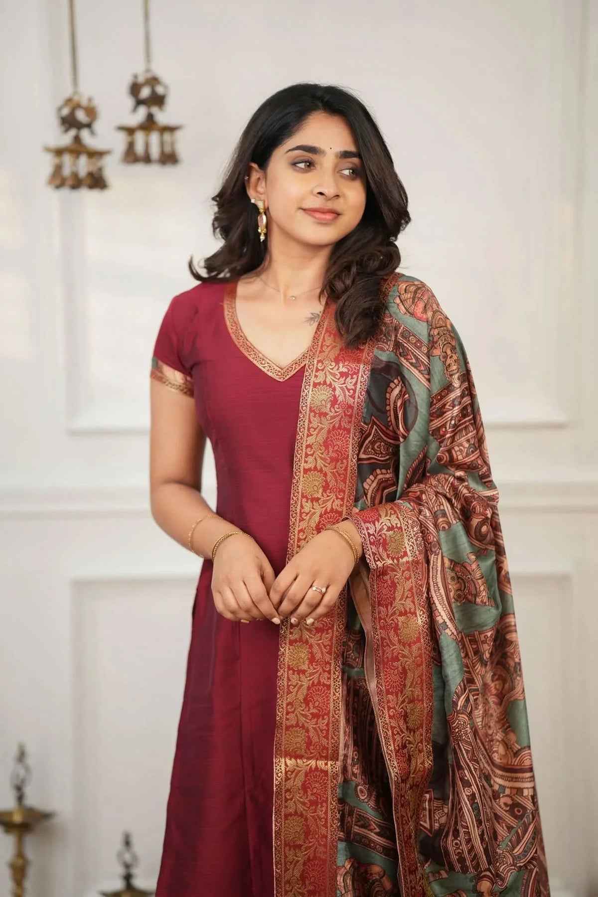 The Indra Maroon Kurti Set exudes timeless festive elegance with its Chanderi slub kurti paired with a grand Dola silk dupatta featuring a Banarasi border. Designed in a slim straight silhouette with a curve V-neckline and short sleeves, the outfit balances minimal kurti styling with the richness of a zari-woven dupatta. Perfect for weddings, Diwali, and cultural celebrations, Indra blends understated sophistication with festive grandeur."