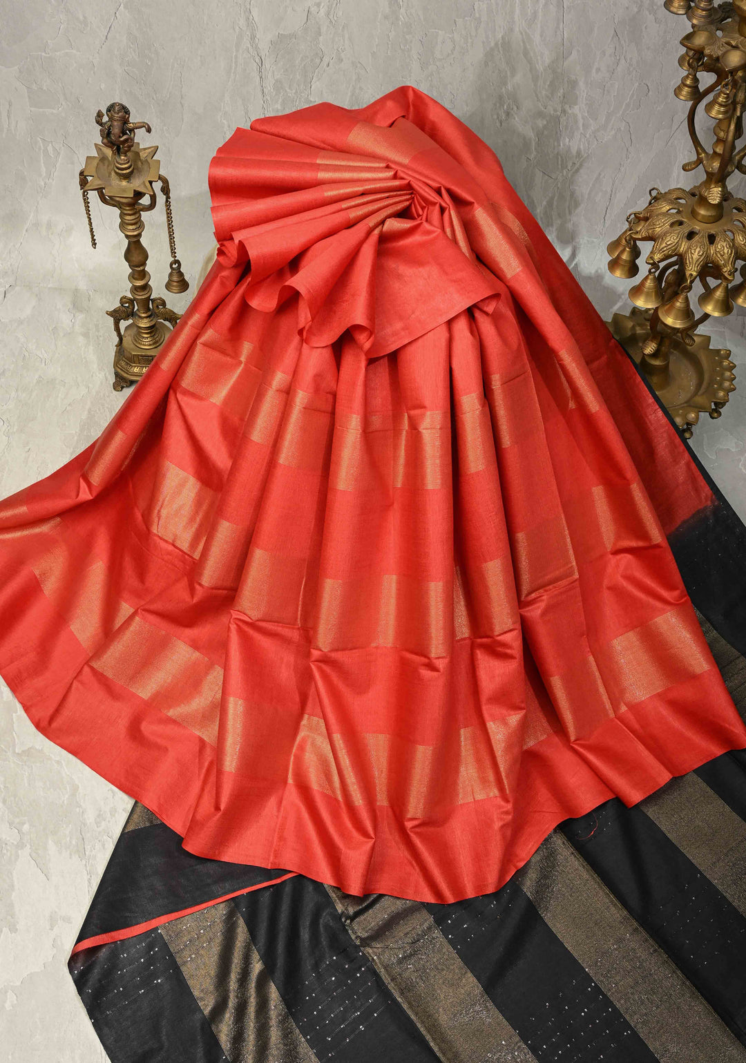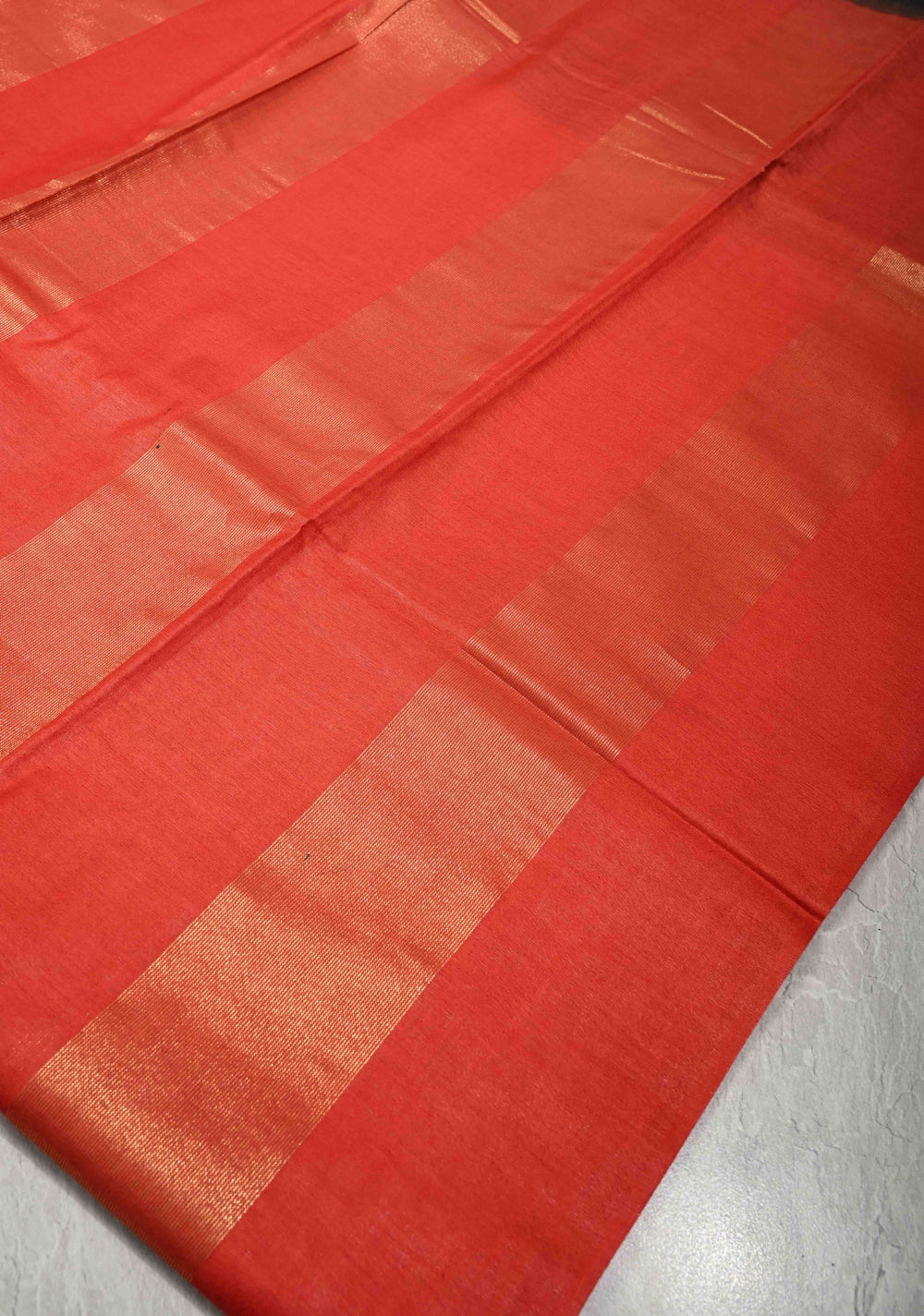 Red Orange Semi Tussar Saree with Thread Stripes and Tepmle Zari Border