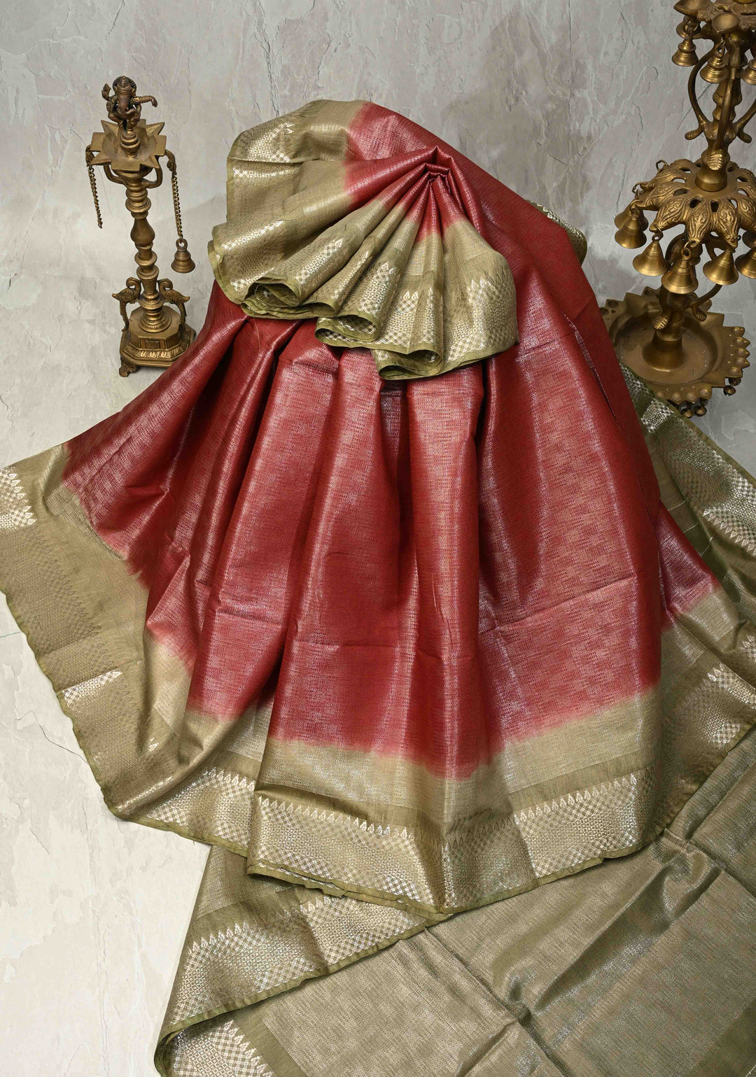 Red Semi Tussar Tissue Saree with Temple Silver Zari Border