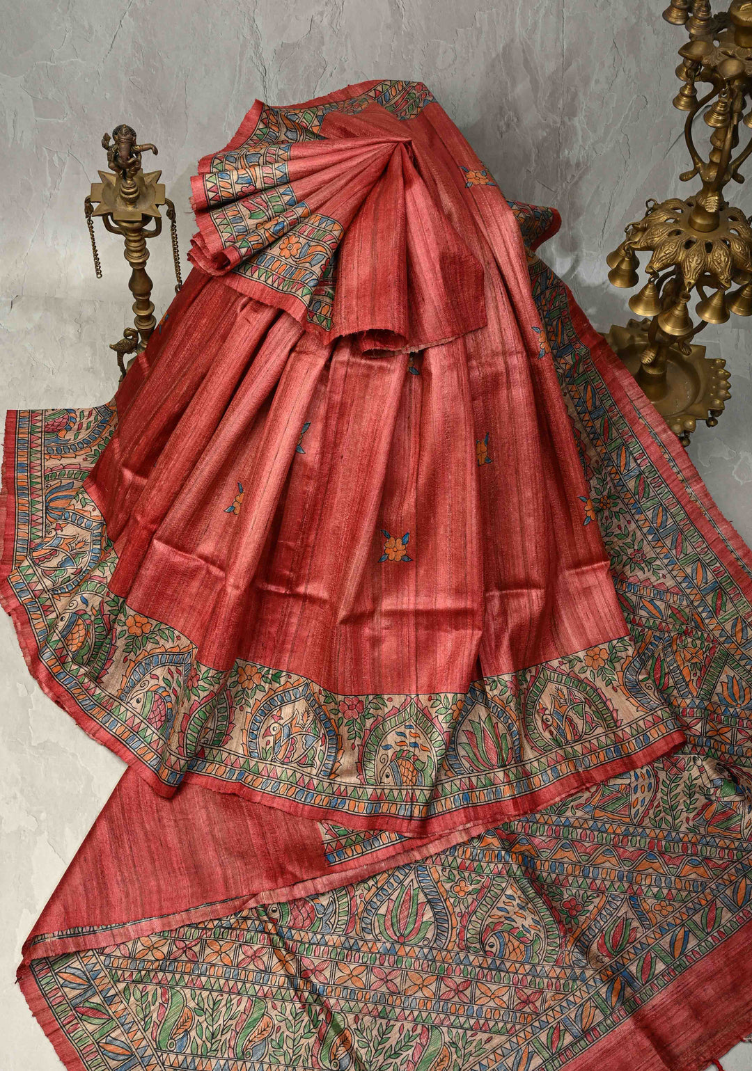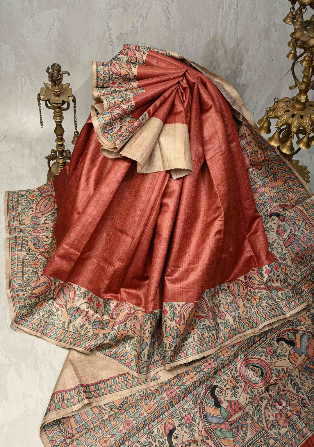 Brick Red Madhurima Madhubani hand painting on Tussar Silk Saree | SILK MARK CERTIFIED