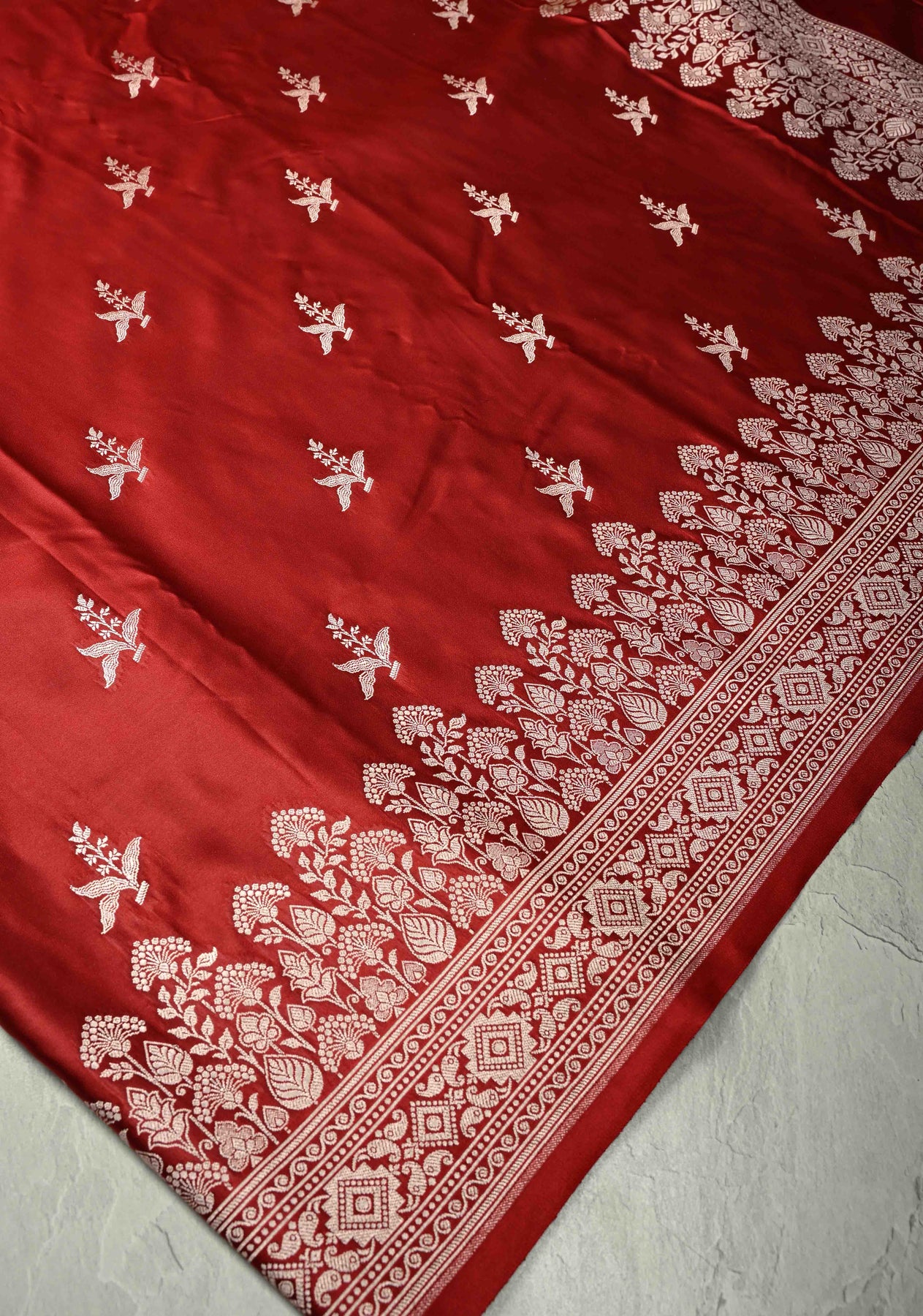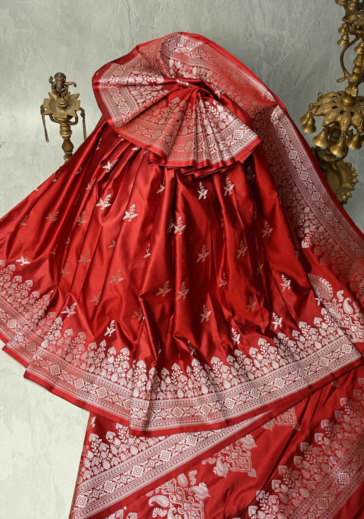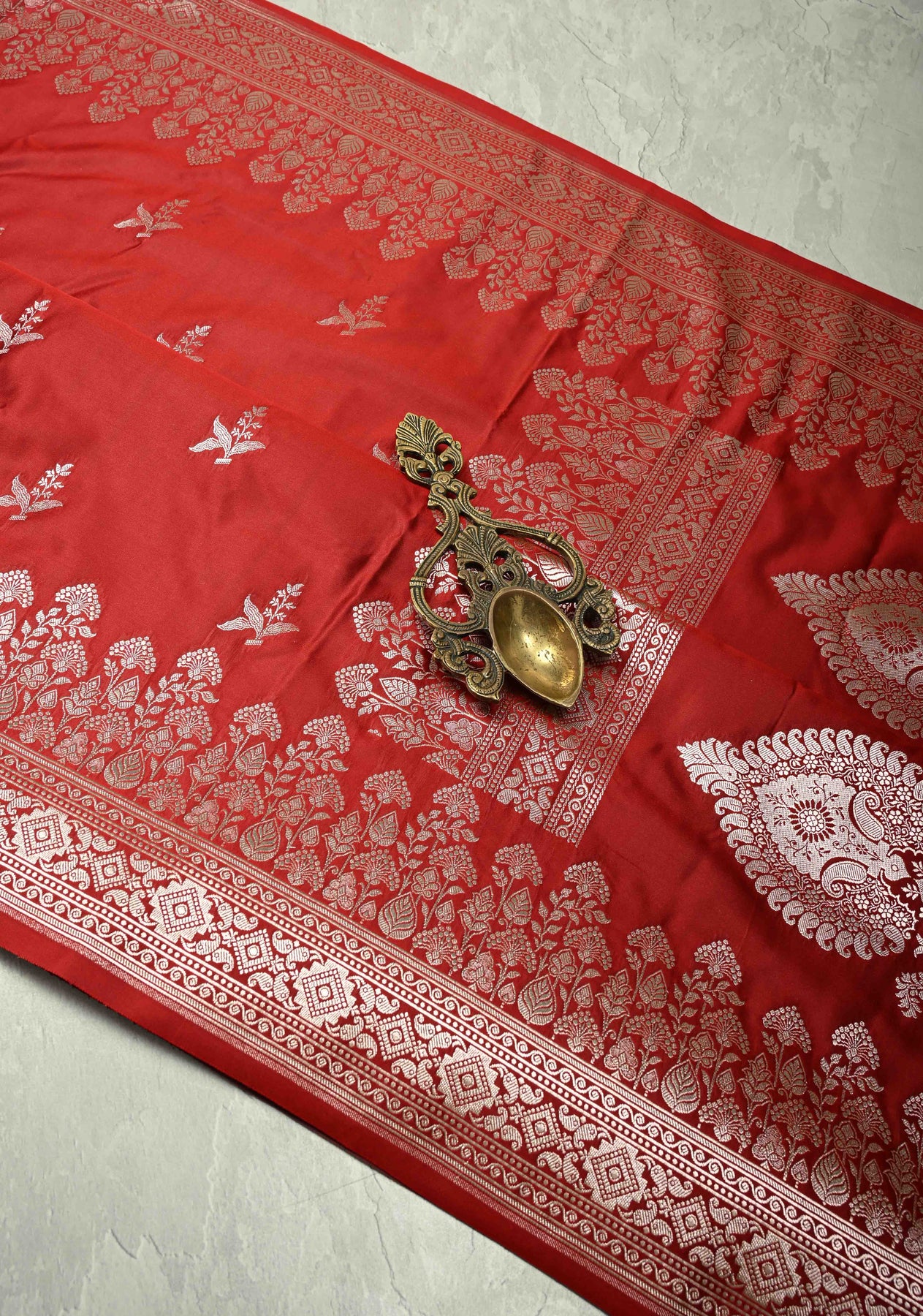 This blood red Banarasi semi Mashru silk saree is a captivating blend of richness, tradition, and refined craftsmanship. The luxurious semi Mashru silk drapes beautifully, offering a smooth, lustrous finish that enhances its regal appeal. Scattered across the body are intricate zari buttas, adding a touch of golden brilliance that contrasts strikingly with the deep red hue. Complementing the saree’s opulent design is a beautifully woven floral zari border, lending grace and timeless elegance to the overall look. Perfect for weddings, festive celebrations, and grand occasions, this saree embodies heritage luxury and makes an unforgettable statement