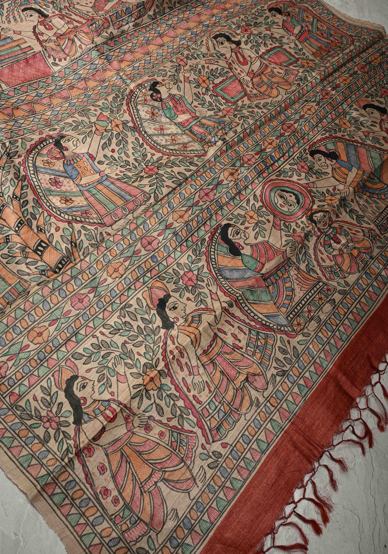 Brick Red Madhurima Madhubani hand painting on Tussar Silk Saree | SILK MARK CERTIFIED