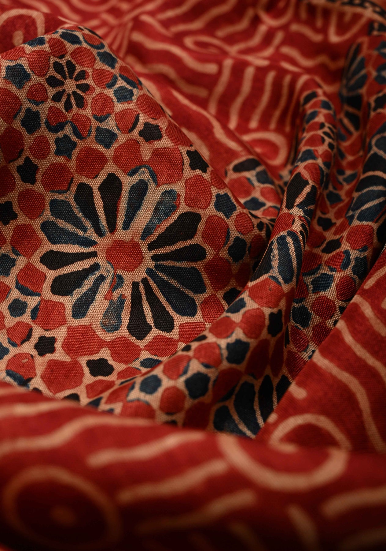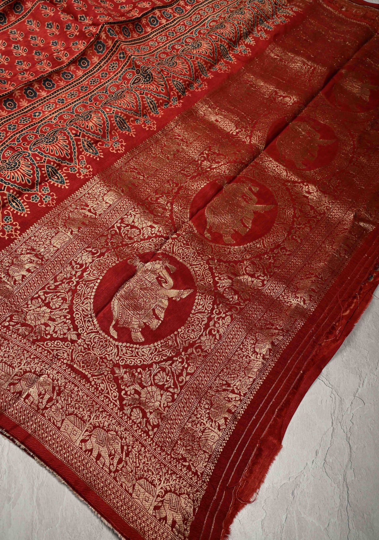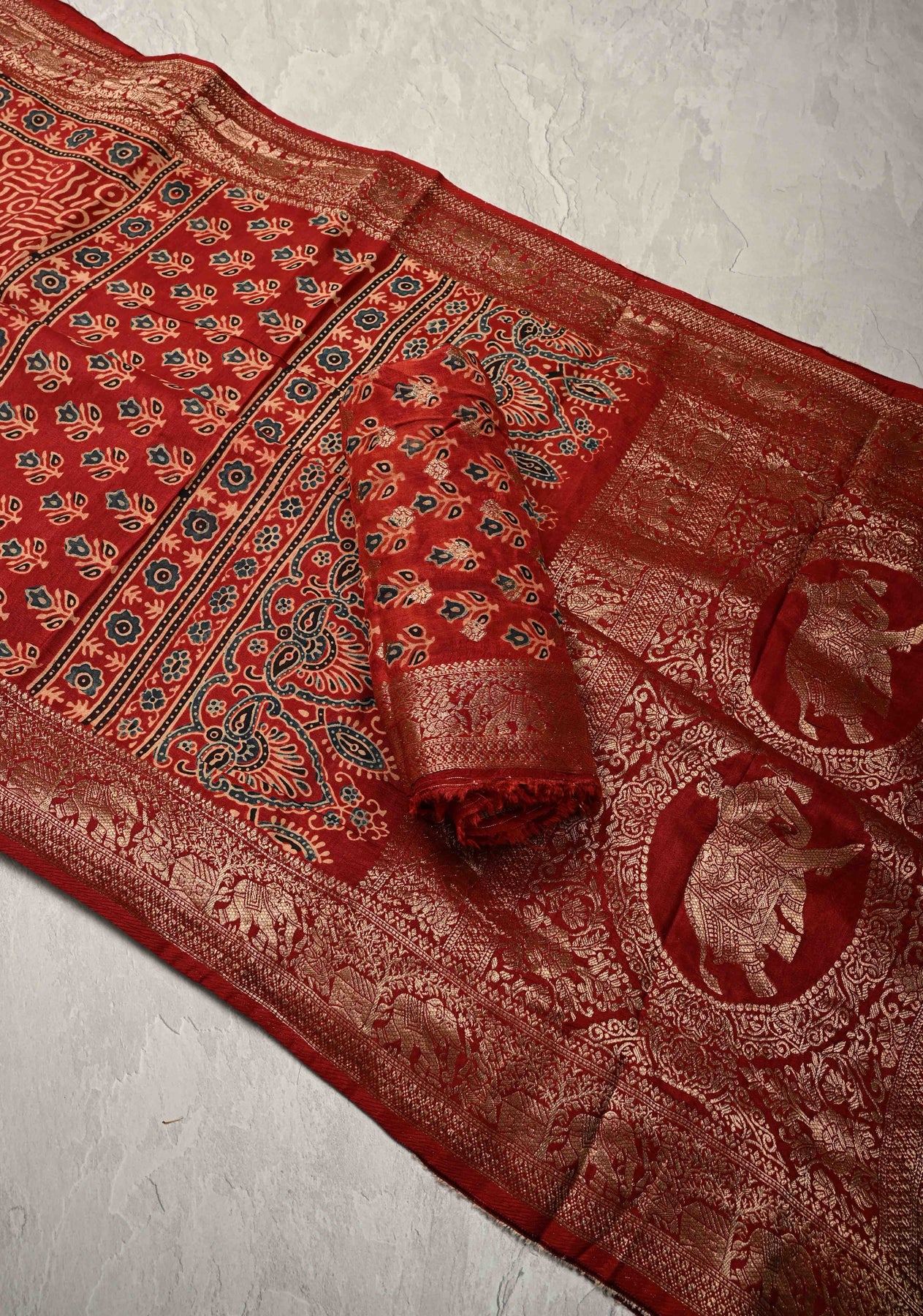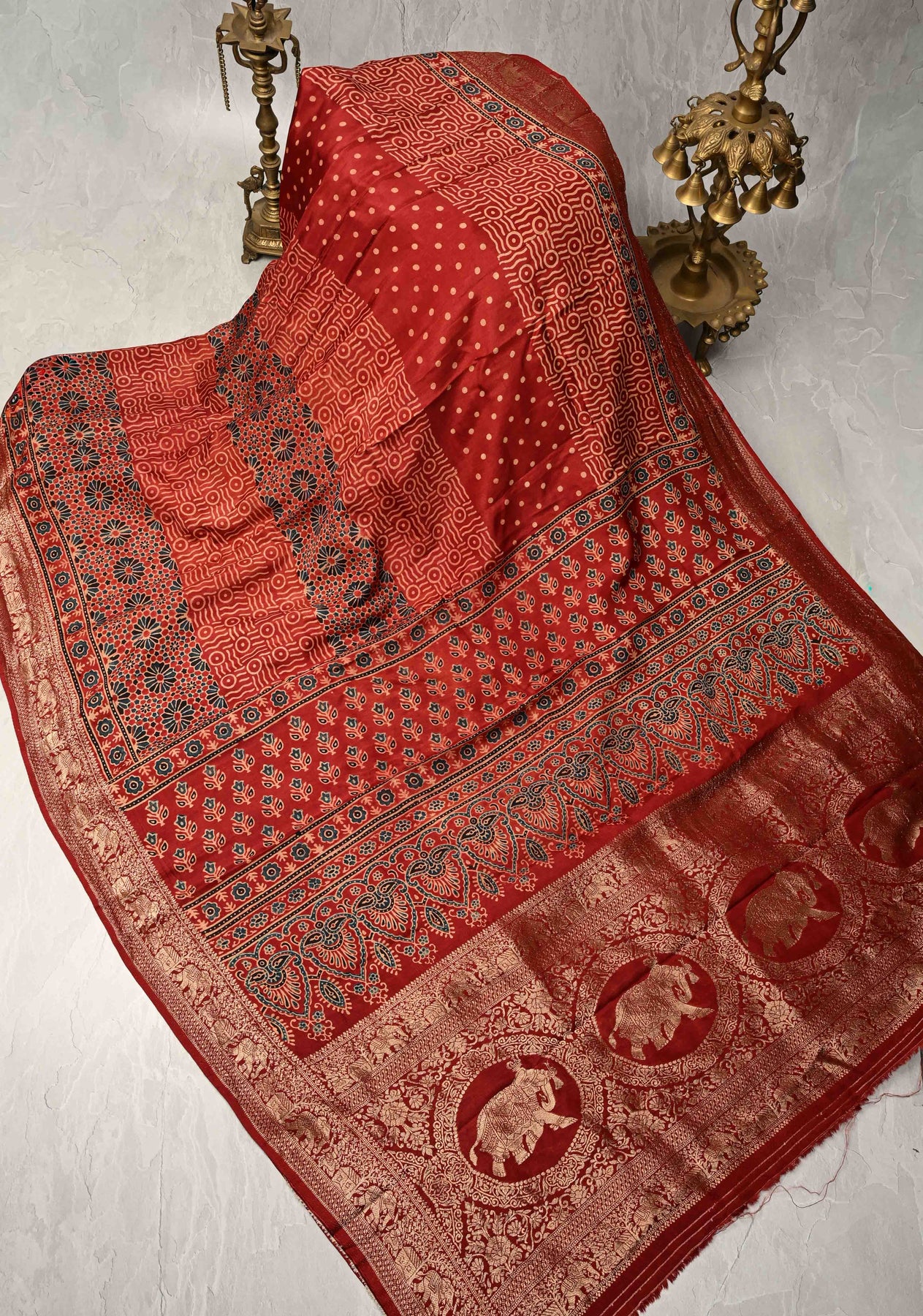 Deep Red Ajrakh Hand Block Print on Dola Silk Saree with Fancy Zari Border