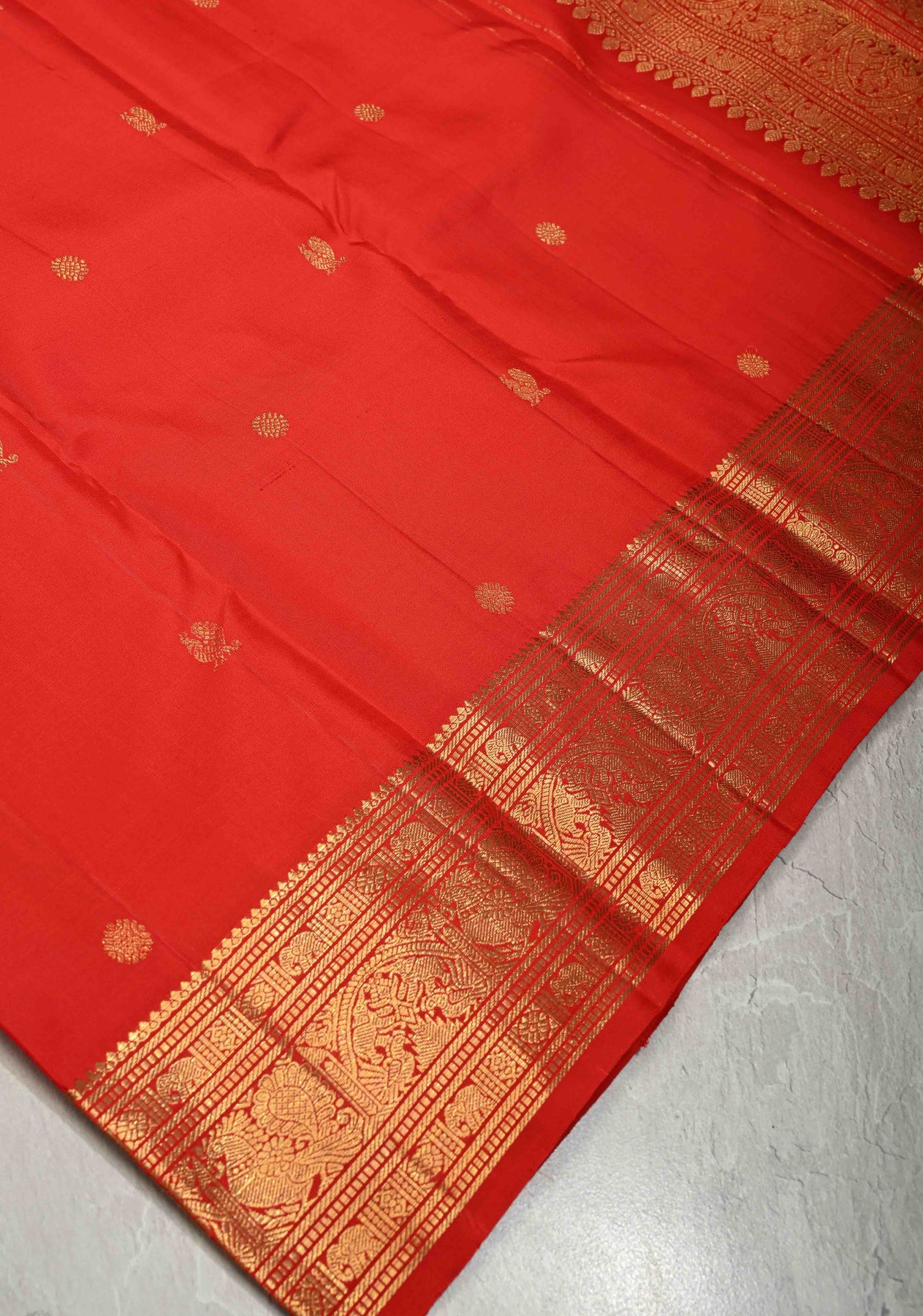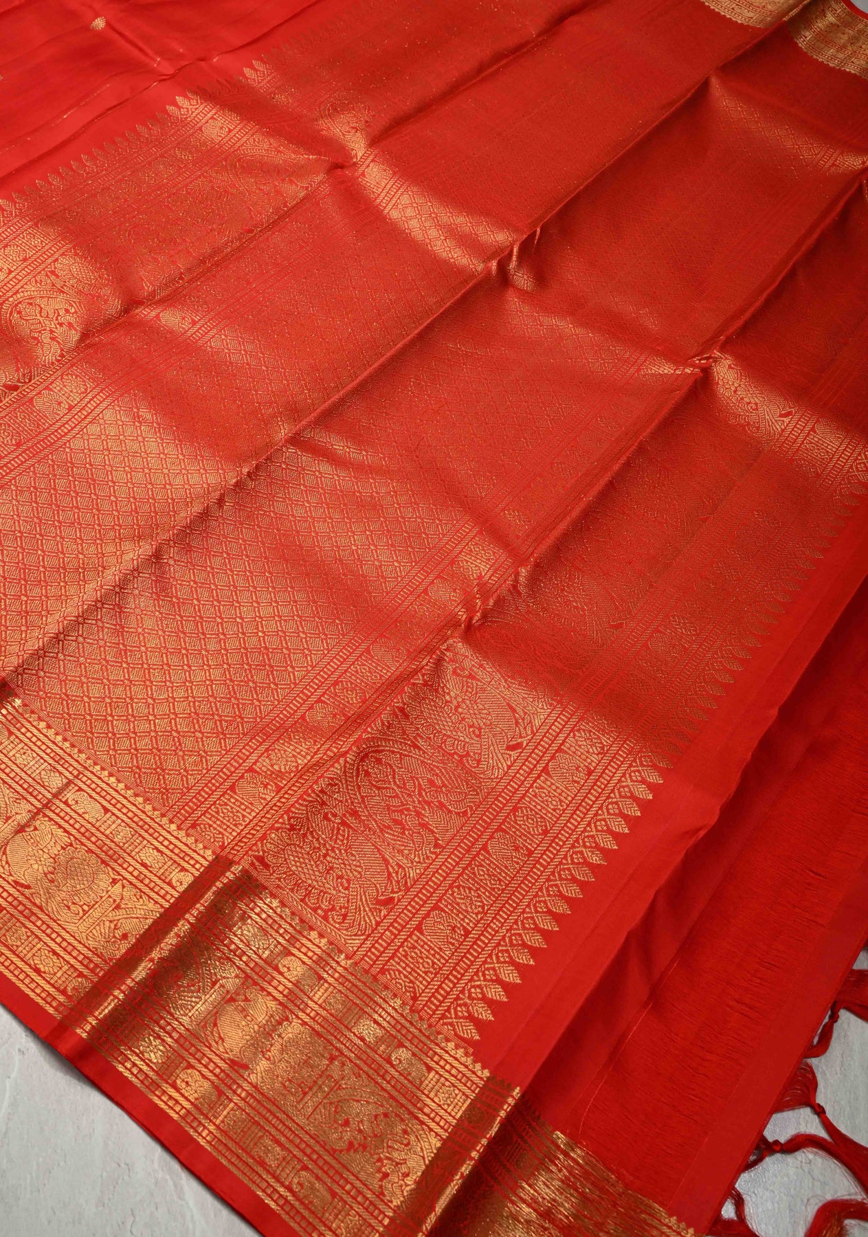The Vermilion Red Pure Kanjivaram Silk Saree is a magnificent blend of tradition and artistry, crafted to reflect timeless South Indian elegance. Woven from pure Kanjivaram silk, this saree showcases a Vermilion red hue that exudes vibrance and grandeur. The body is adorned with intricately woven zari buttas and graceful peacock motifs, symbolizing beauty and prosperity, adding a regal charm to the ensemble. Complemented by a richly detailed zari border, the saree glows with a luxurious sheen and impeccable craftsmanship. Its smooth texture and majestic drape make it a perfect choice for weddings, festive celebrations, and special occasions where heritage style and sophistication are truly celebrated.