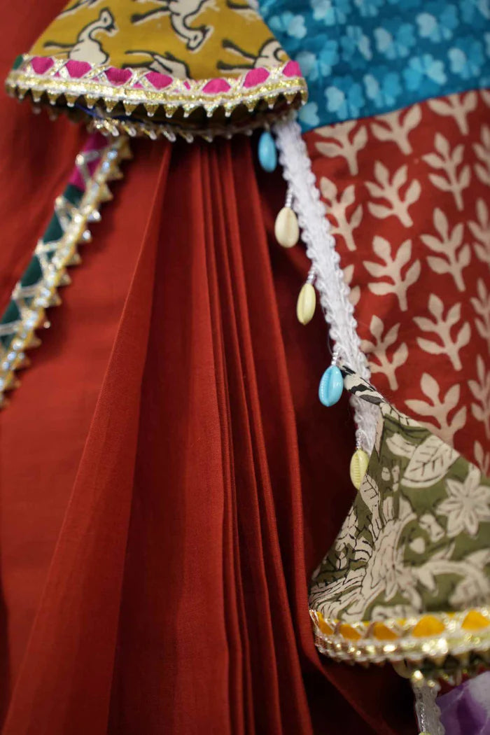The Designer Red Vibrant Patch Work Pure Cotton Ready-to-Wear Saree is a perfect blend of traditional craftsmanship and modern style. Made from soft, breathable pure cotton, this saree features colorful patchwork detailing that adds vibrancy and charm. The pallu is enhanced with stylish tassels, giving it a playful yet elegant touch. Designed for effortless draping, this ready-to-wear saree ensures comfort, a flawless silhouette, and a striking ethnic look. Ideal for casual gatherings, festive occasions, and cultural events, it brings a lively and contemporary twist to traditional attire.