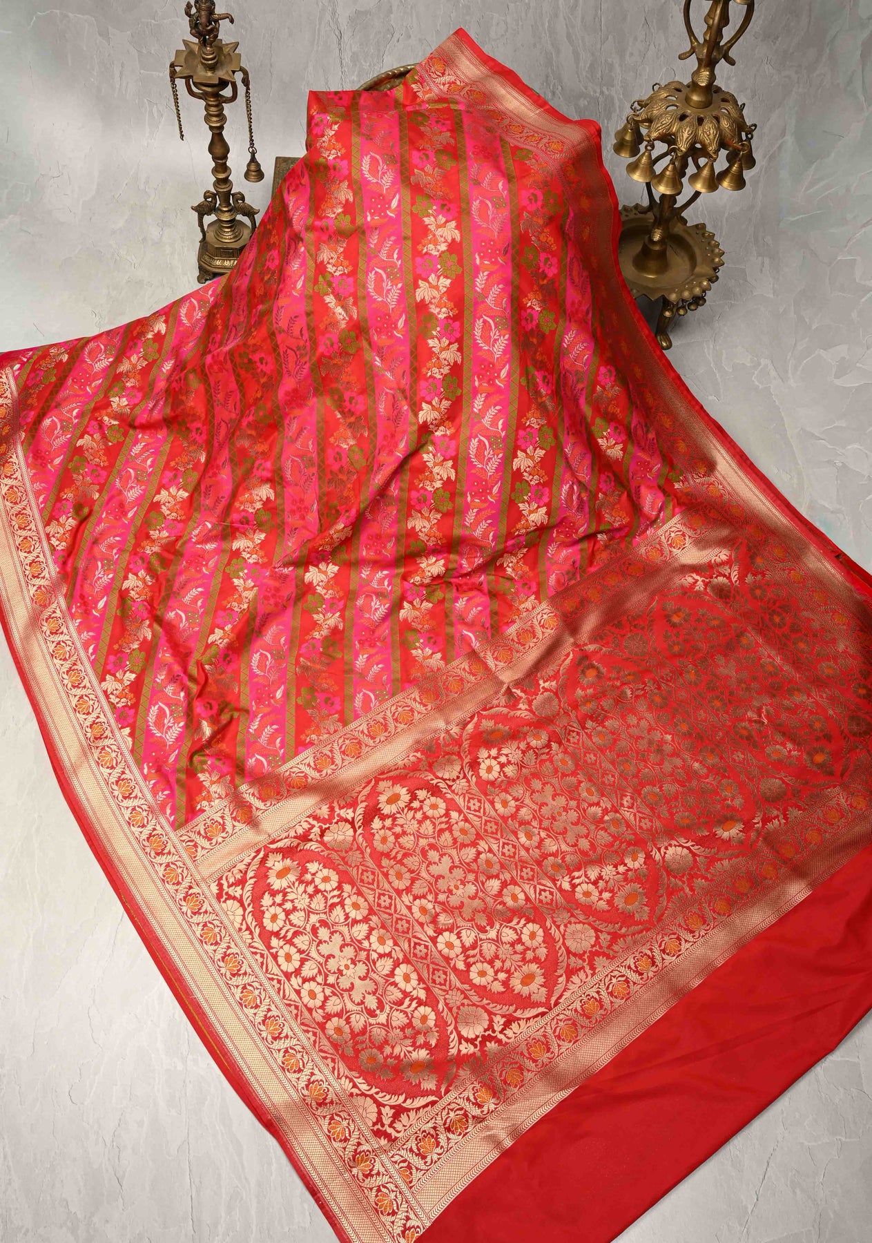 Vibrant and eye-catching, this Red-Pink Semi-Silk Saree showcases the timeless beauty of Rangkaat style weaving. The body features striking Meenakari diagonal stripes that blend traditional craftsmanship with a bold, modern aesthetic. Crafted from soft semi-silk, the saree offers a graceful drape and luxurious feel. Accentuated with a rich zari border, it adds the perfect touch of opulence, making it ideal for weddings, festive occasions, and cultural events. This saree is a true celebration of color, texture, and tradition.